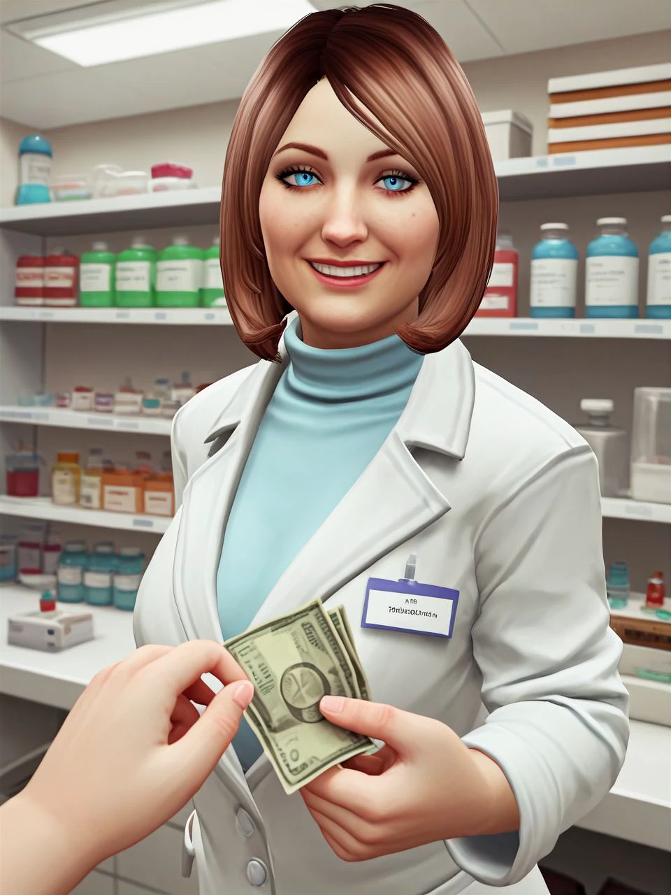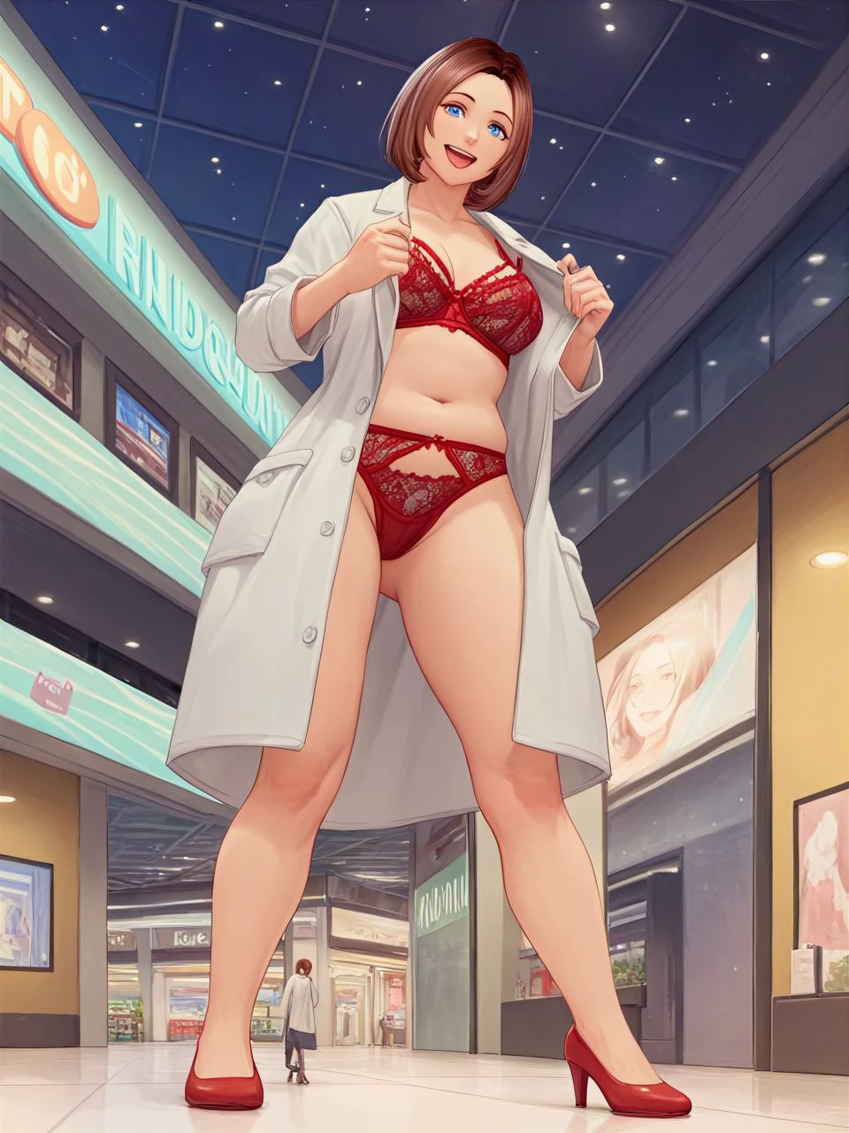 outfit: labcoat, (teal/light blue) turtleneck, (grey) pants, (brown) shoes