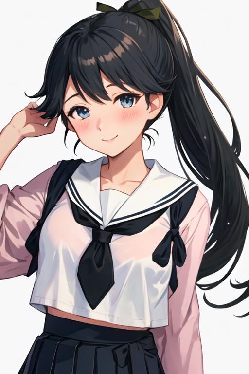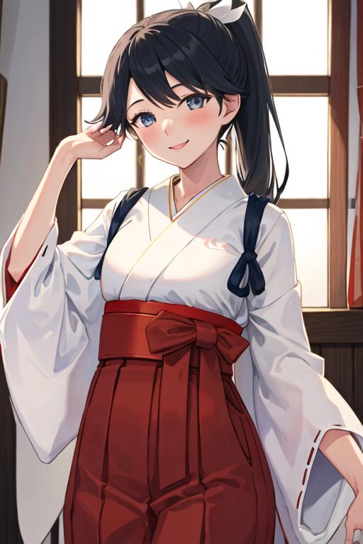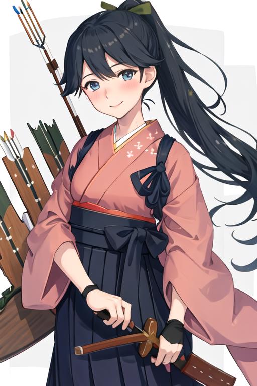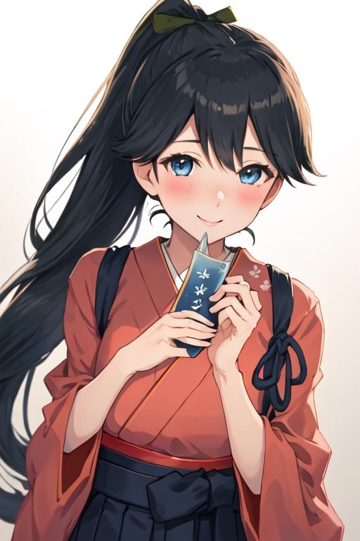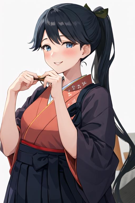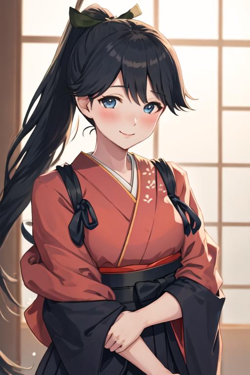 The trigger word is houshou_kantaicollection, and the recommended tags are best quality, masterpiece, highres, solo, {houshou_kantaicollection:1.15}, black_hair, long_hair, ponytail, smile, tasuki, blush, blue_eyes.