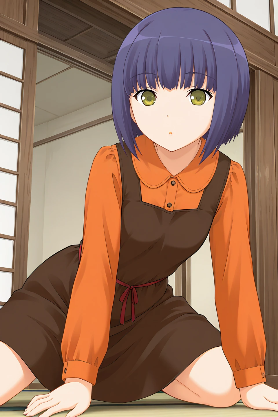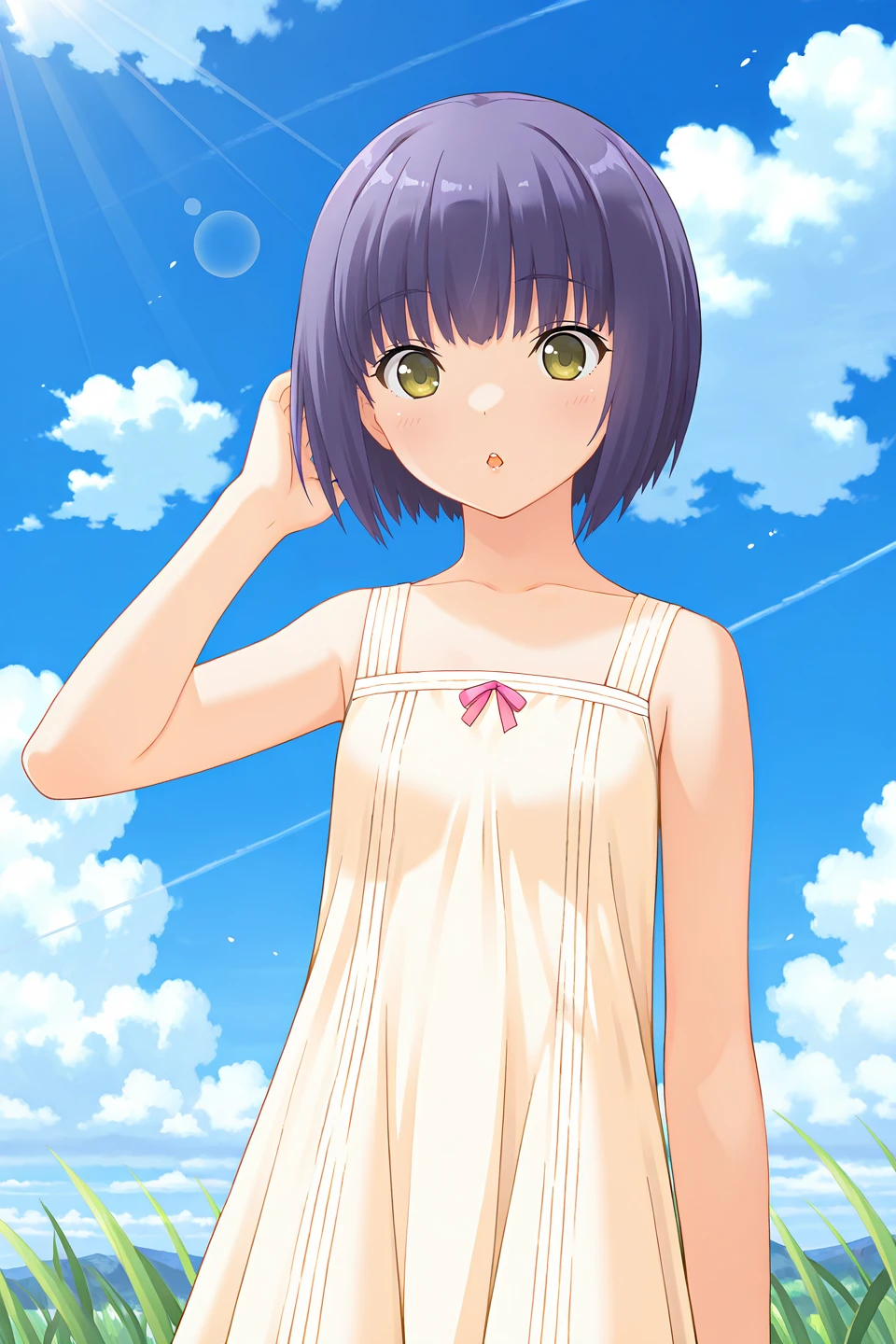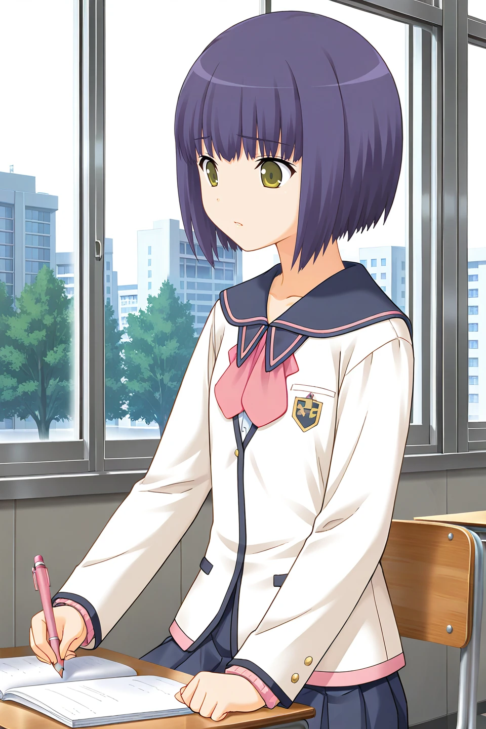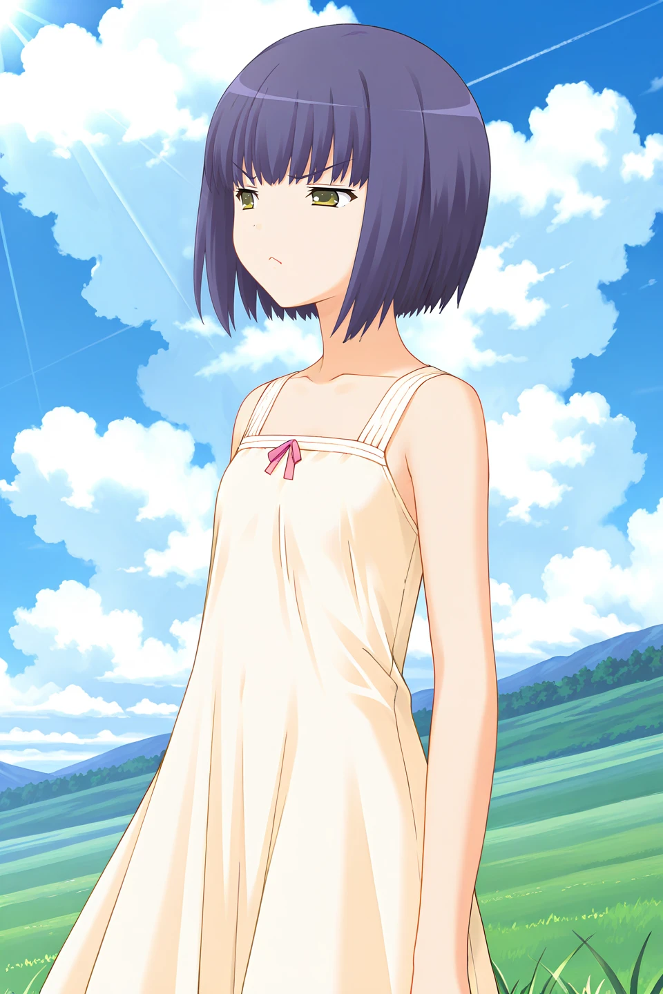 fujimura shizu,green eyes,yellow eyes,purple hair,short hair,blunt bangs,bob cut,petite,