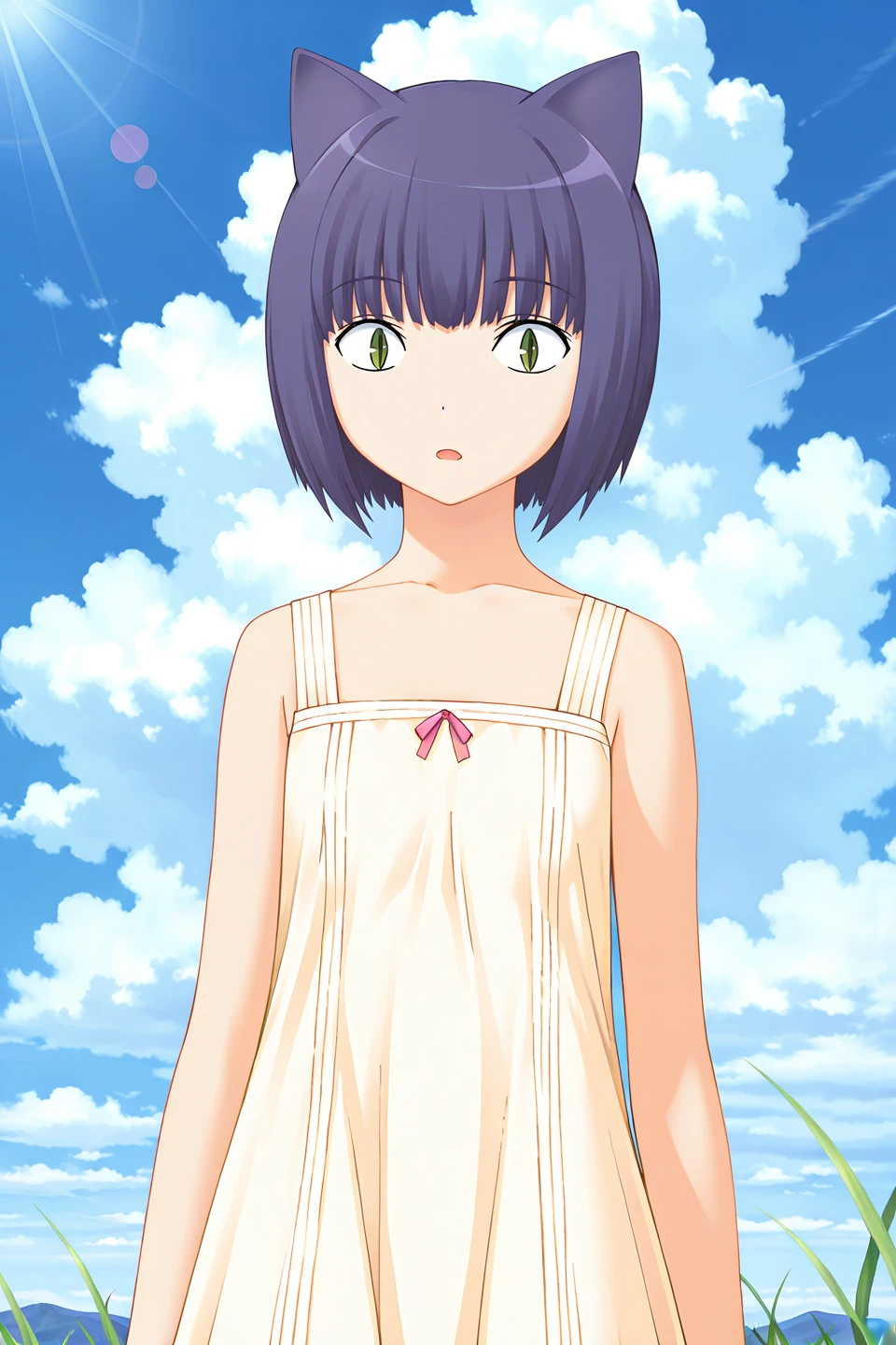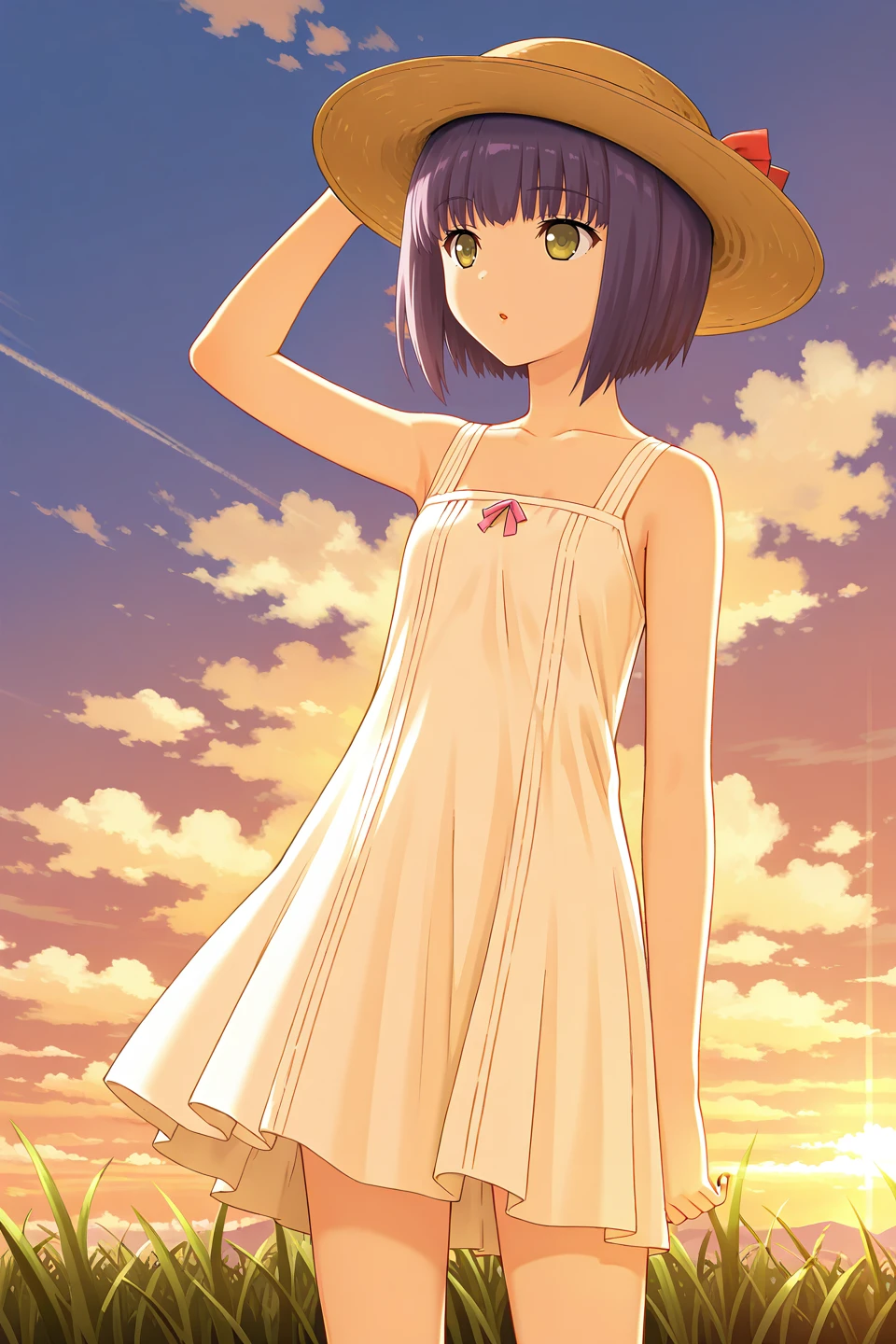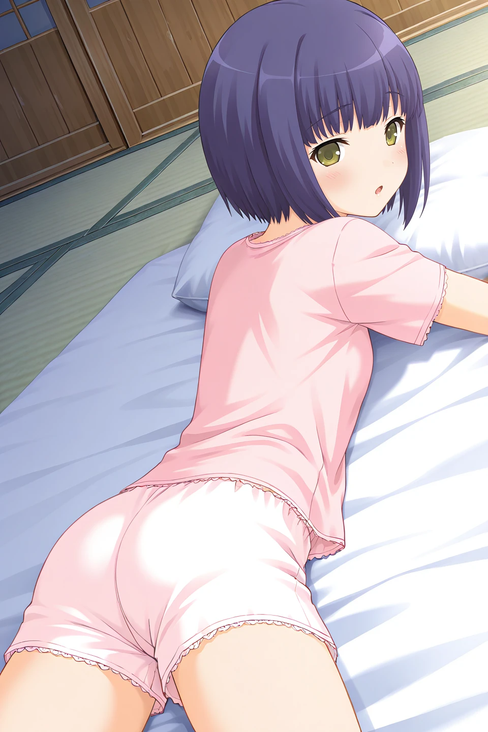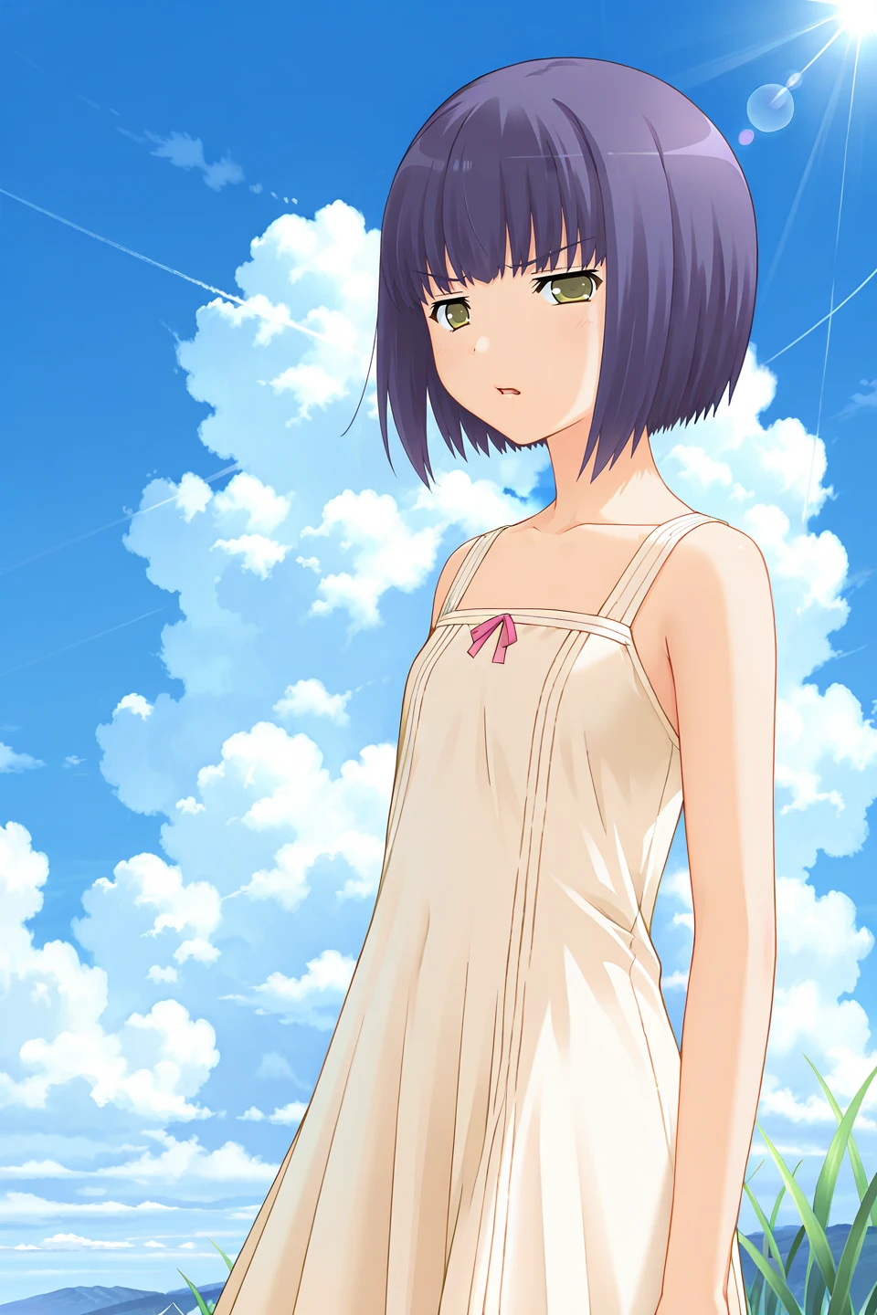 fujimura shizu,green eyes,yellow eyes,purple hair,short hair,blunt bangs,bob cut,petite,