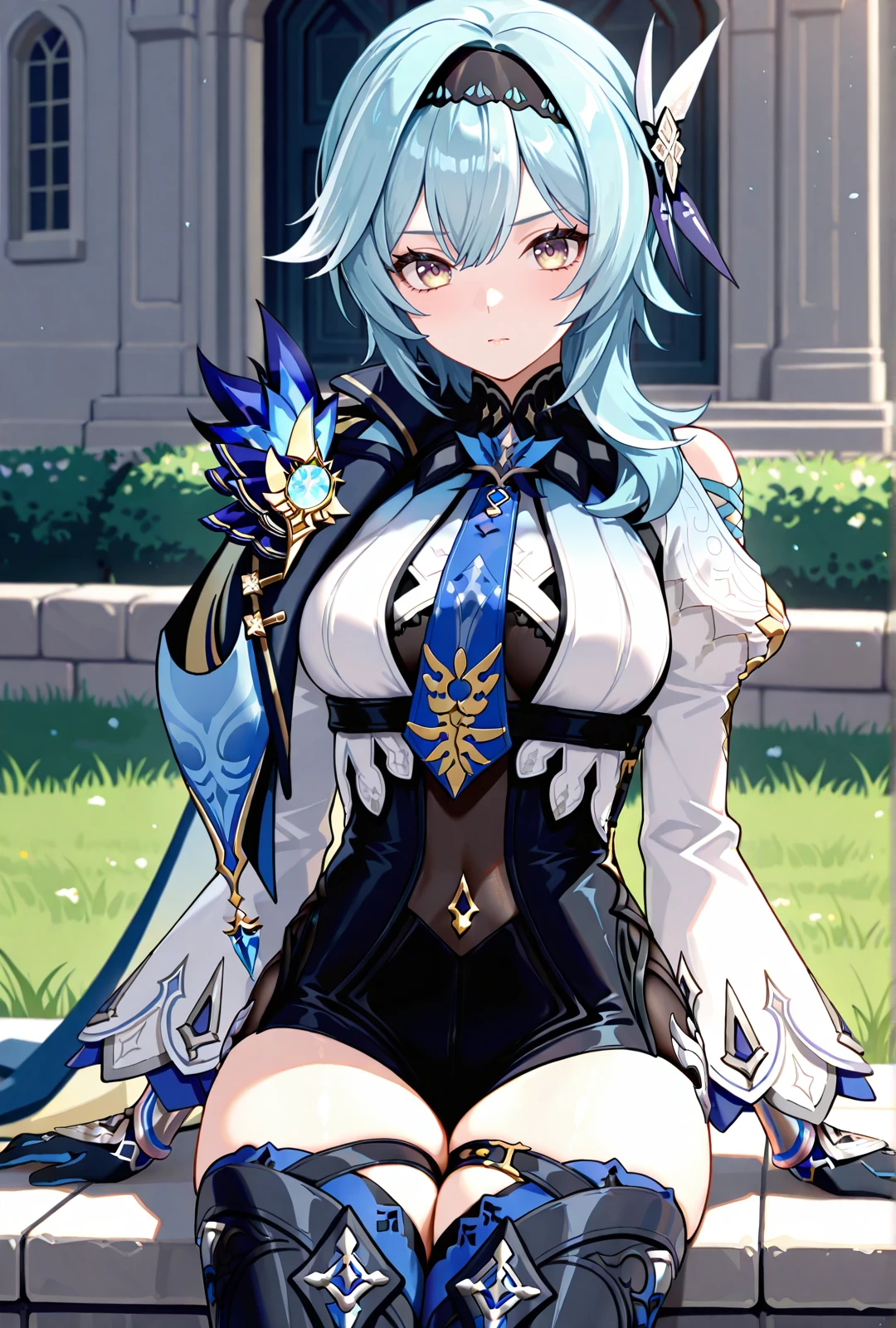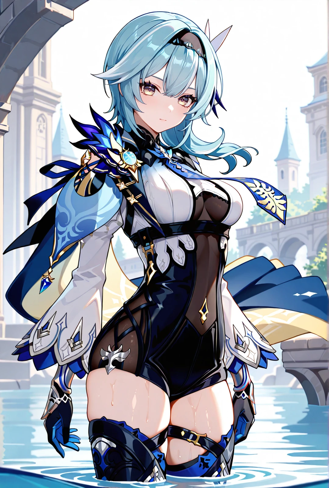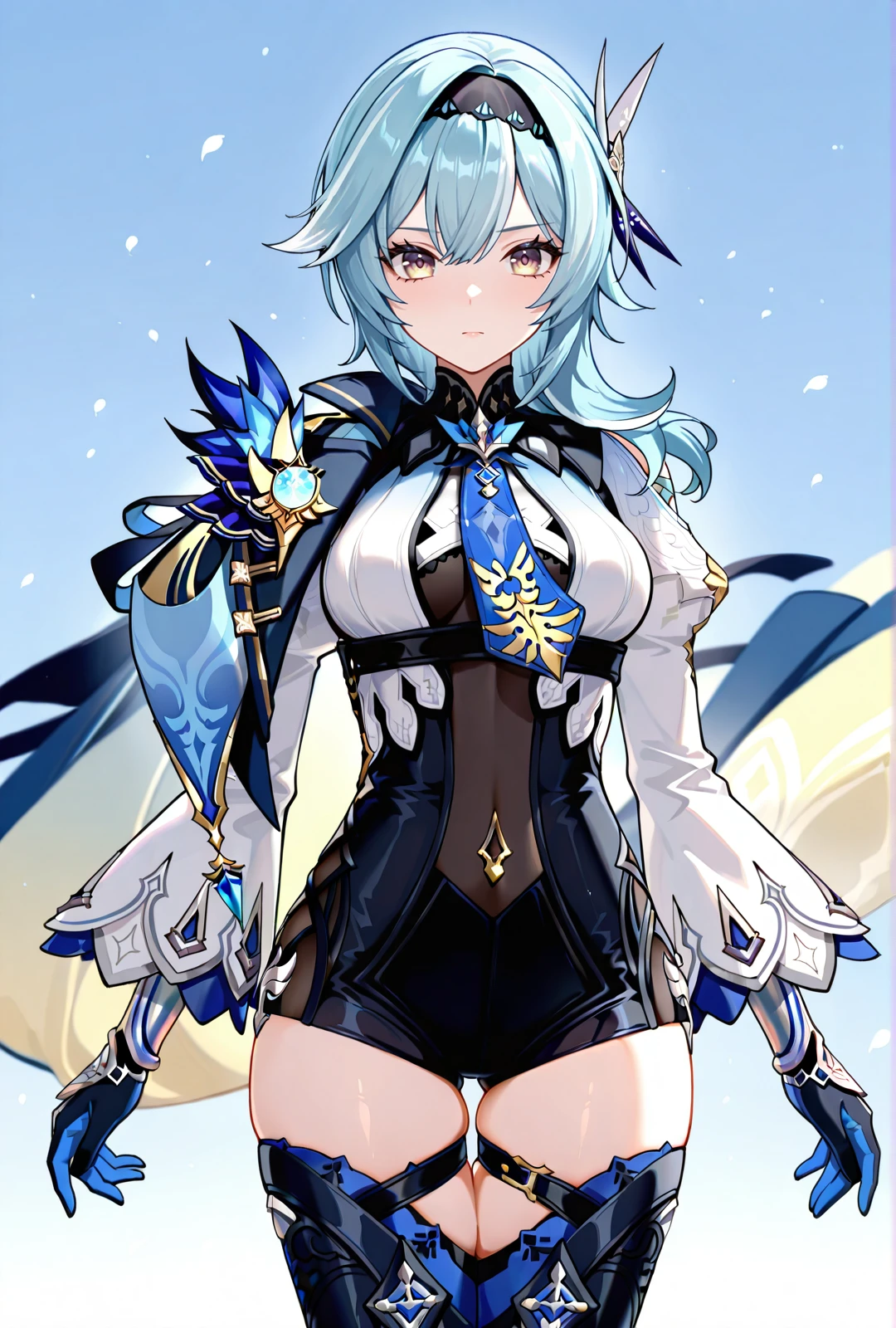 eula, 1girl, blue hair, medium hair, medium breasts, yellow eyes, white dress, cape, thighhighs, boots
