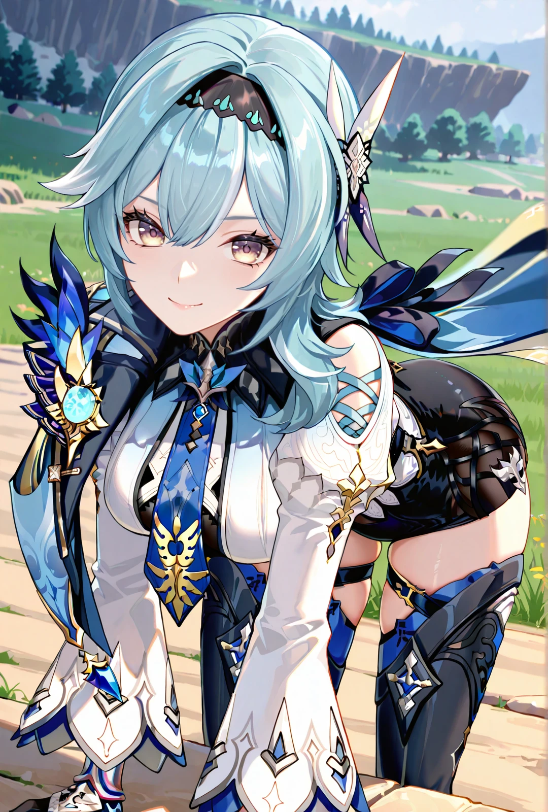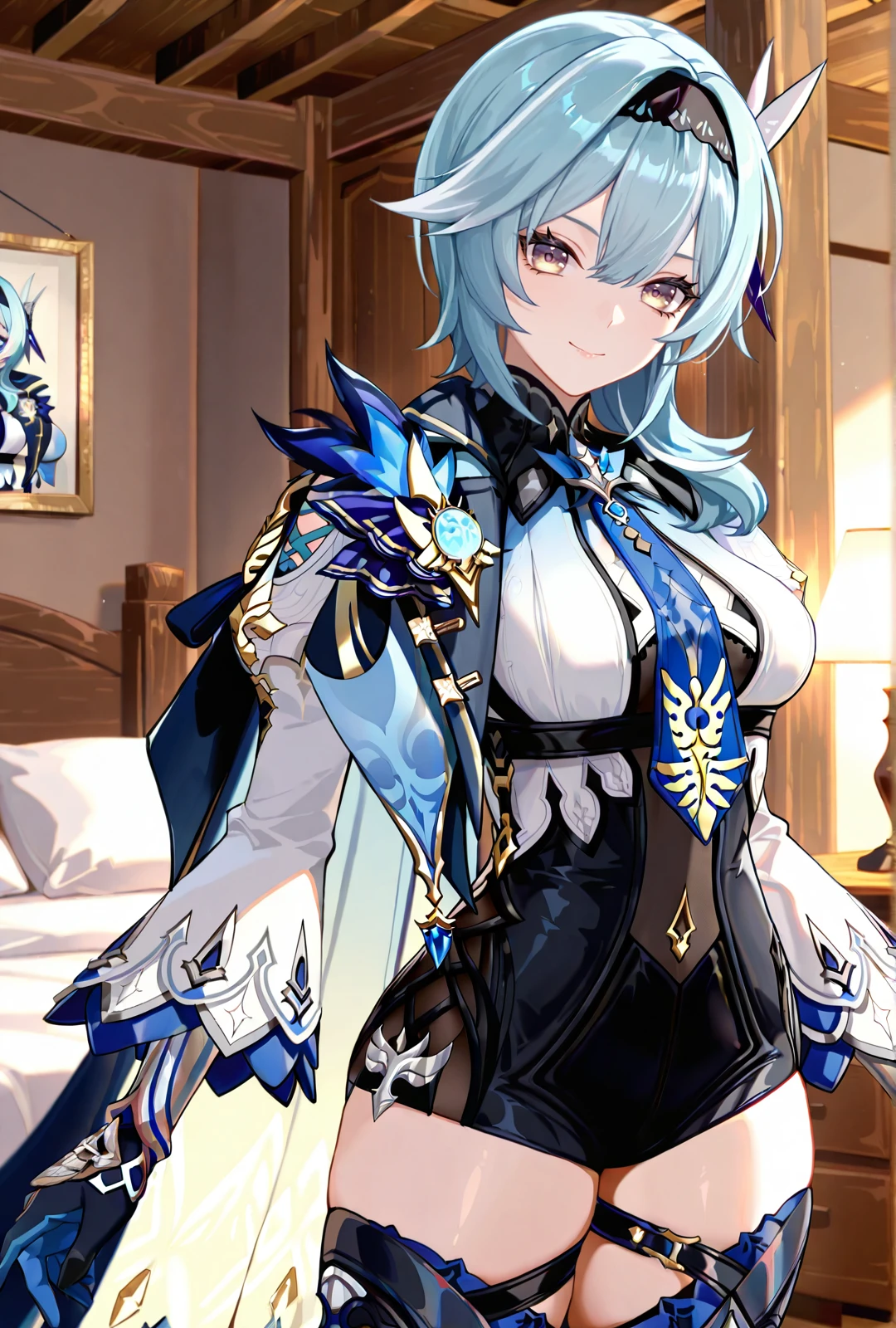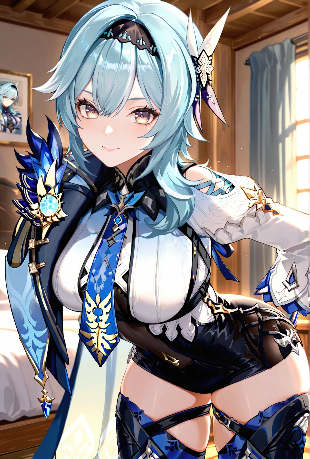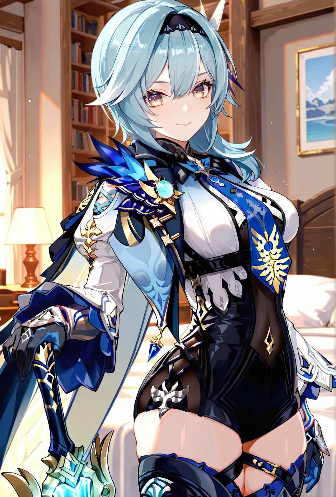 eula, 1girl, blue hair, medium hair, medium breasts, yellow eyes, white dress, cape, thighhighs, boots