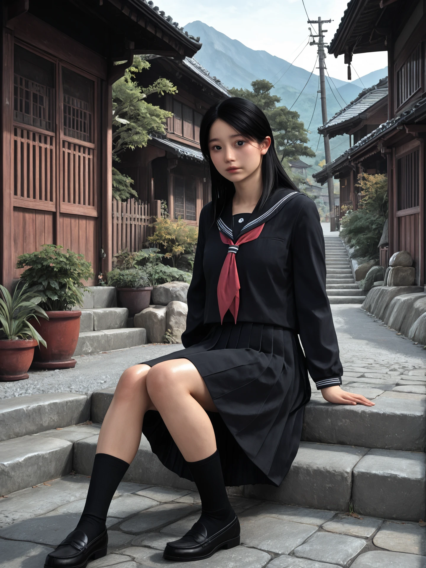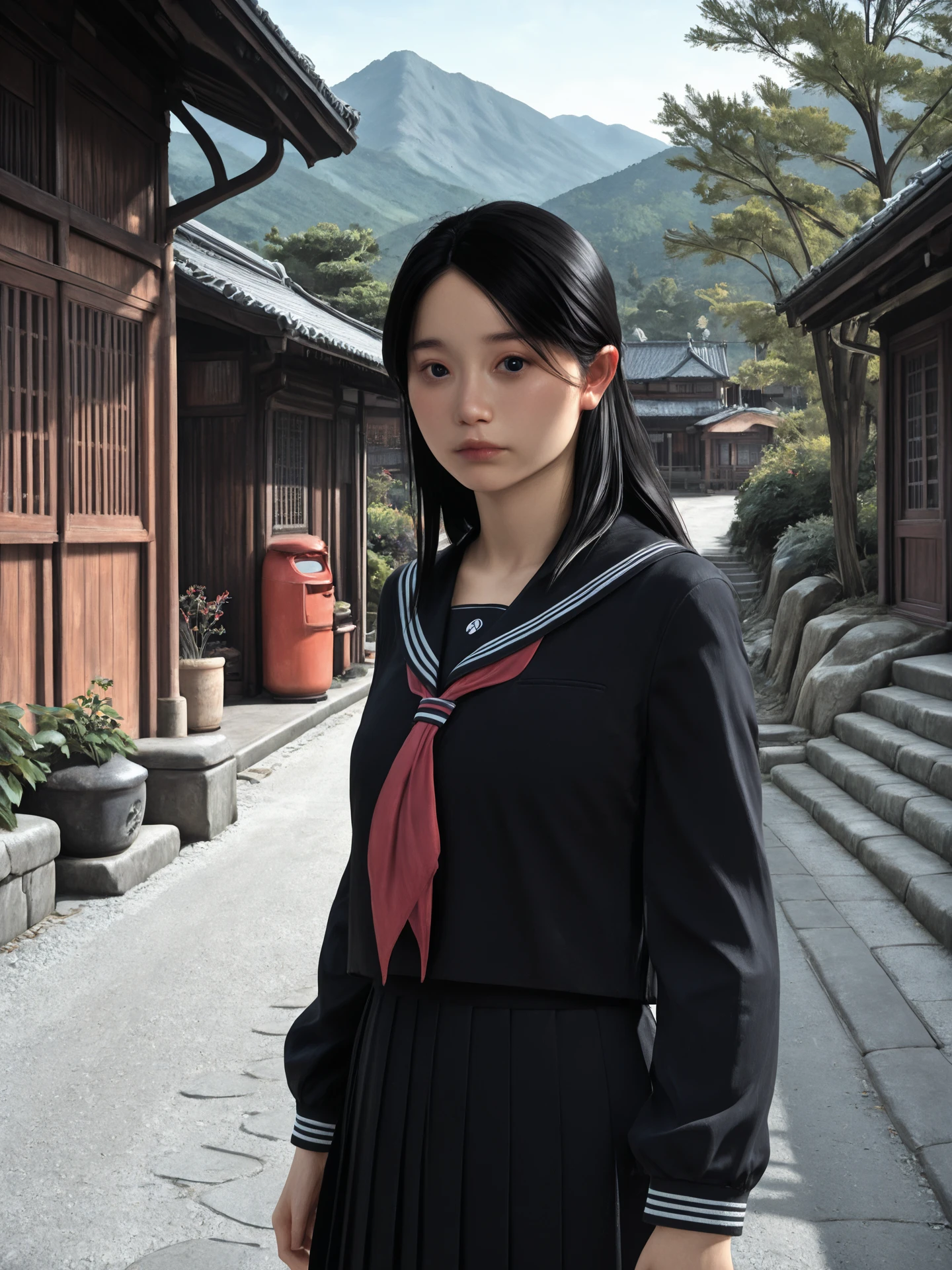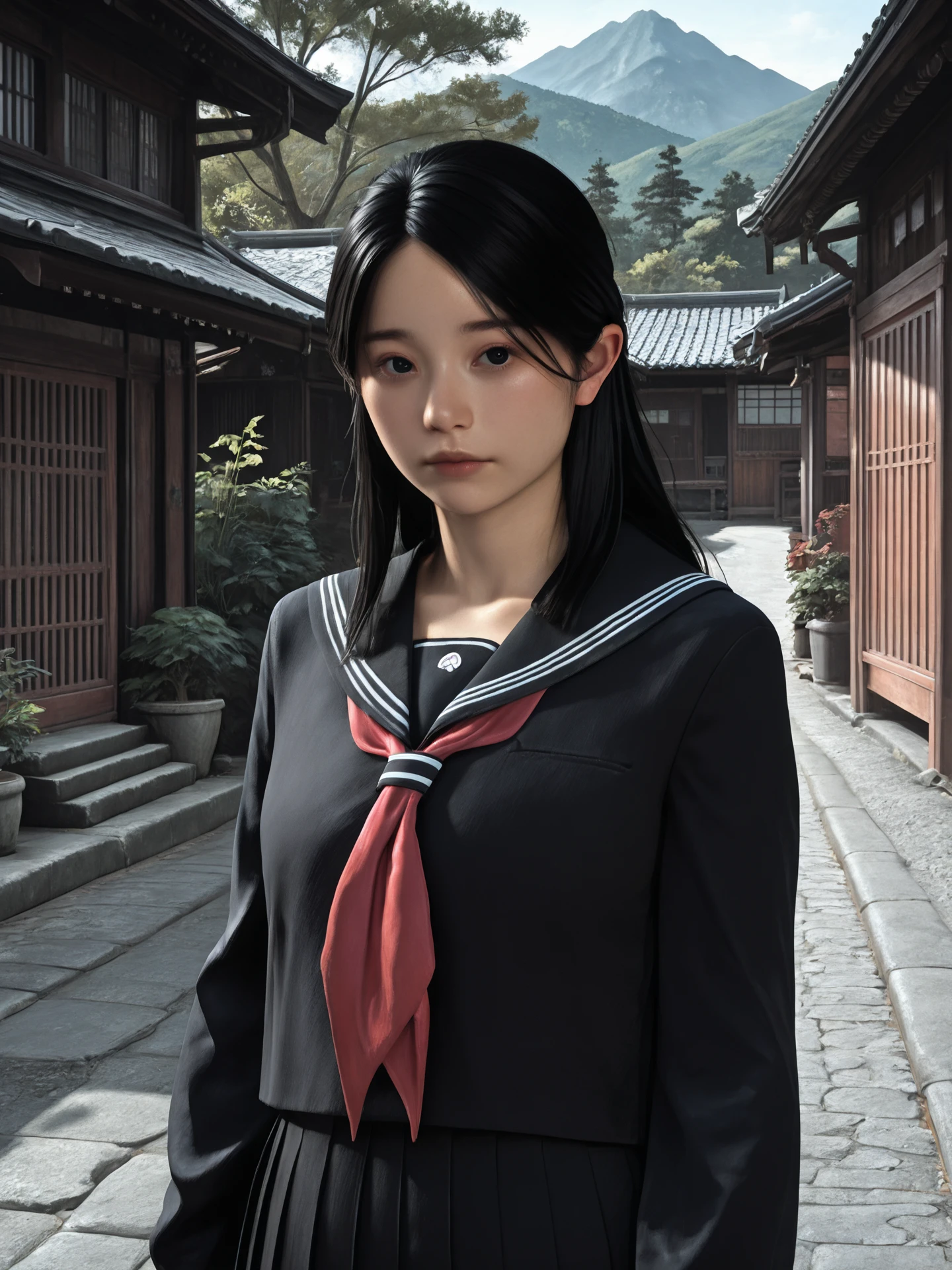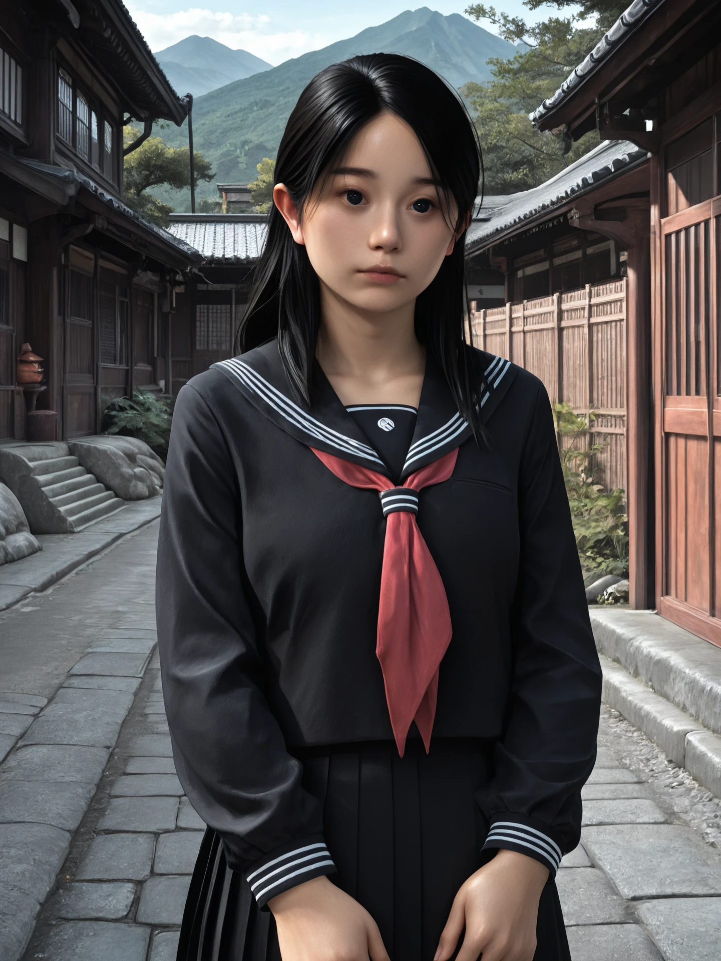Prompts:nishidarinko, black eyes, black hair, long hair, parted hair,serafuku, black sailor collar, black shirt, red neckerchief, long sleeves, black skirt,