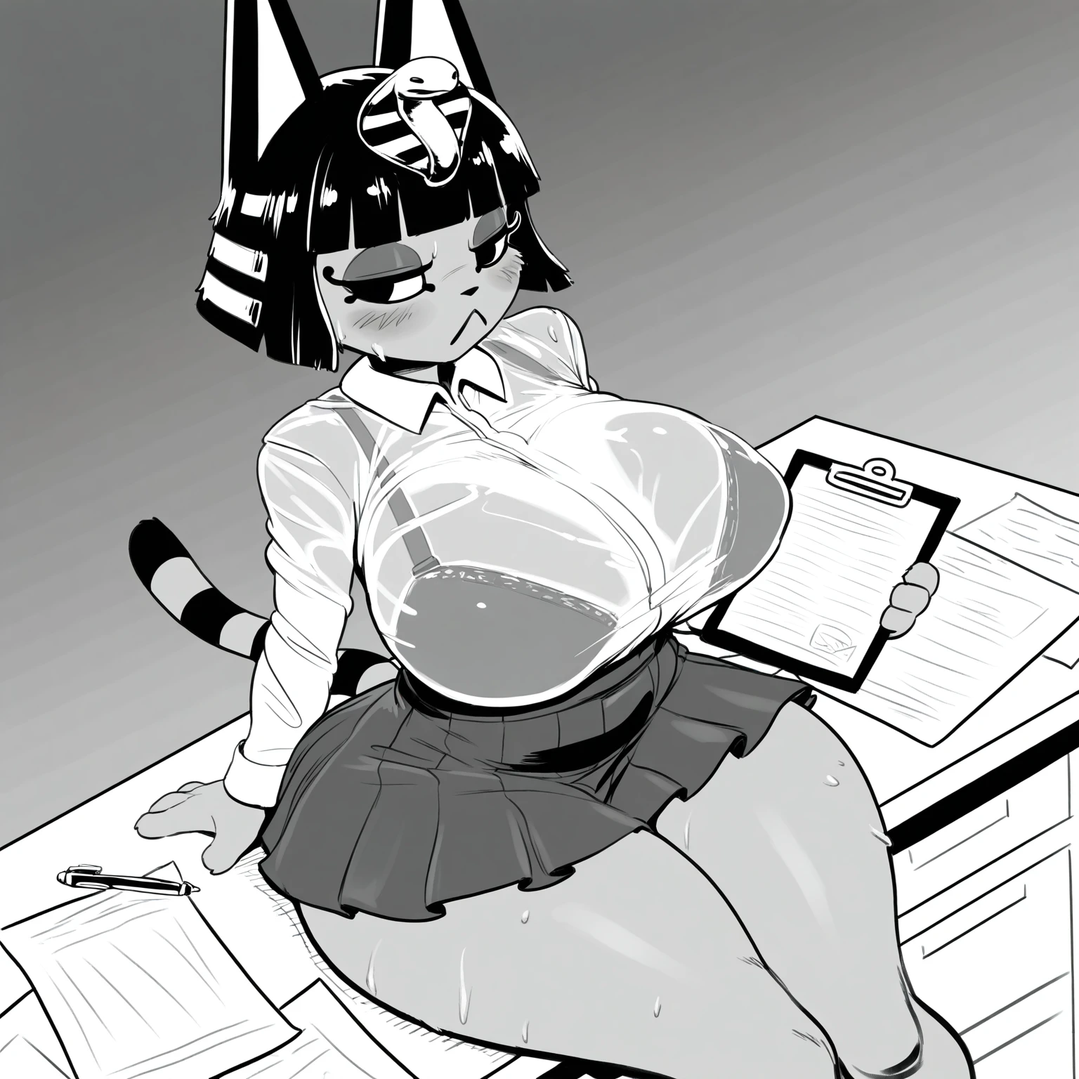 by magsama, syx (magsama), syx, dark elf, elf, humanoid, purple body, purple skin, white hair, long hair, purple eyes, huge breasts, large breasts, dark nipples, dark areolae, eyelashes, curvy figure, wide hips, thick thighs, huge ass, humanoid pointy ears, pointy ears, 1girl, solo, standing, jewelry,earrings, hoop earrings, gloves, nail polish, bracelet, slingshot swimsuit, navel, thighhighs, skirt, belt, covered nipples, blush, open mouth, :0, cowboy shot, indoors, blurry backgroundZuub