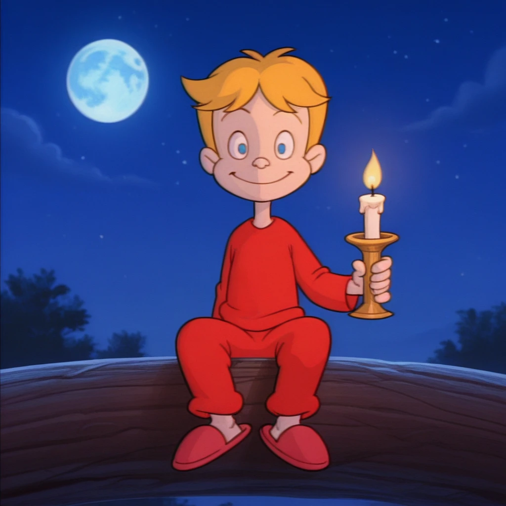 Verne - red winter cap with dark brim, yellow scarf, black winter sweater with red sleeves