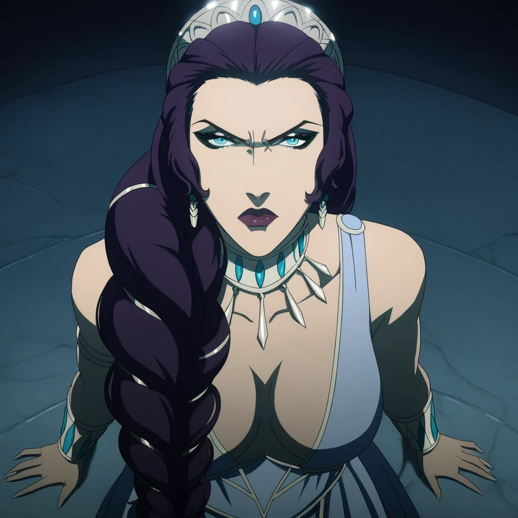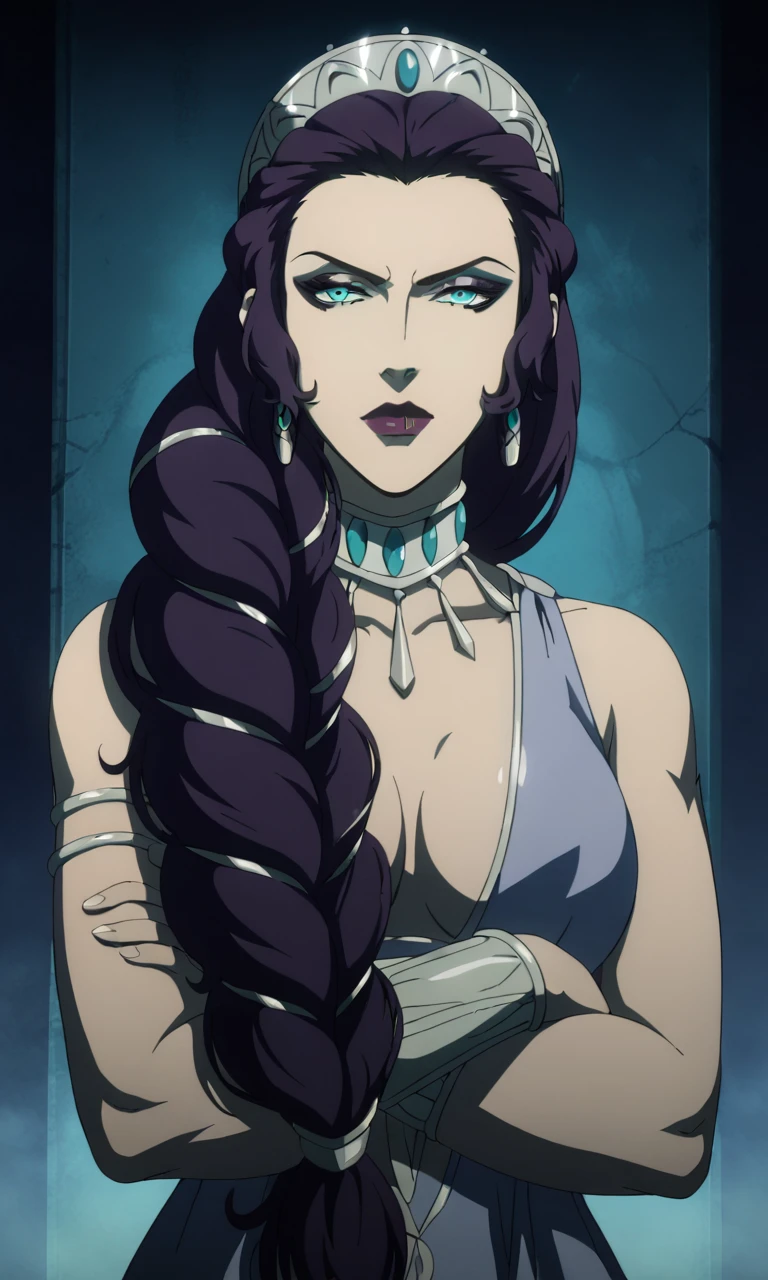 1girl, solo, dark purple hair, purple lips, turquoise blue eyes, braid, single braid, tiara, jewelry, earrings, serious, makeup