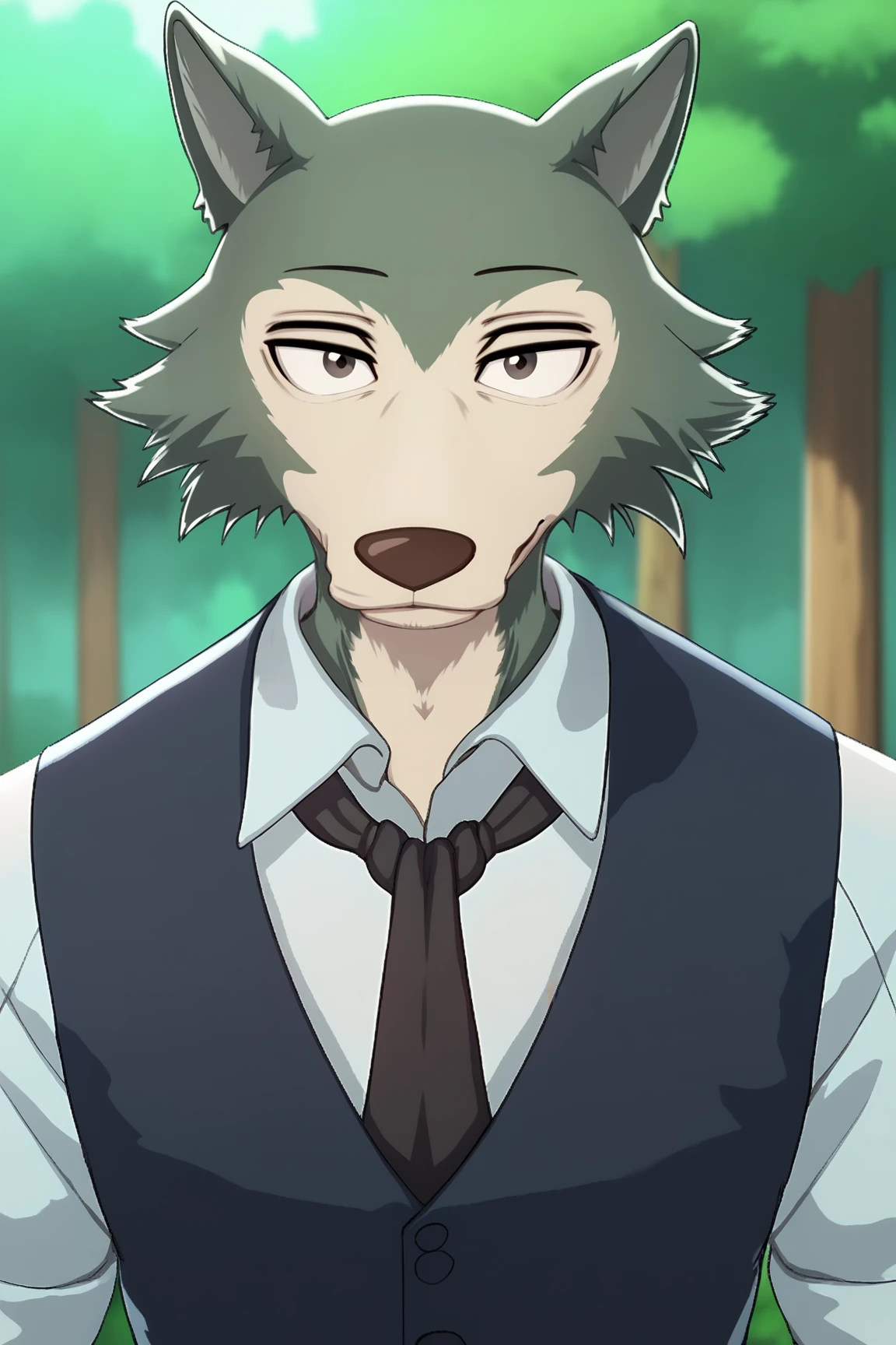 ➜ LegoshiBPXL, anthro furry, furry male, body fur, grey fur, black eyes, animal ears, wolf ears, pectorals, blue vest, collared shirt, white shirt, black necktie, vertical stripes, grey pants, brown shoes]--|======[ 💗 My Settings: 💗 ]======|--[