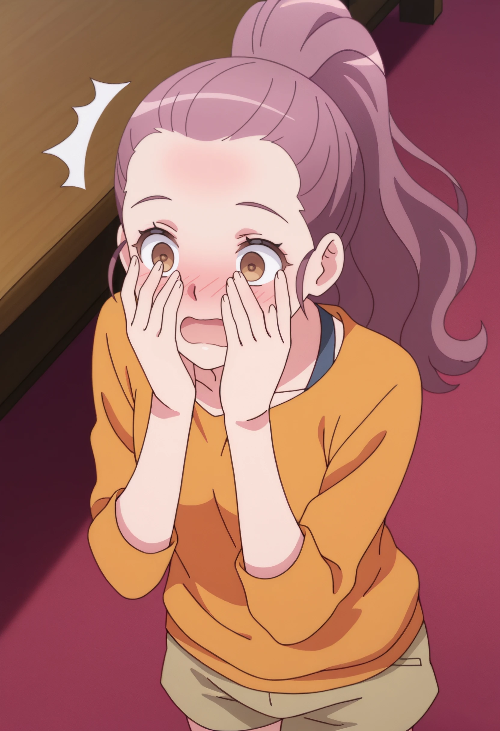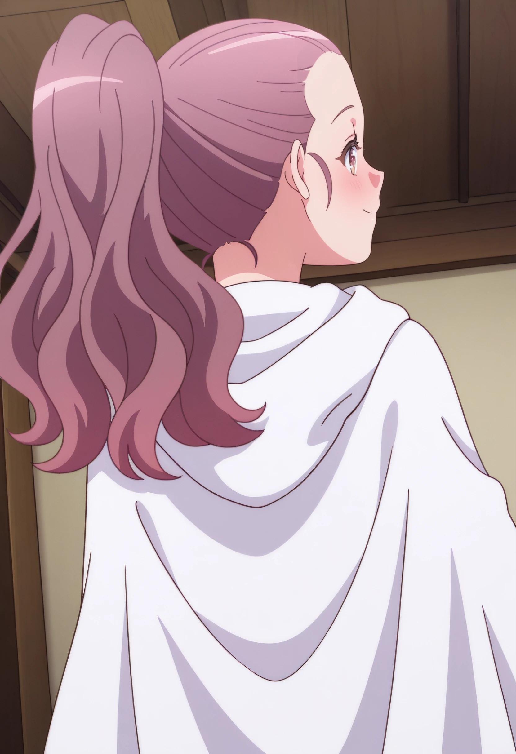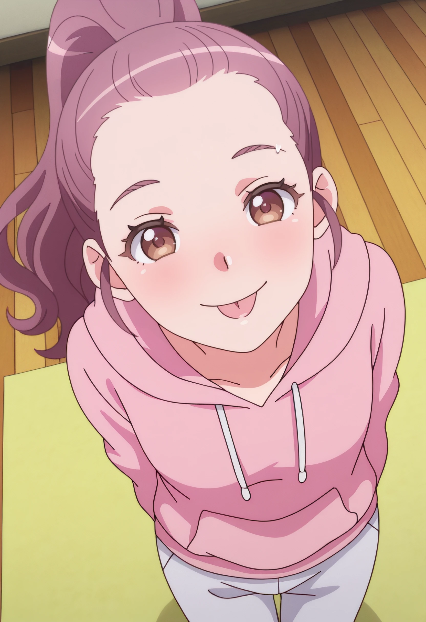 KNMLisa, long hair, pink hair, ponytail, hair pulled back, high ponytail, brown eyes, forehead,