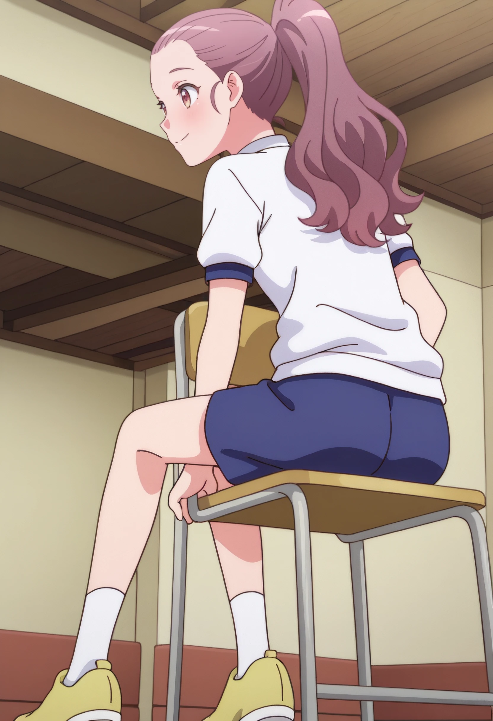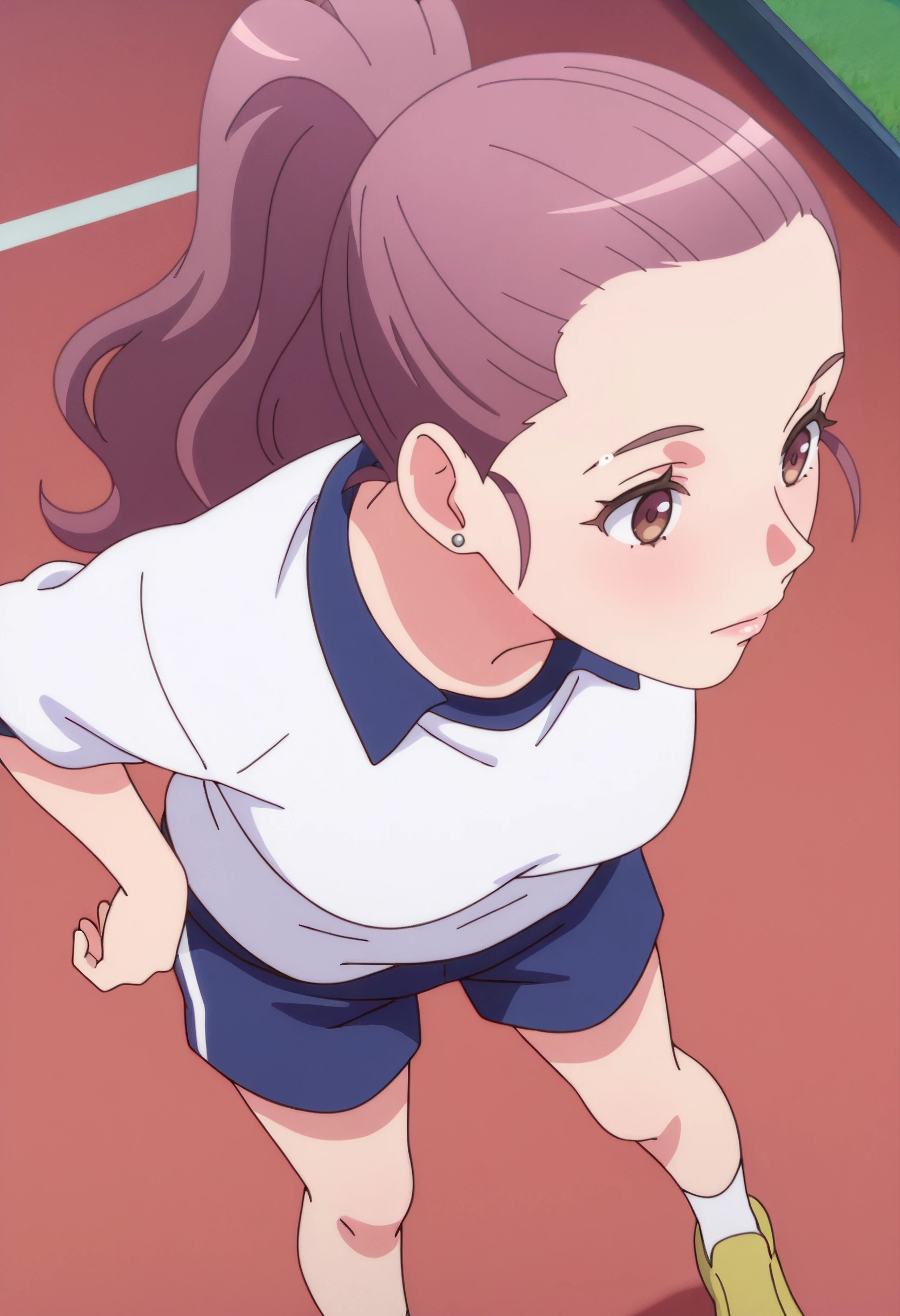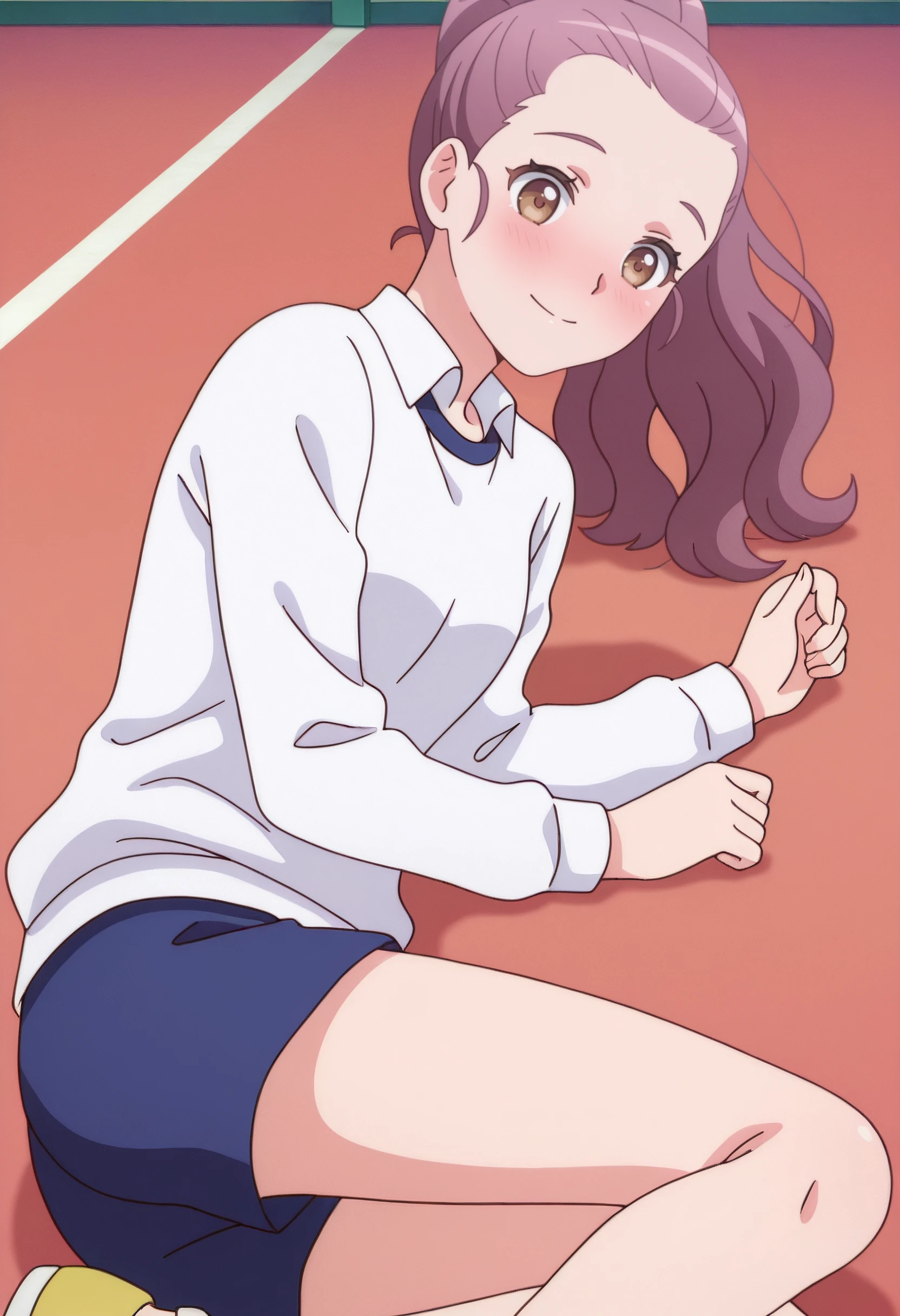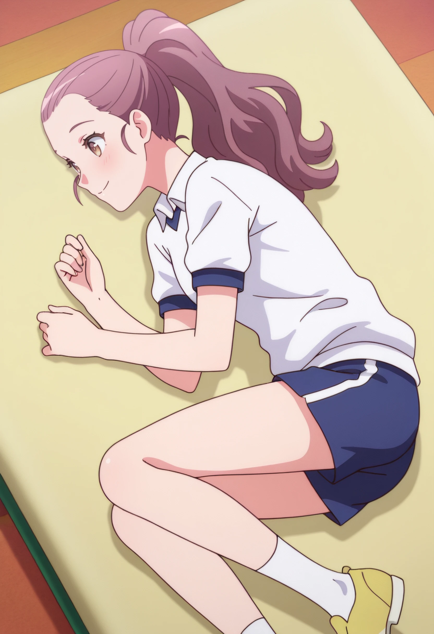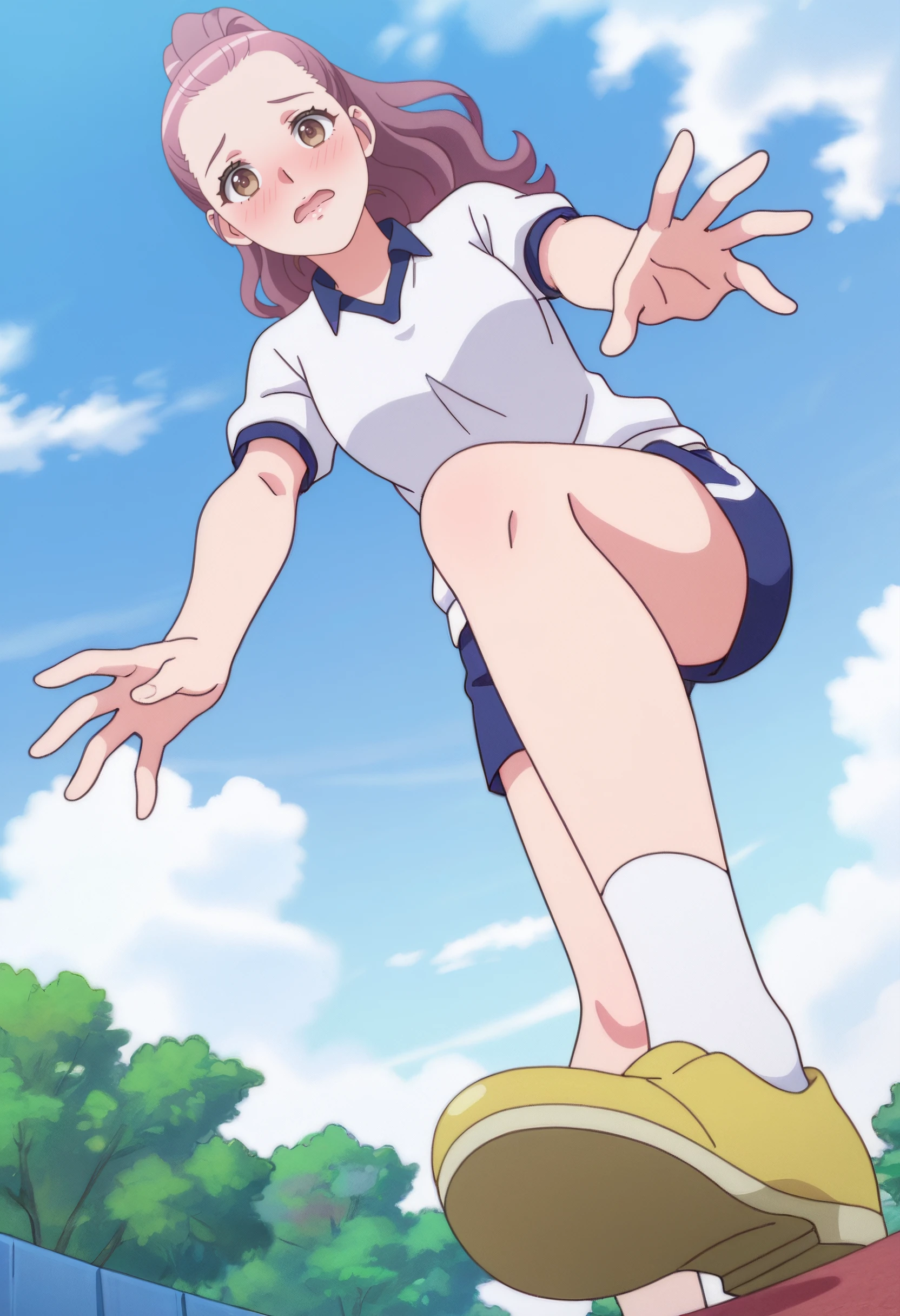 LisaOutfit, white shirt, blue shorts, collared shirt, sportswear, shoes, gym uniform, yellow footwear,