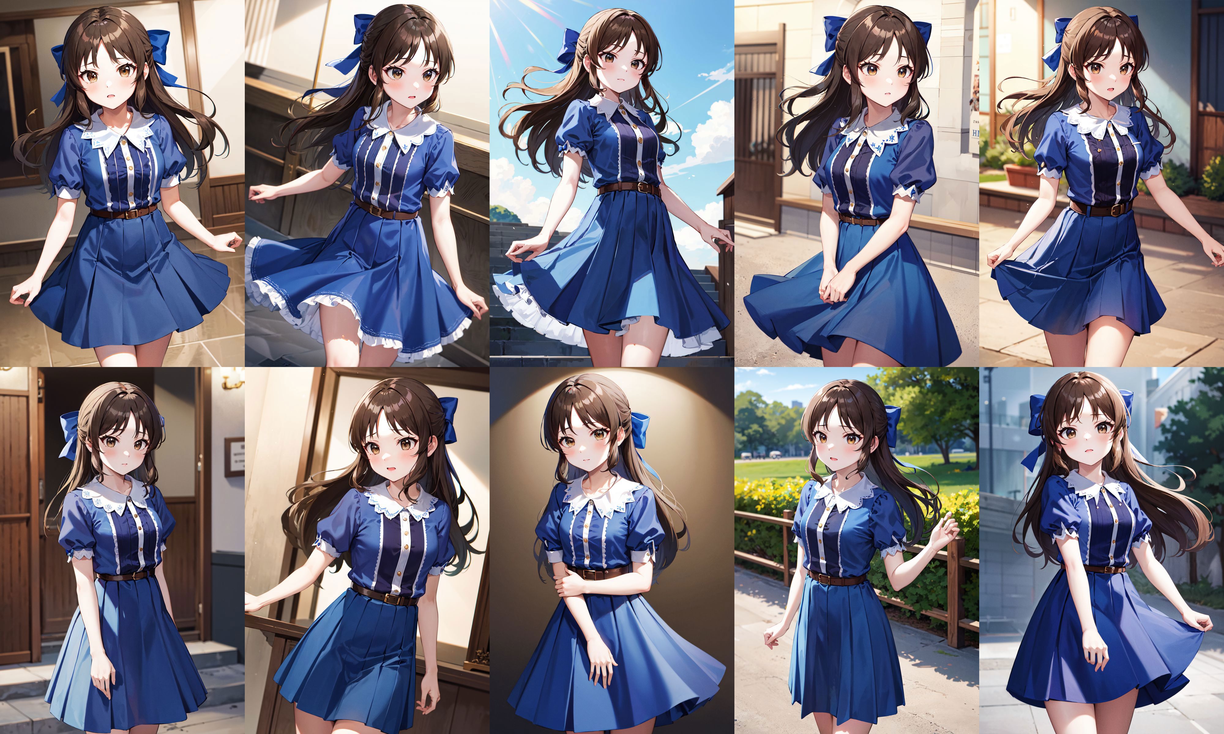 outfit1hmarisu, long hair, hair bow, blue bow, blue dress, collared dress, short sleeves, puffy sleeves, belt, blue skirt