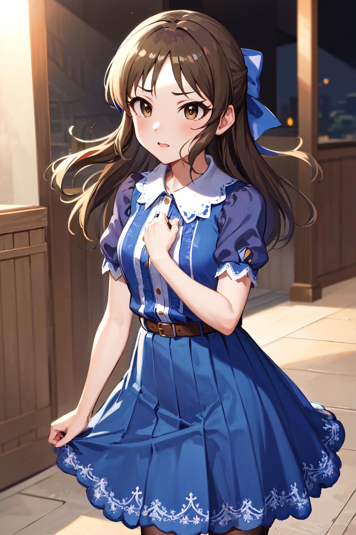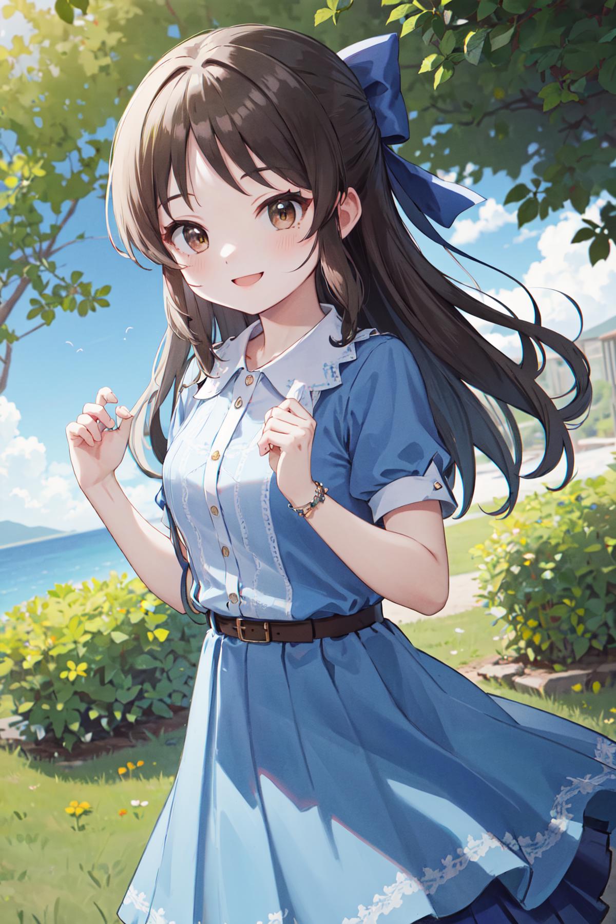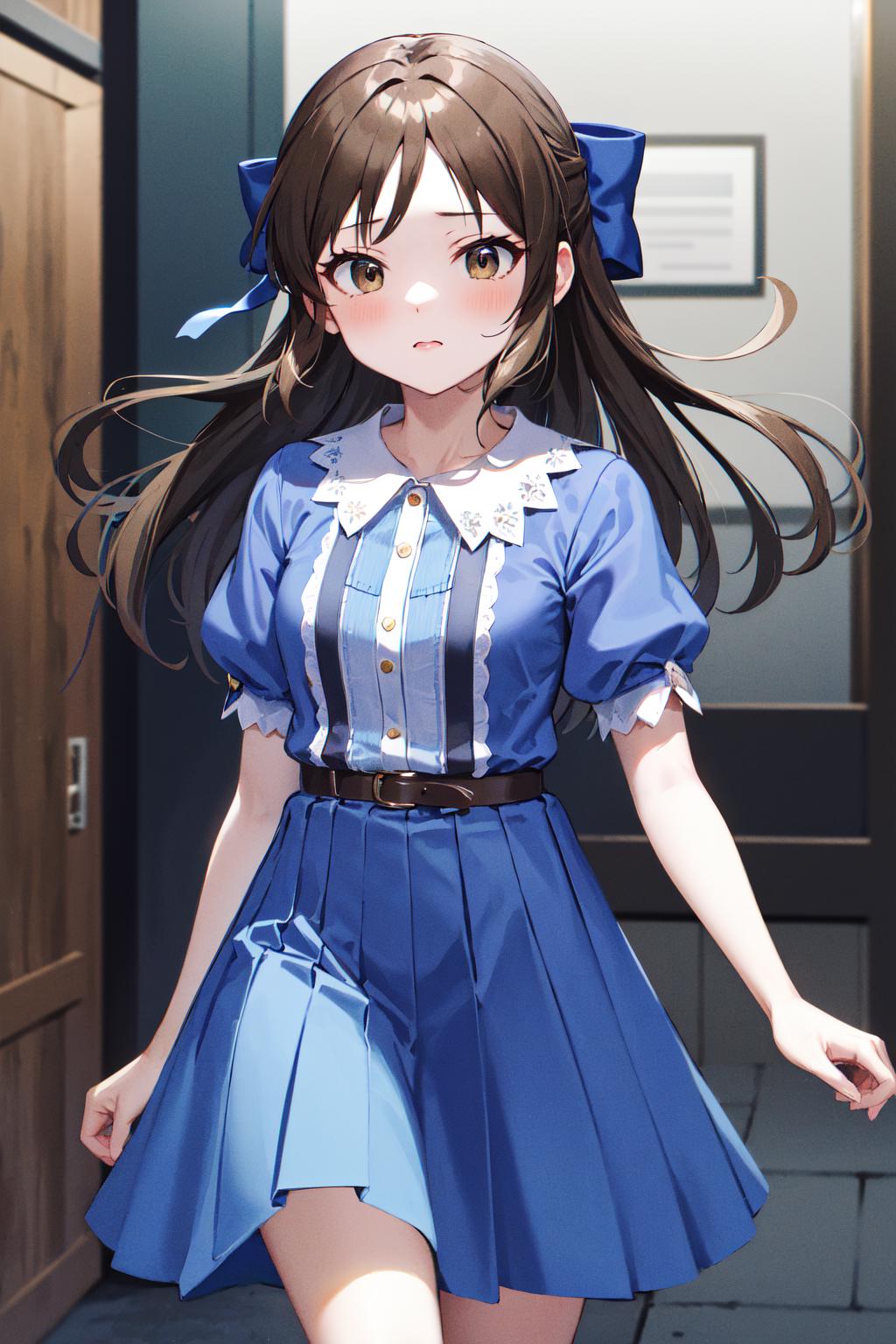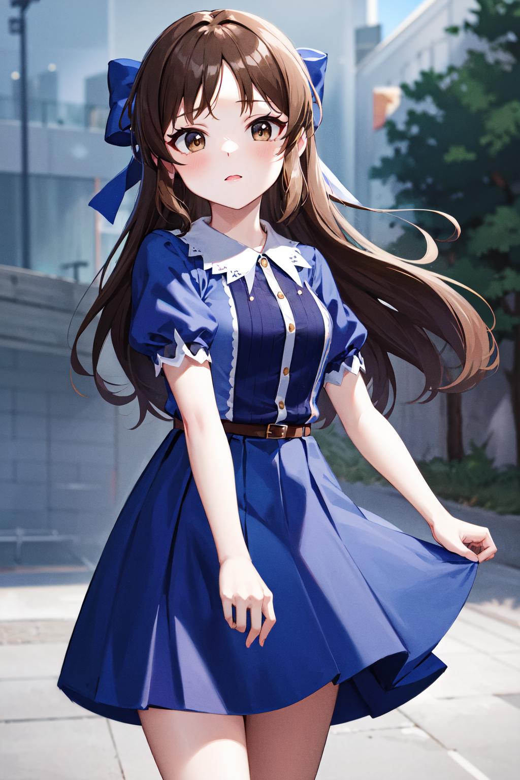 hmarisu, long hair, hair bow, blue bow, blue dress, collared dress, short sleeves, puffy sleeves, belt, blue skirt