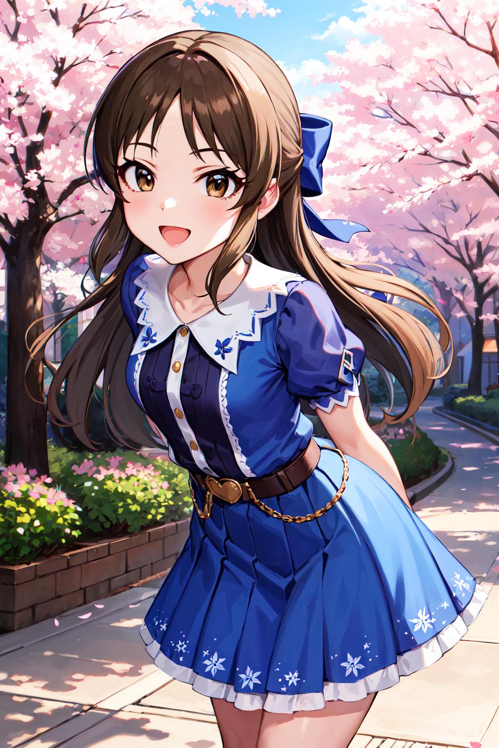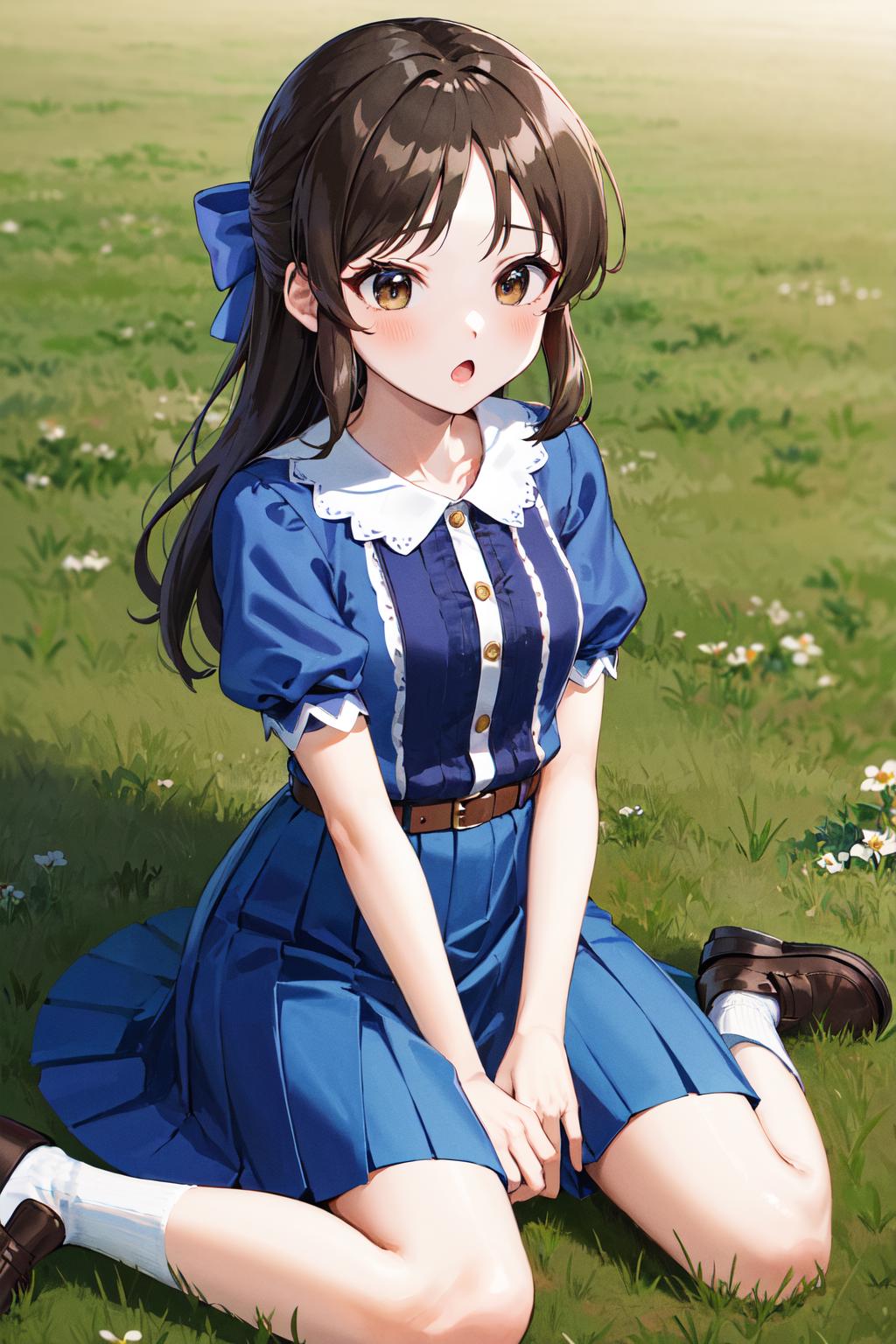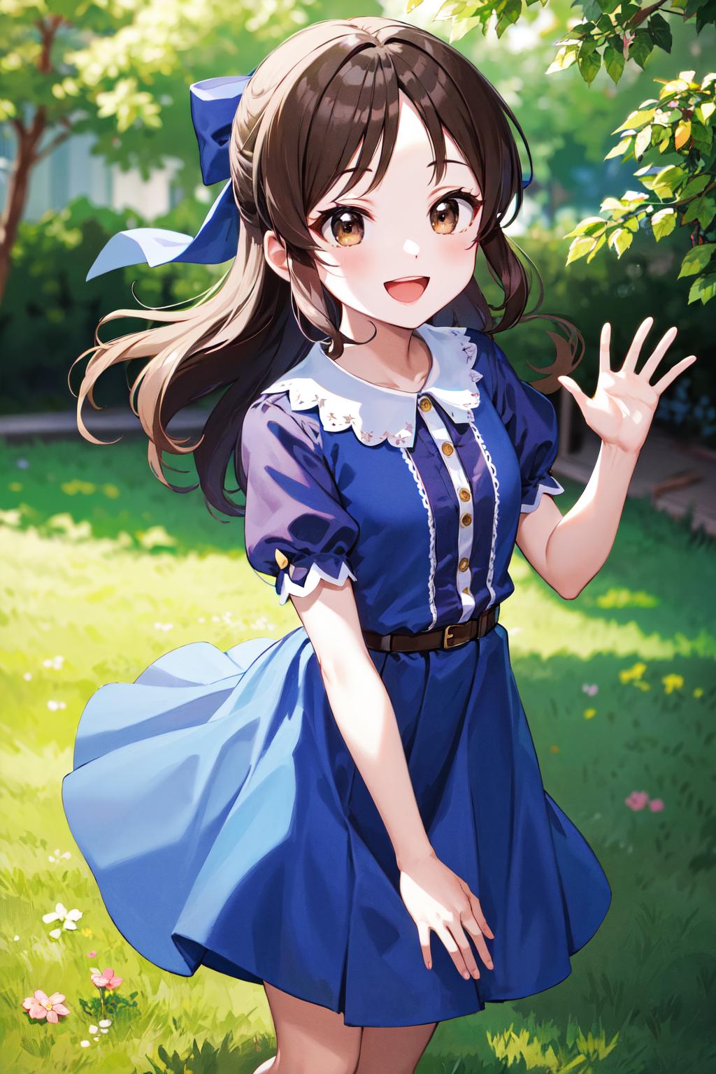 hmarisu, long hair, hair bow, blue bow, blue dress, collared dress, short sleeves, puffy sleeves, belt, blue skirt