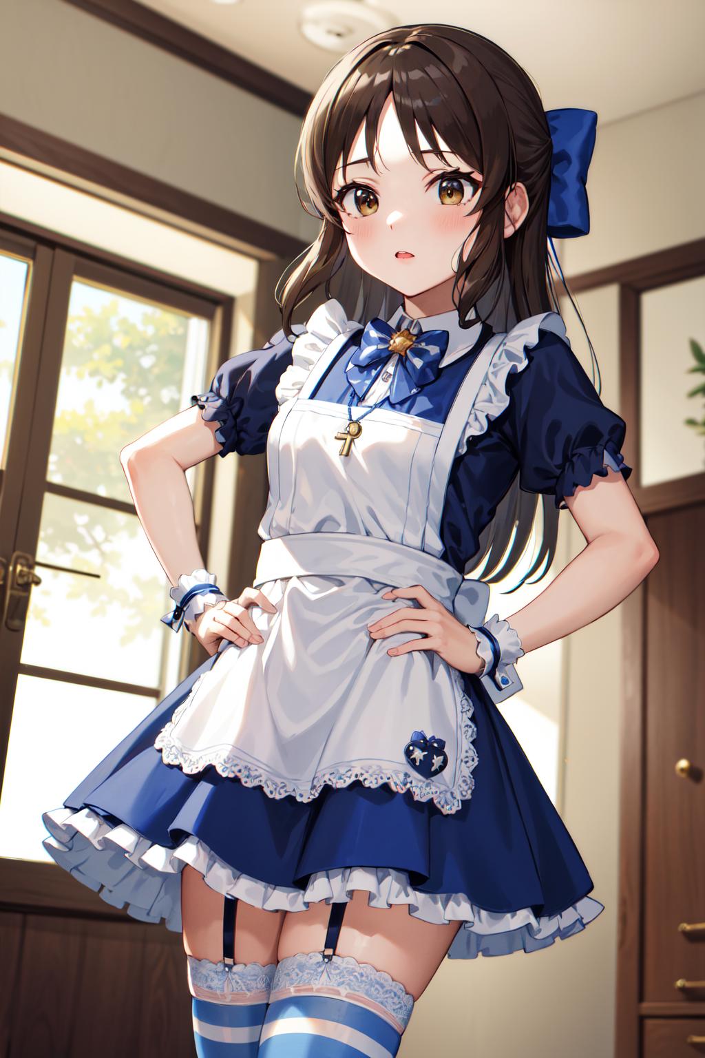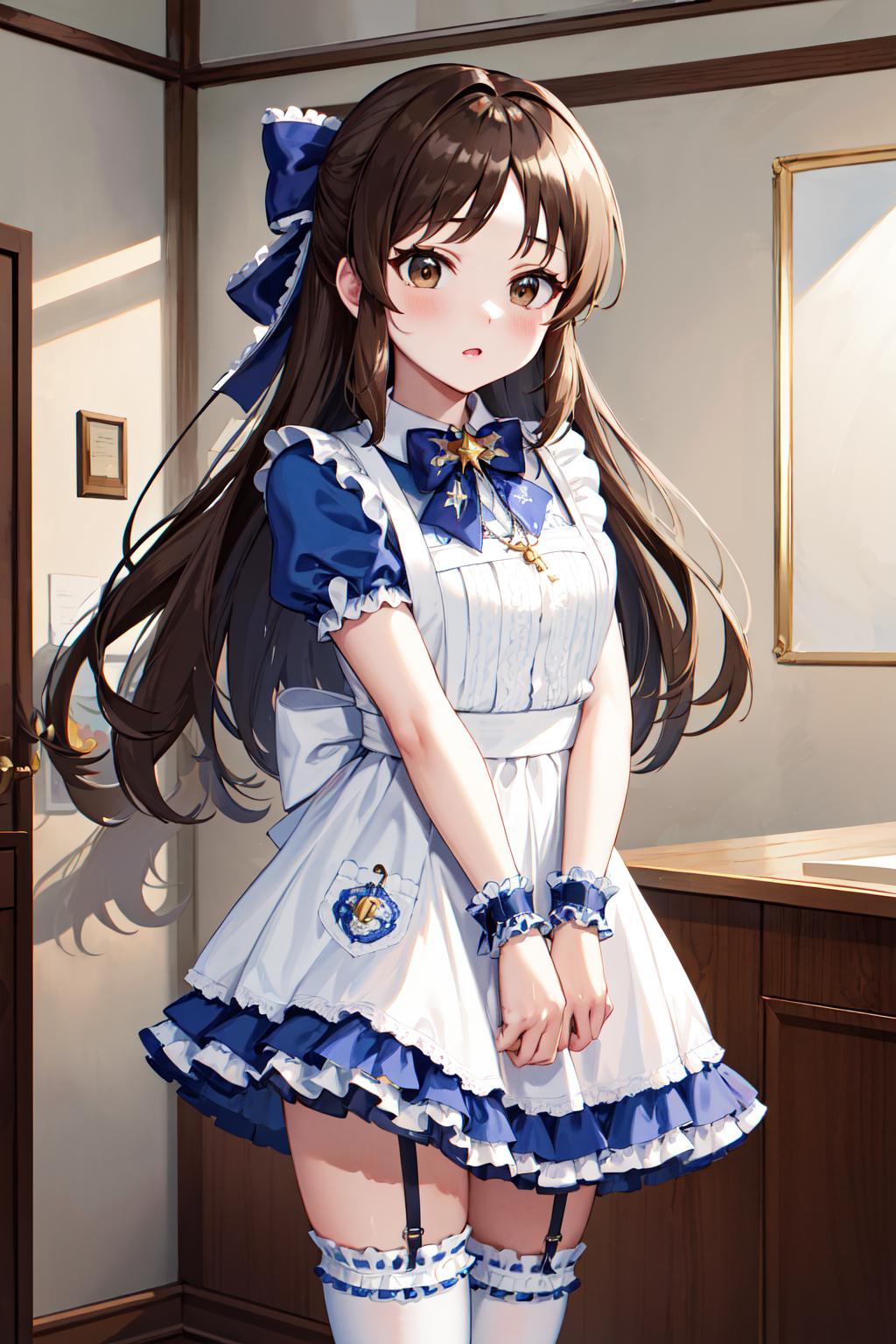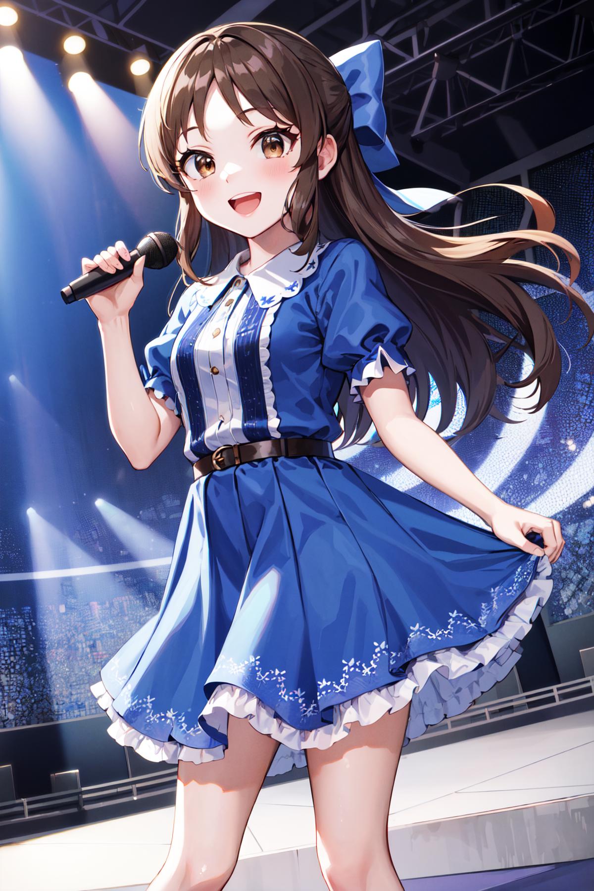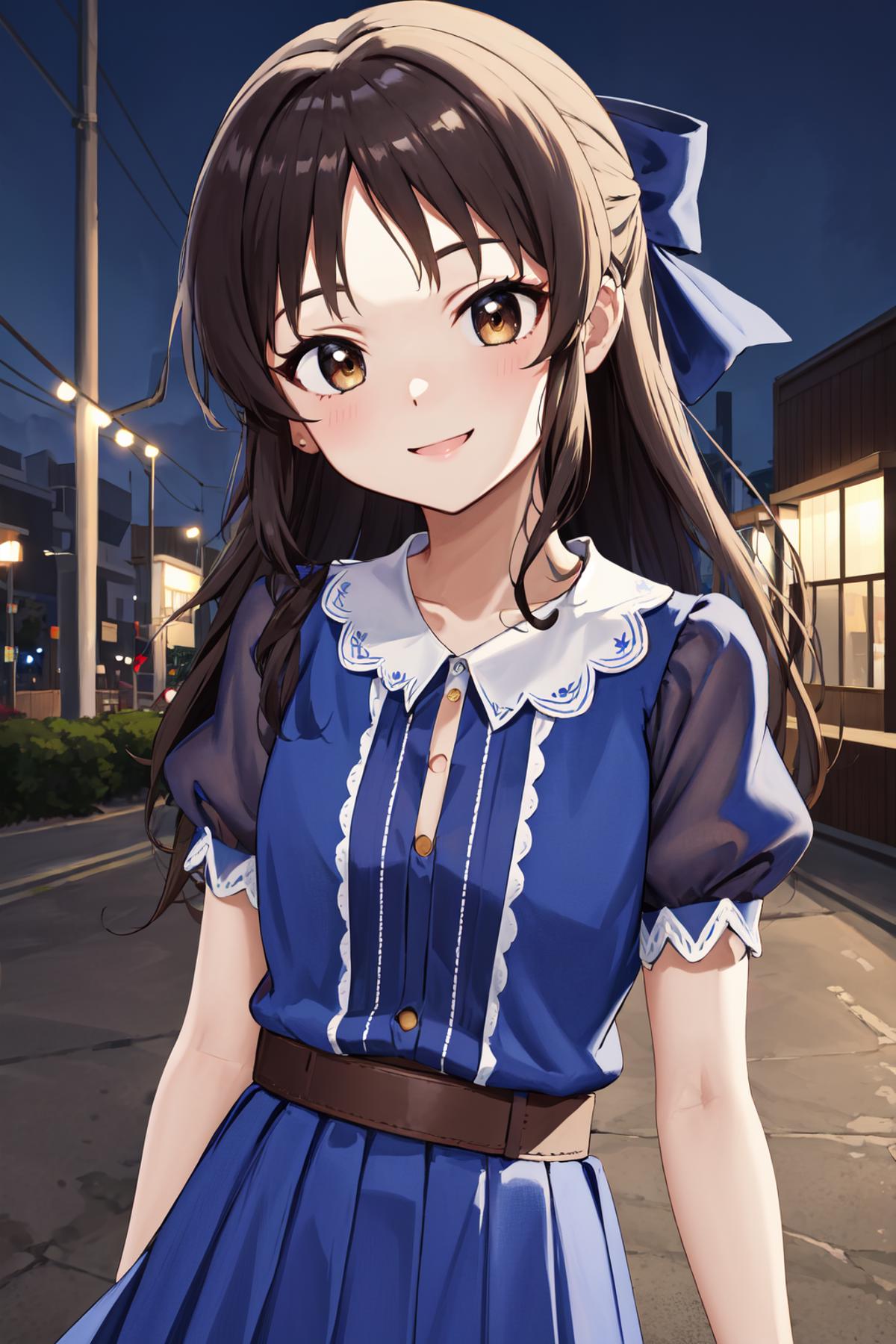 hmarisu, long hair, hair bow, blue bow, blue dress, collared dress, short sleeves, puffy sleeves, belt, blue skirt