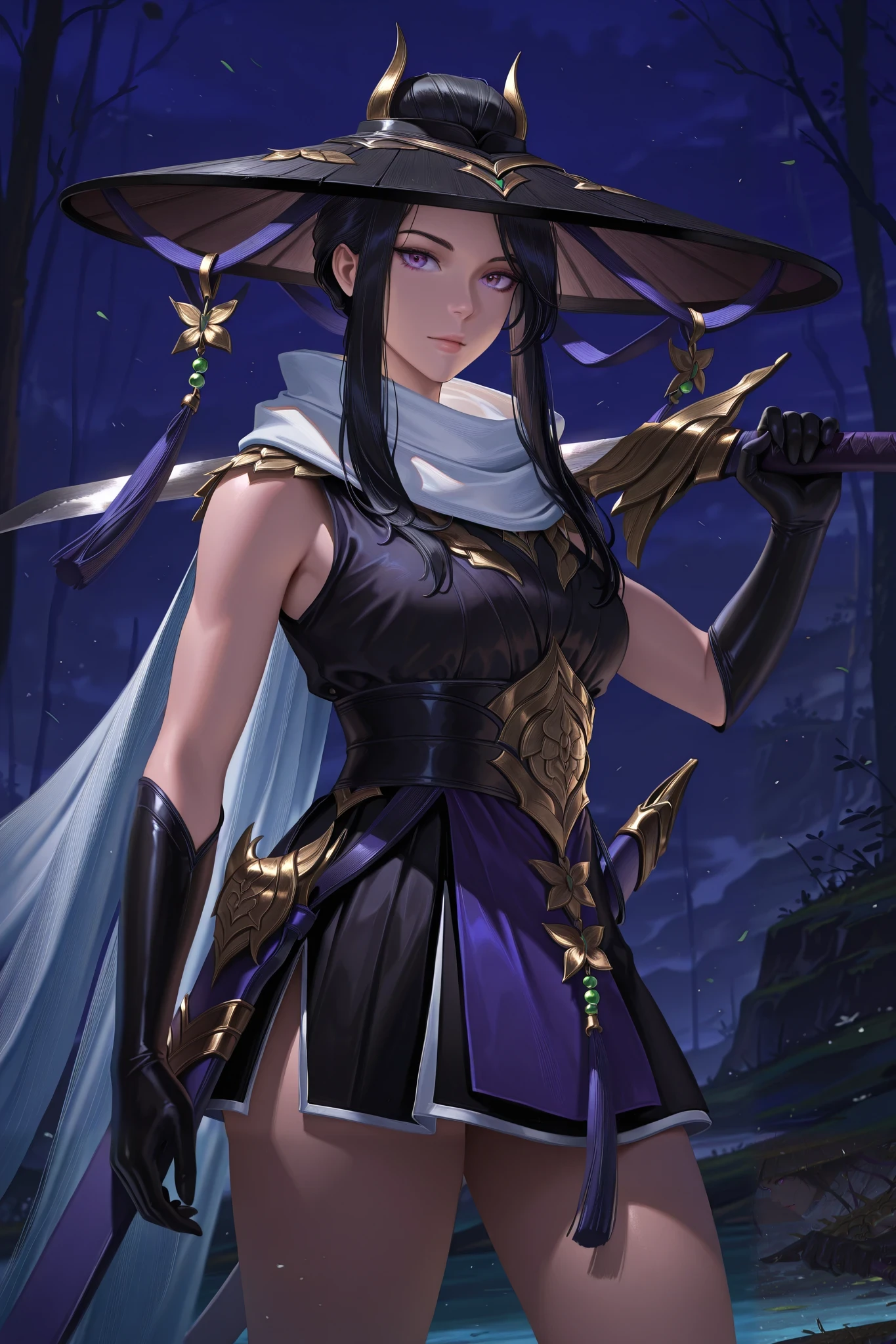 1girl, fannyskylark, black hair, no bangs, sidelocks, purple eyes, kasa hat, elbow gloves, dress, white scarf, scabbard, high heelsFanny Aspirant: