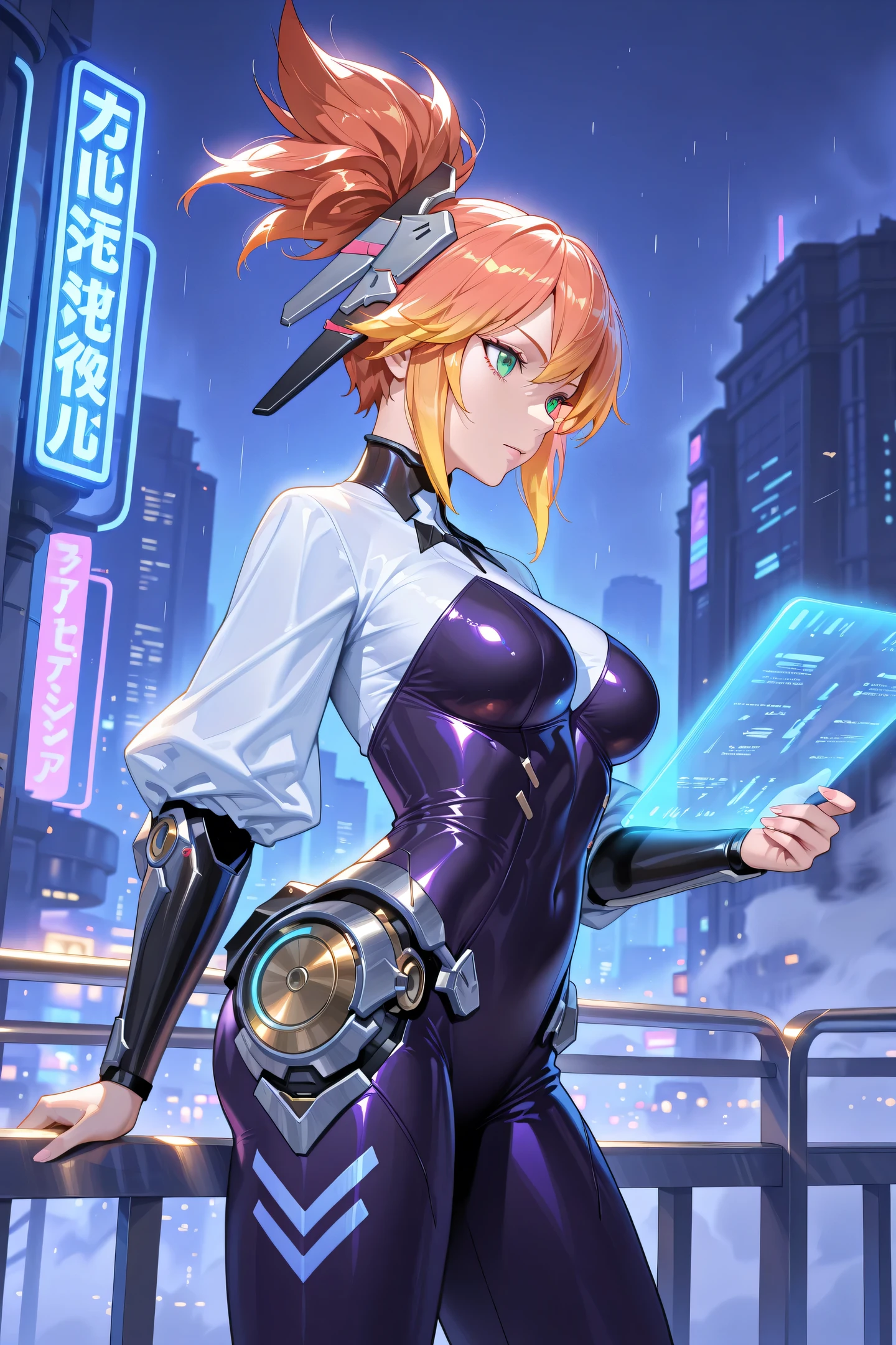 1girl, fannyaspirant, orange hair, multicolored hair,ponytail, sidelocks, bangs, green eyes, headgear, red necktie, bodysuit, mecha sheath, white high heel boots