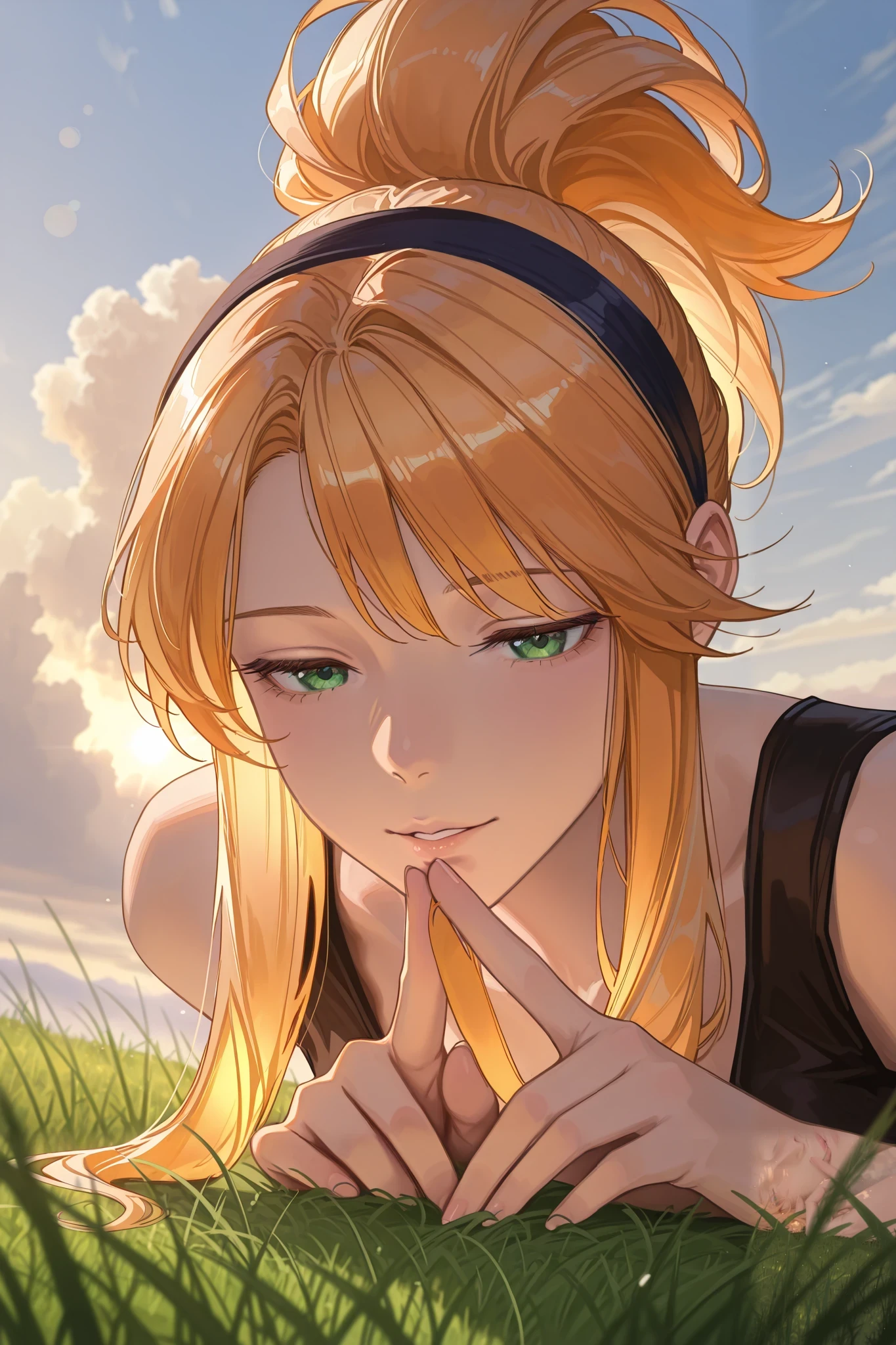 1girl, fannydefault, light orange hair, ponytail, sidelocks, bangs, green eyes, blue hairband,blue bodysuit,cleavage, fingerless gloves, armor, sheath belt, pants,high heel bootsFanny Skylark: