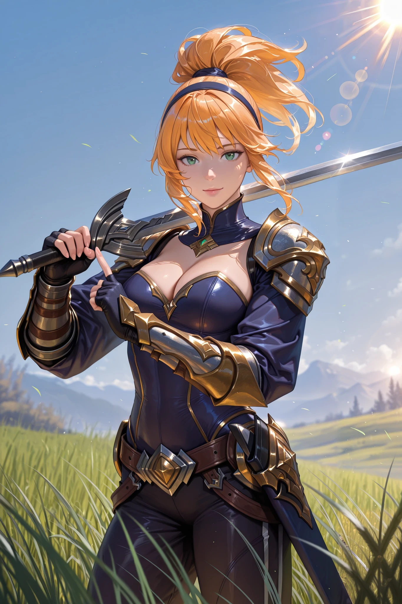 1girl, fannydefault, light orange hair, ponytail, sidelocks, bangs, green eyes, blue hairband,blue bodysuit,cleavage, fingerless gloves, armor, sheath belt, pants,high heel boots