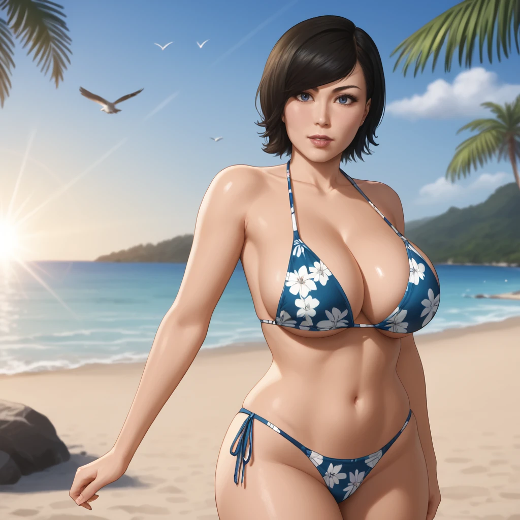 YuriWatanabePS4, 1girl, leather jacket, denim, pants, jeans, red shirt, short hair, black hair, belt, lips, plaid, open jacket