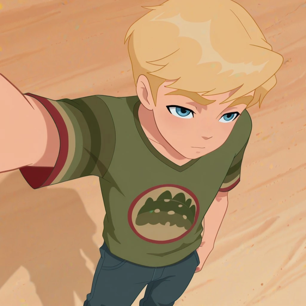 elliot_ma, 1boy, blonde hair, blue eyes, t-shirt, pants