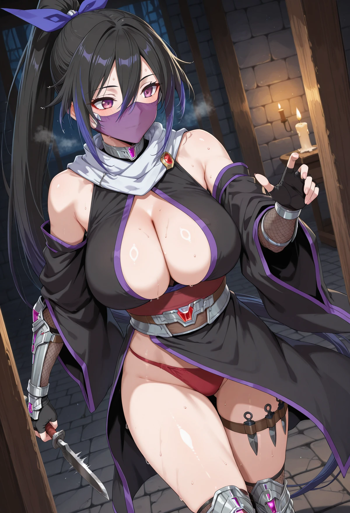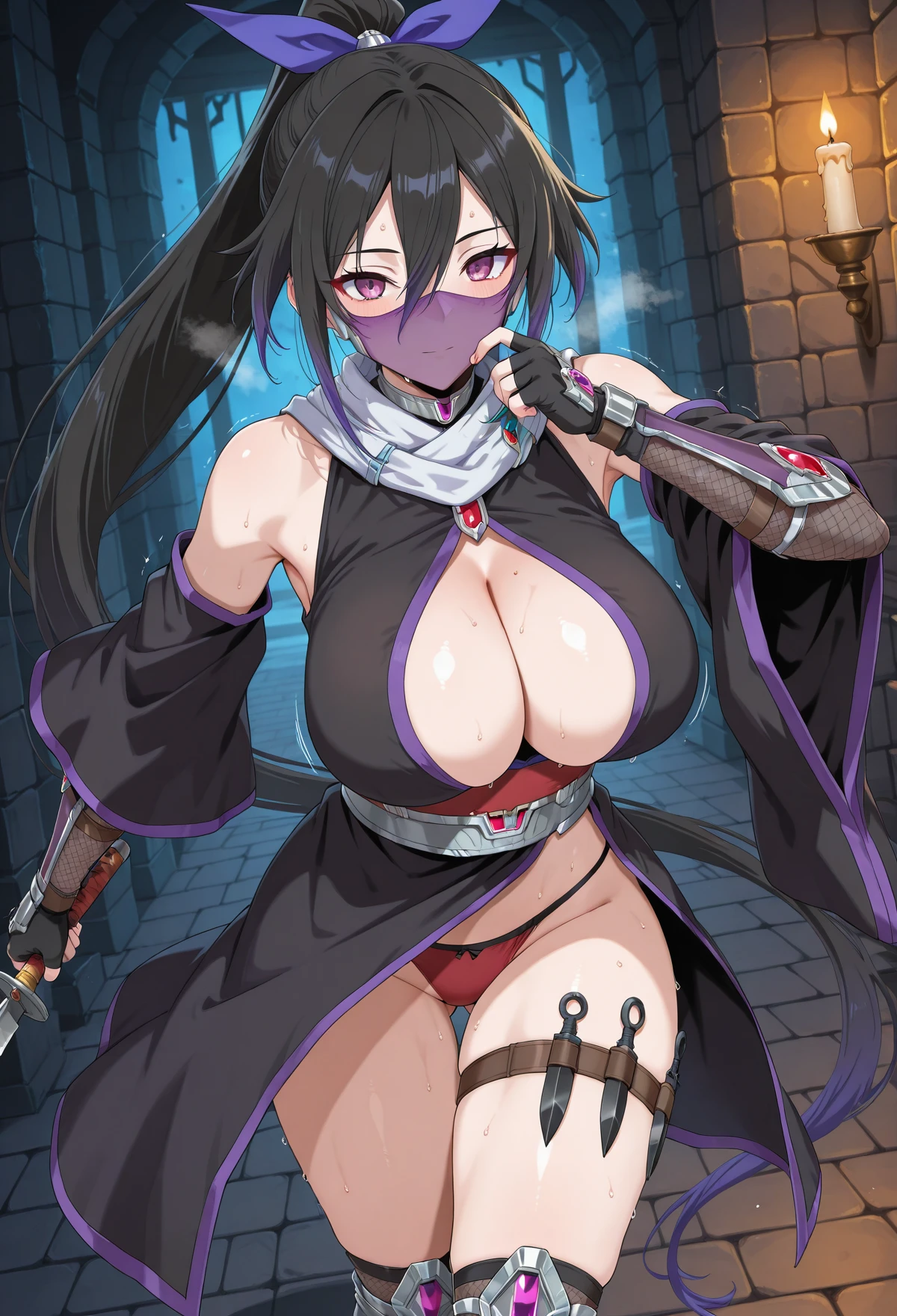 Tsubaki_MGR, 1girl, breasts, long hair , black hair, large breasts, purple eyes,very long hair, fingerless gloves, ninja girl,bare shoulder, high ponytail, side hair, hair between eyes, purple ponytail, center cutout,