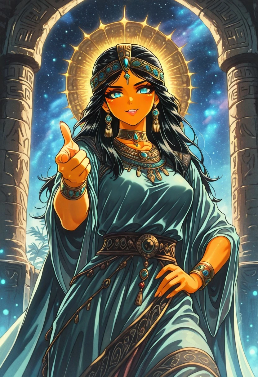 FantasyEgyptMS, 1girl, solo, curvy body, tanned skin, long hair, black hair, hair ornament, headdress, braids, earrings, blue eyes, full lips, makeup, large breast, necklace, long dress, wide sleeves, dress ornament, bracelet, thick thighs, cape, jewelry, detached sleeves, circlet, choker, rings, armor, beads,