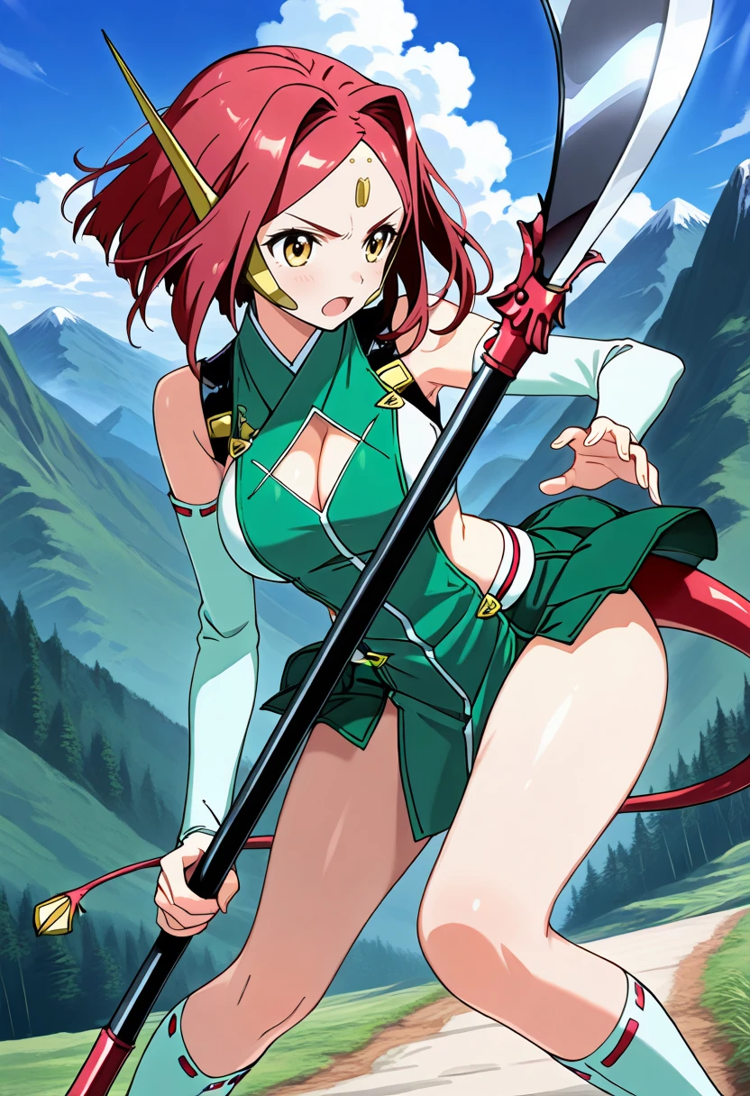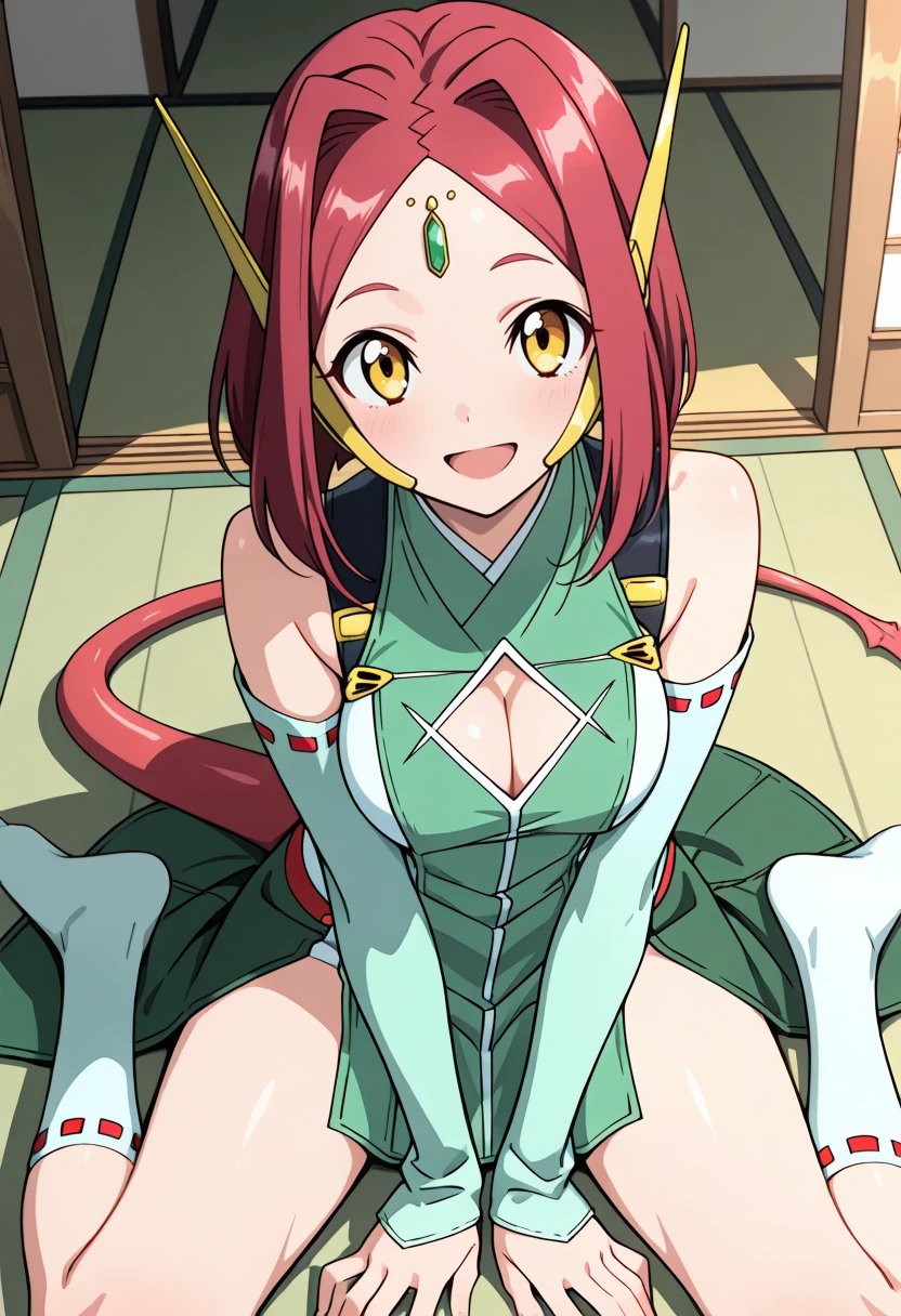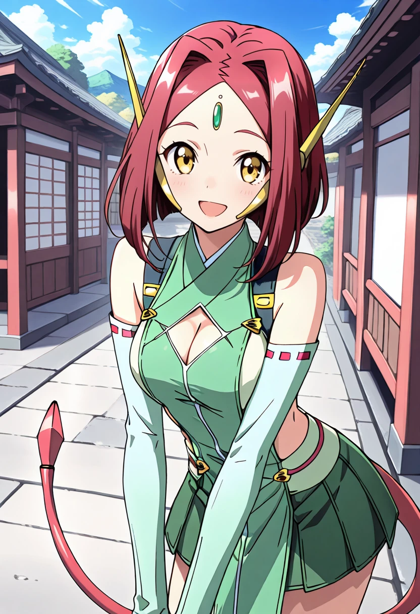 green dress, green skirt, white elbow gloves, cleavage cutout, white socks, red hair, parted bangs, hair intakes, forehead jewel, robot ears, tail, yellow eyes