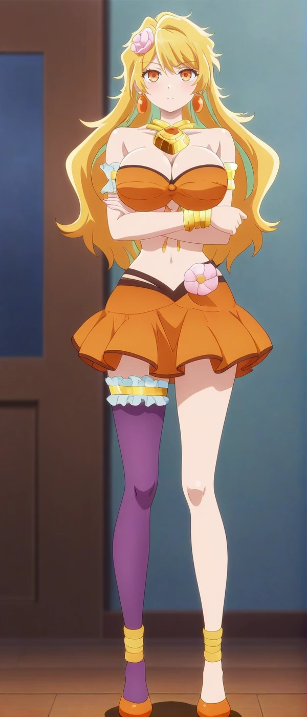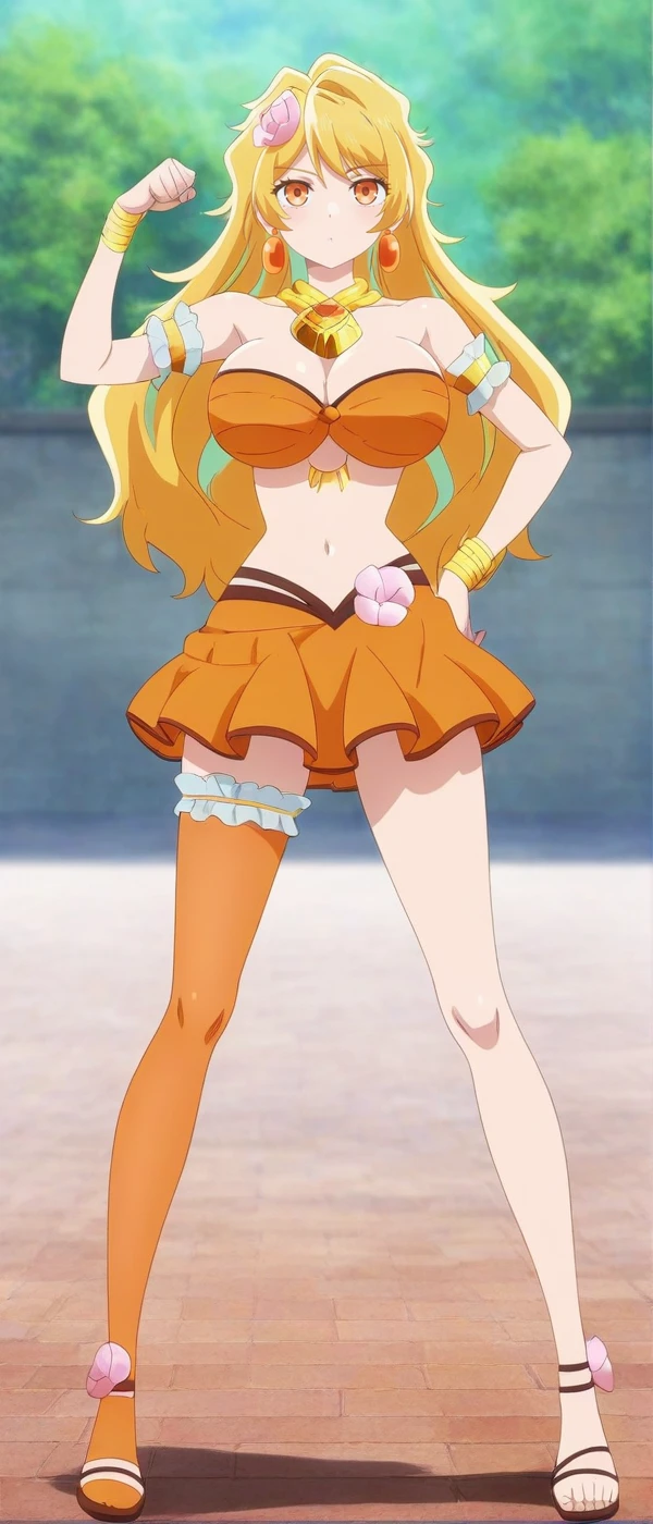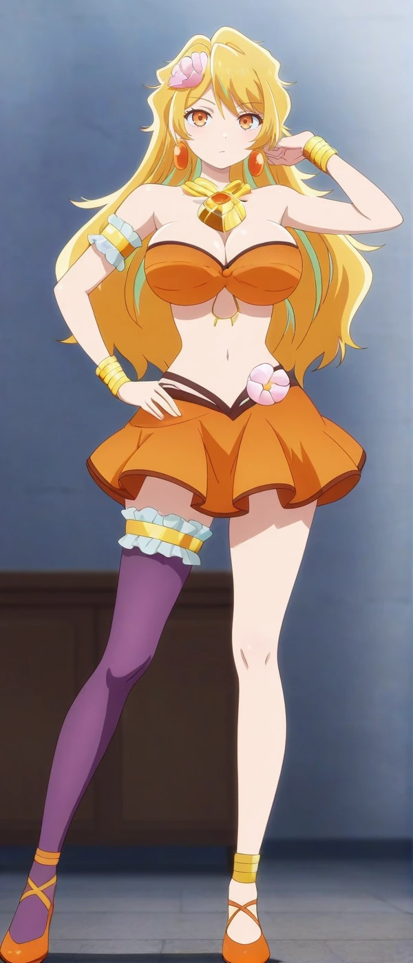 anime coloring, strapless bra, orange bandeau, orange skirt, miniskirt, bracelet, armlet, asymmetrical legwear, frilled thigh strap, midriff, bare shoulders, necklace, uneven legwear, purple tighhigh, single thighhigh,