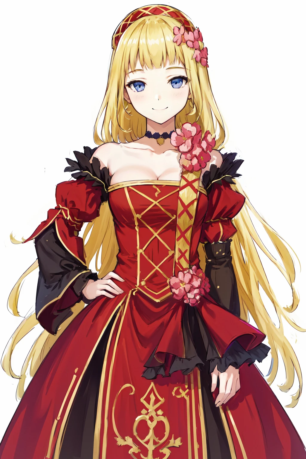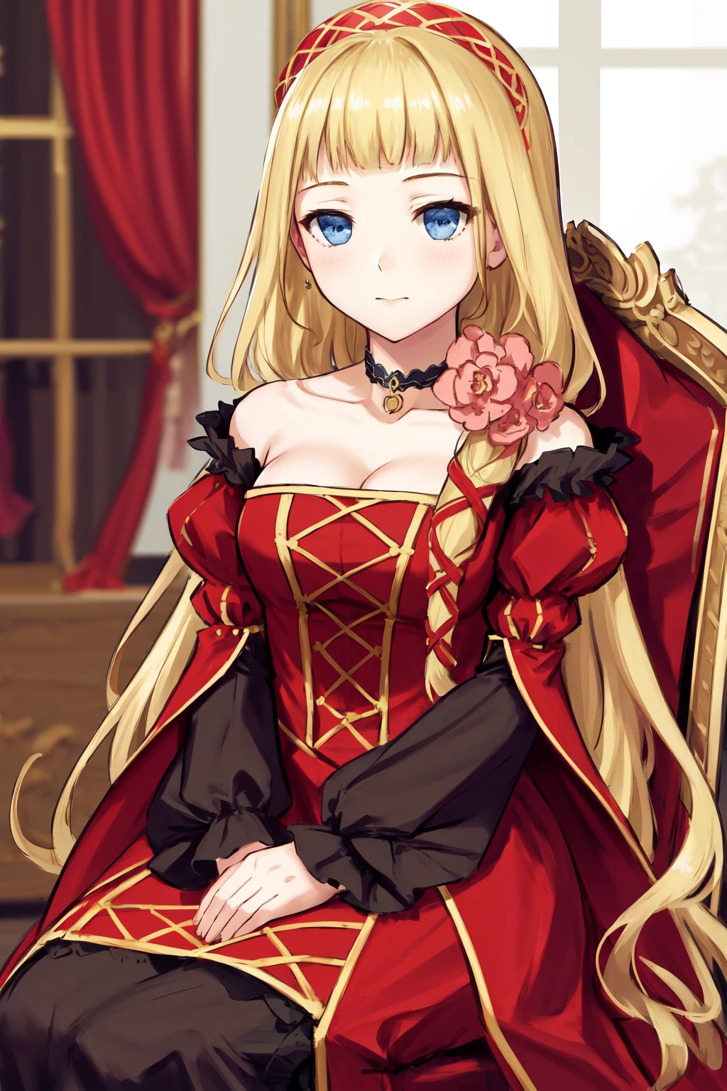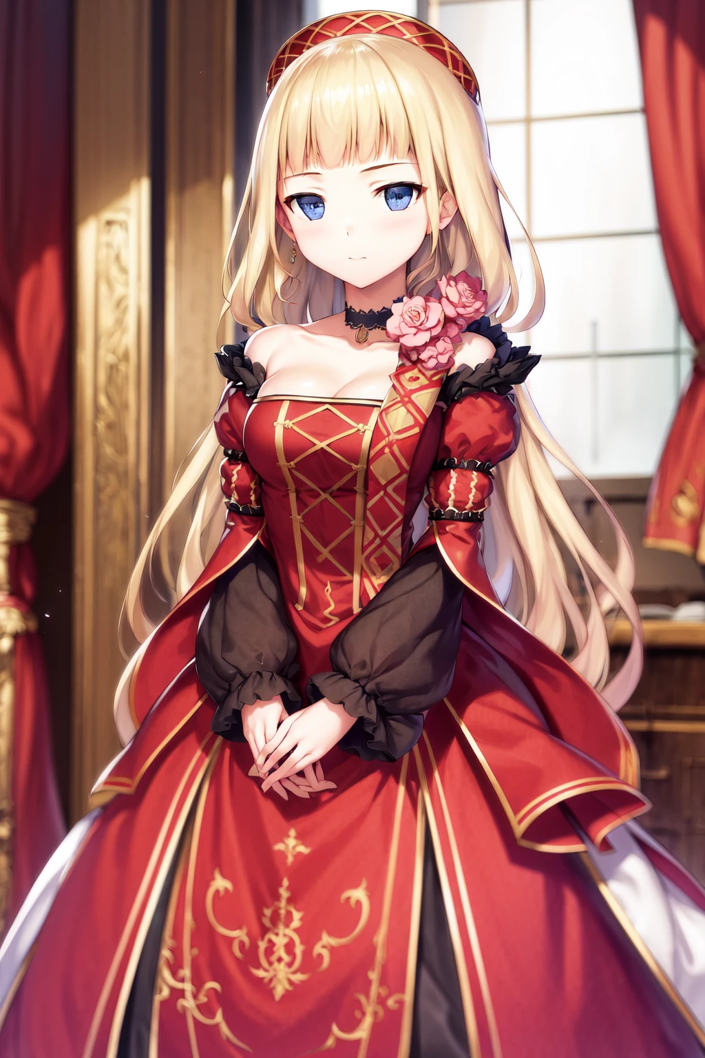 Default outfit: choker flower red dress bare shoulders puffy sleeves juliet sleeves