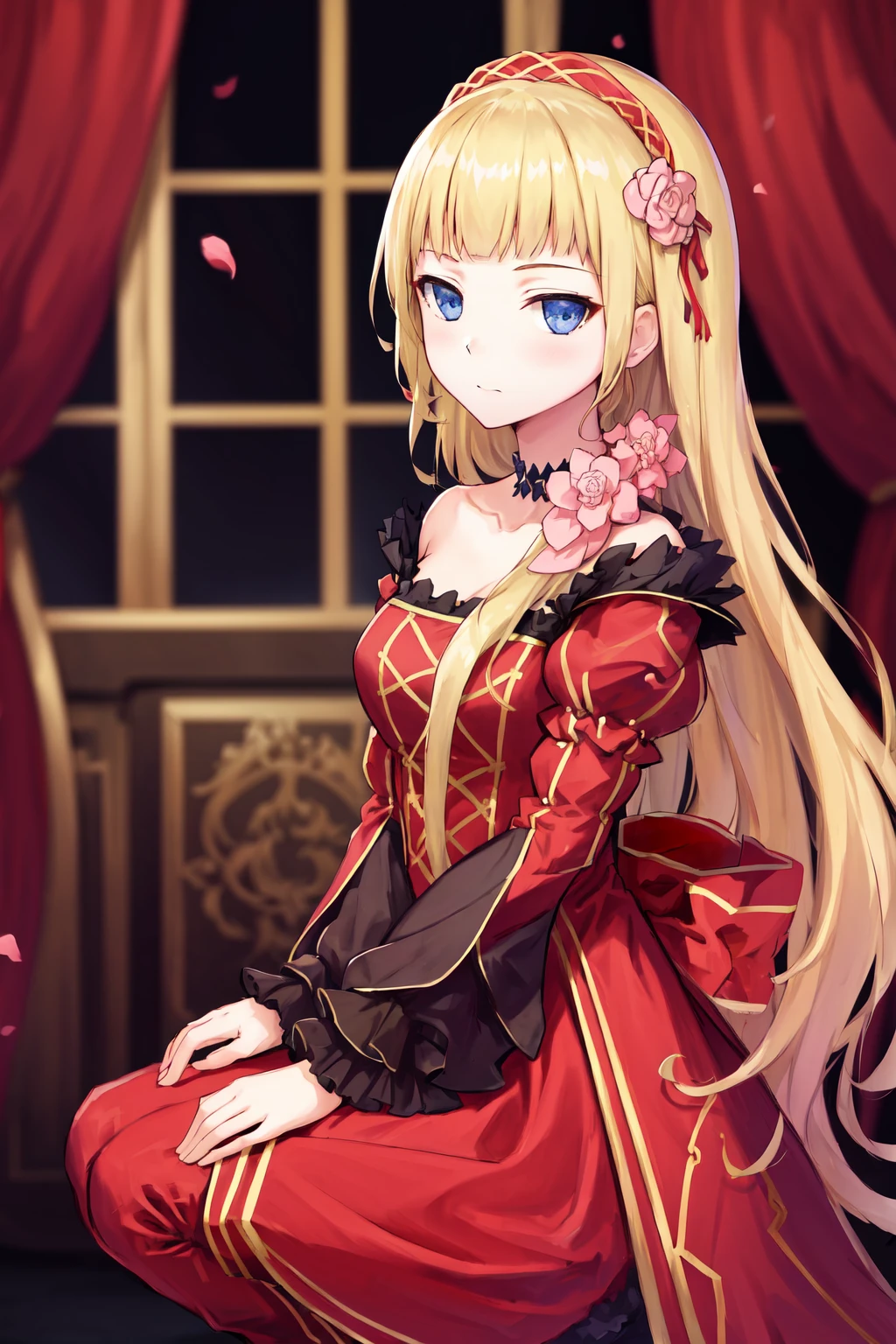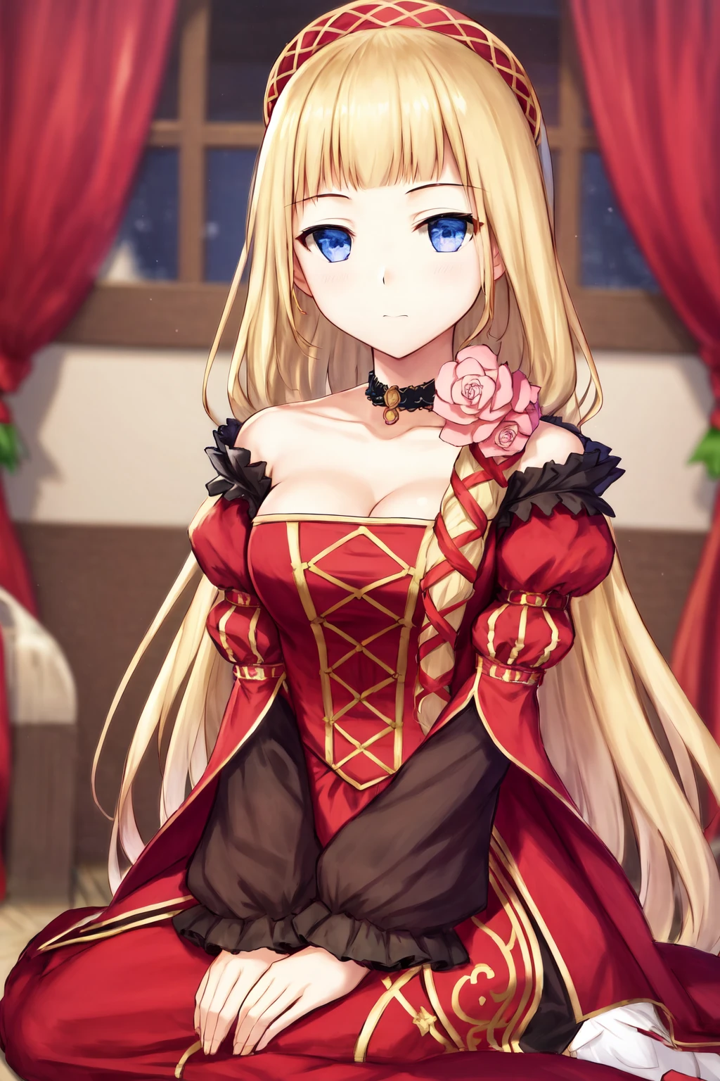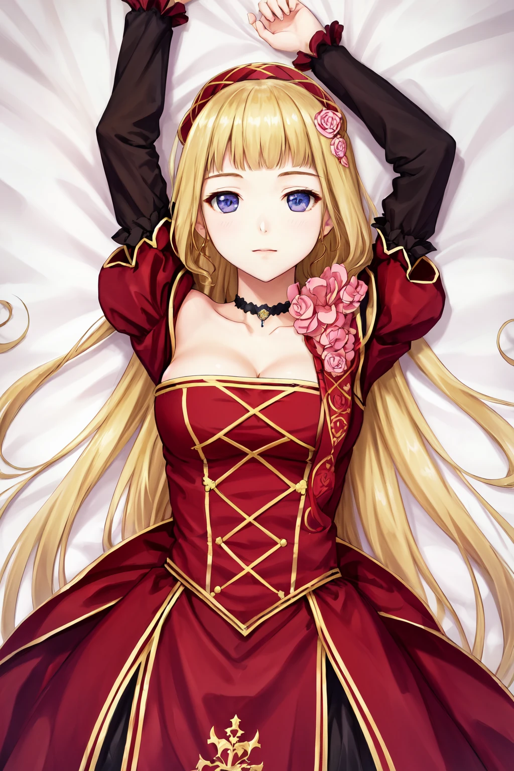 Default outfit: choker flower red dress bare shoulders puffy sleeves juliet sleeves