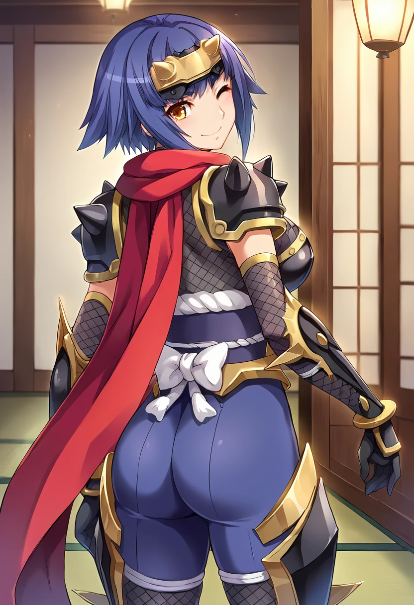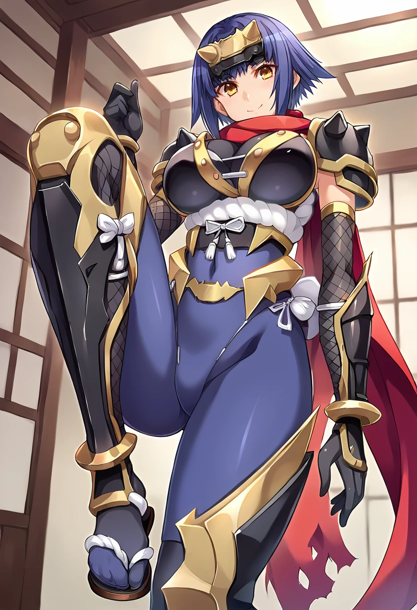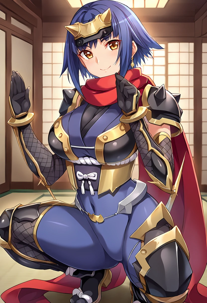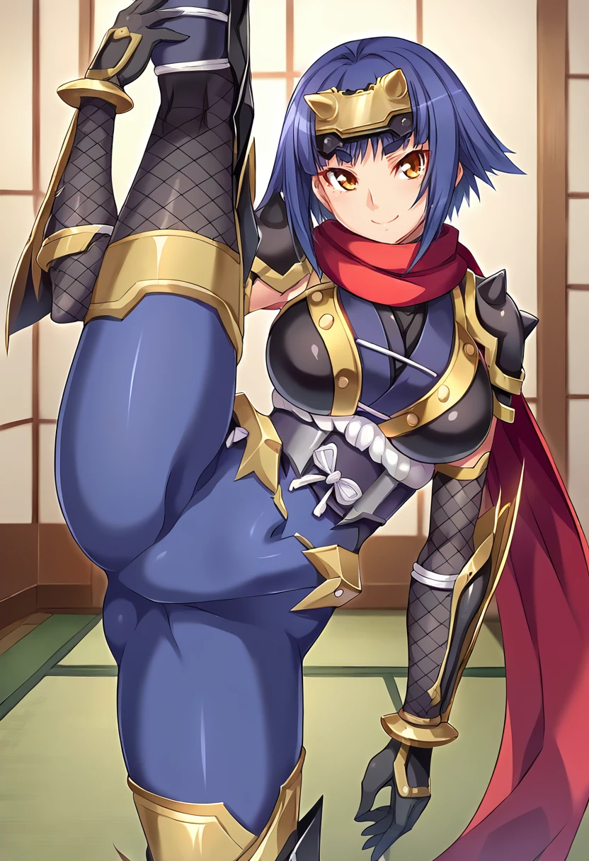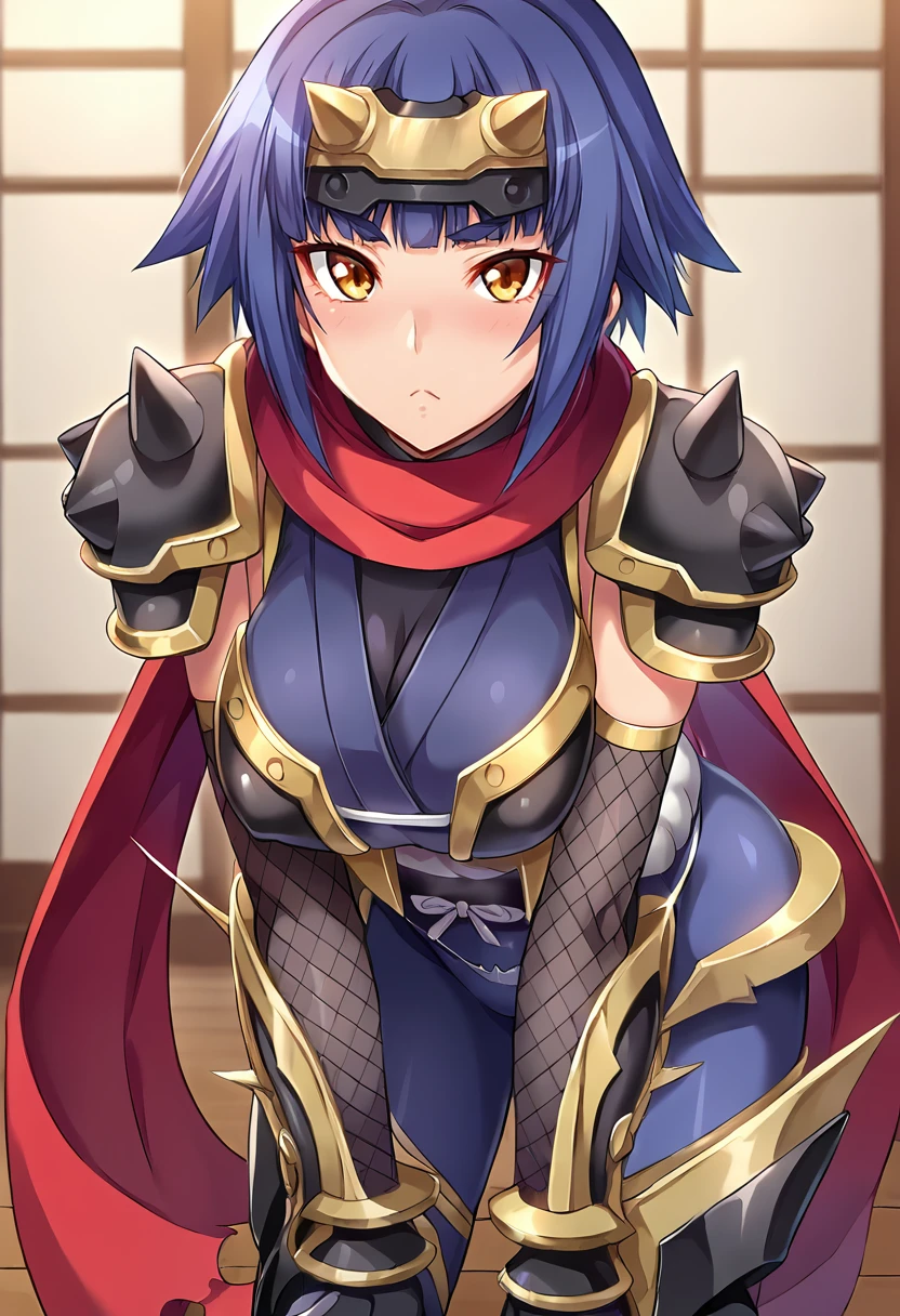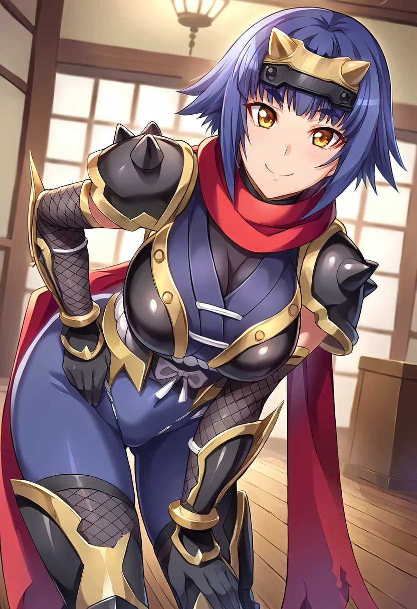 score_9, score_8_up, score_7_up, source_anime, masterpiece BREAK ct_k4guya, blue hair, short hair, large breasts, forehead protector, red scarf, blue bodysuit, armor, obi, shoulder armor, fishnets, elbow gloves, vambraces, greaves, looking at viewer, indoors, wooden floor, cowboy shot, leaning forward,Negative prompt ❌: