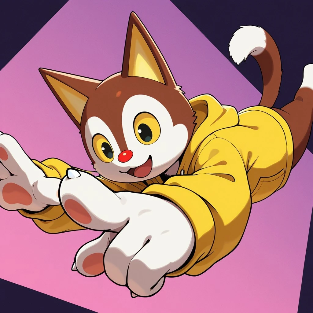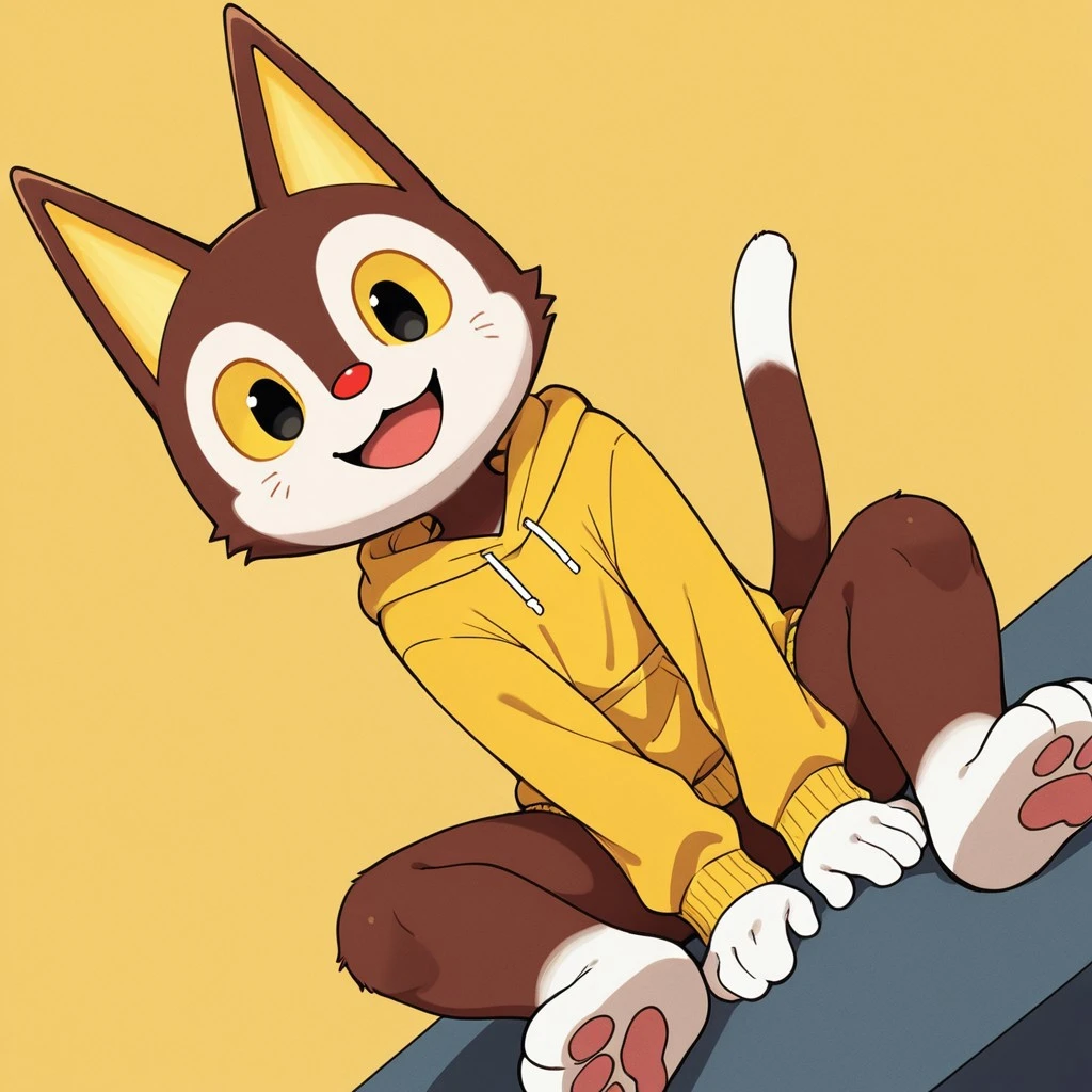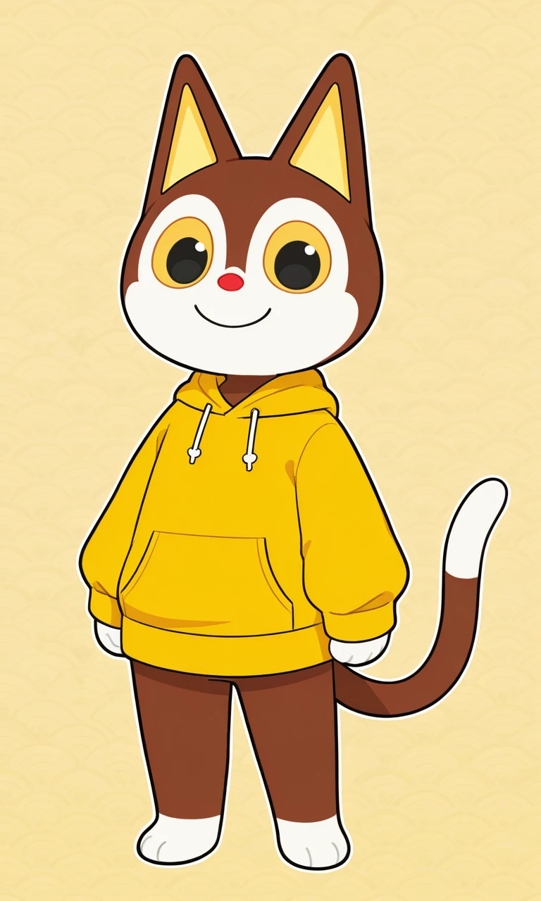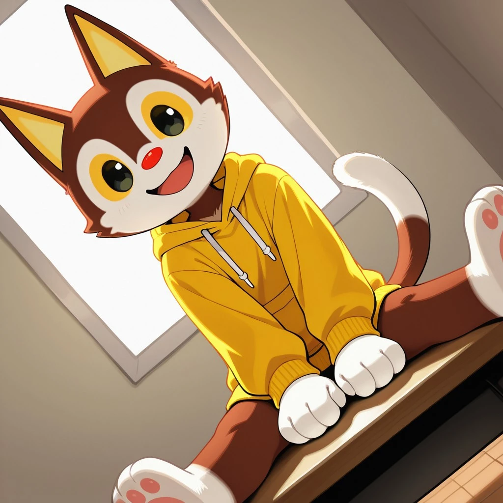 solo,male,anthro cat,brown fur,brown body,white face,white hands,white paws,red nose,yellow sclera,black eyes,yellow inner ears,yellow hoodie,cat tail,white tip tail,