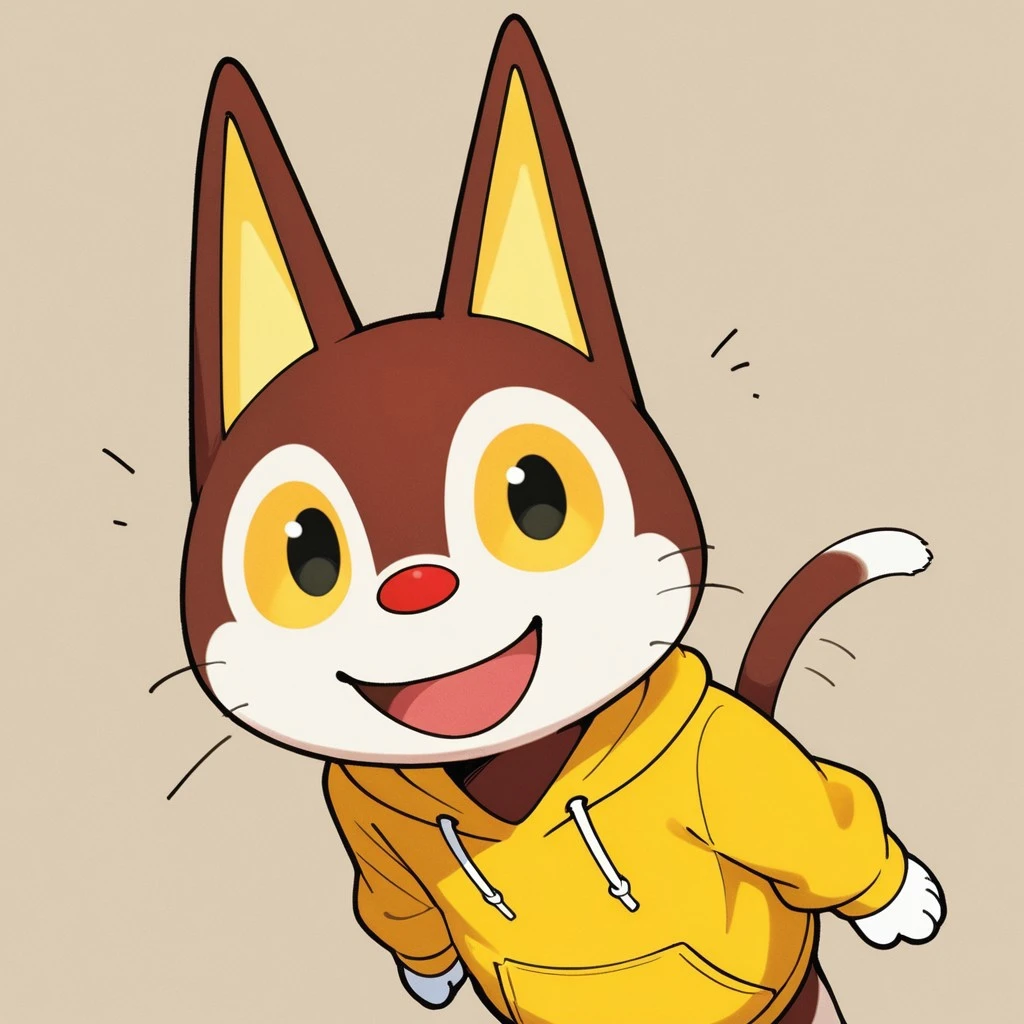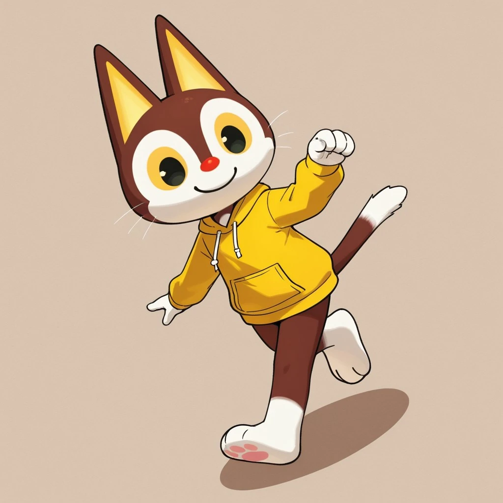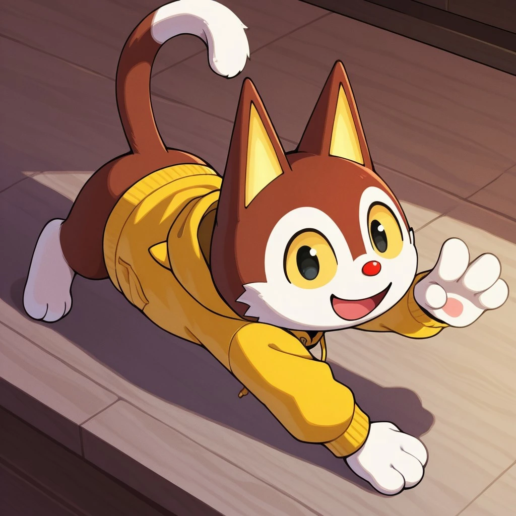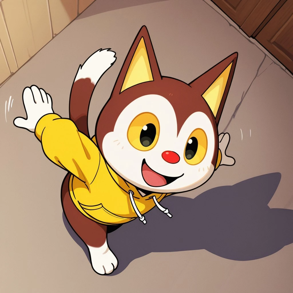 solo,male,anthro cat,brown fur,brown body,white face,white hands,white paws,red nose,yellow sclera,black eyes,yellow inner ears,yellow hoodie,cat tail,white tip tail,