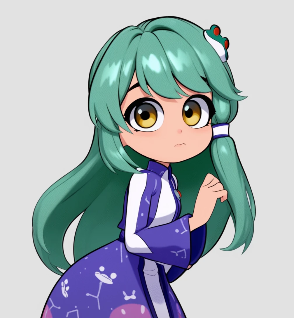 sanae, 1girl, yellow eyes, green hair, frog hair ornament, purple dress