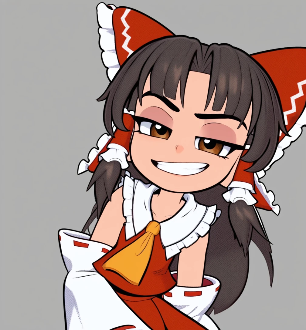 reimu, 1girl, brown eyes, brown hair, long hair, red dress, frills