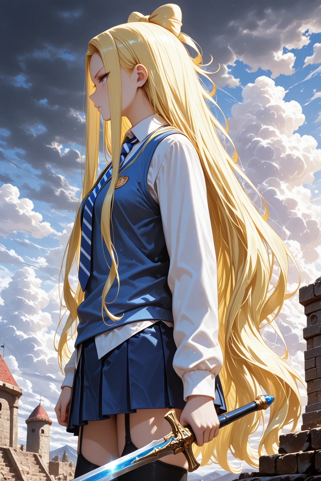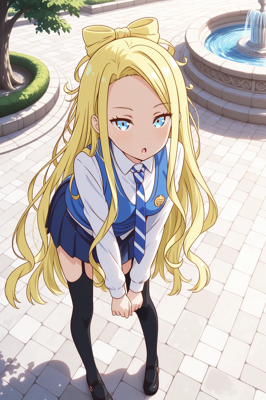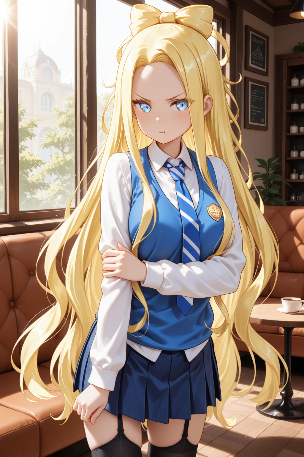 P_Arthur, blonde hair, very long hair, bow-shaped hair, blue eyes, school uniform, white shirt, collared shirt, striped necktie, blue vest, long sleeves, untucked shirt, blue skirt, pleated skirt, zettai ryouiki, black garter straps, black thighhighs