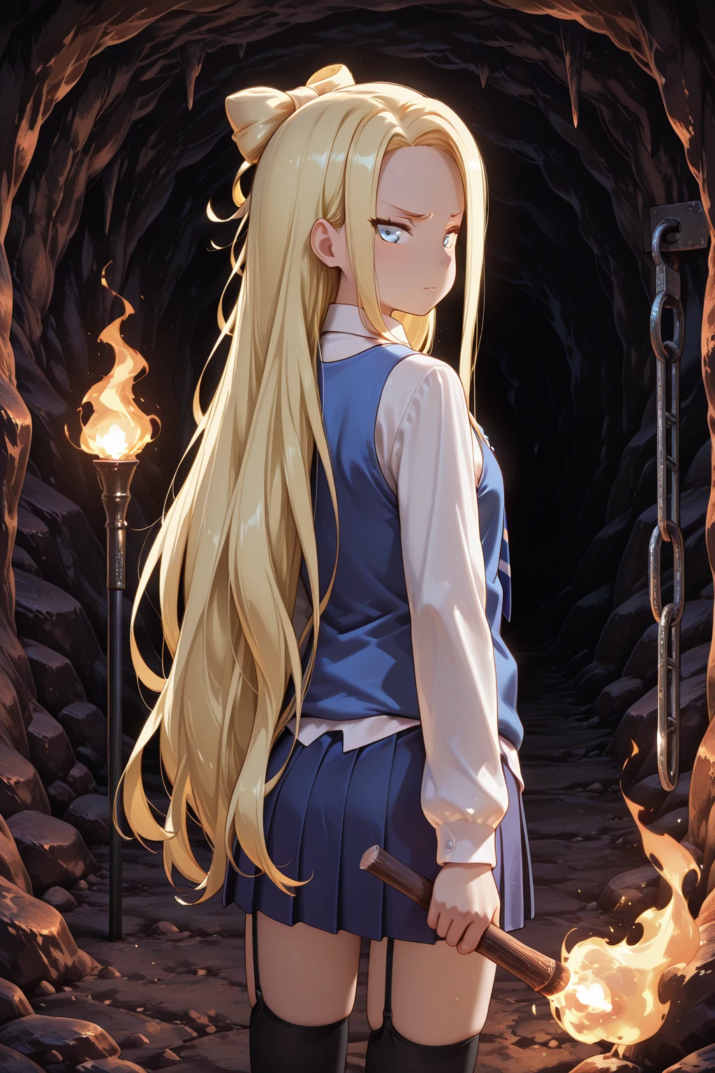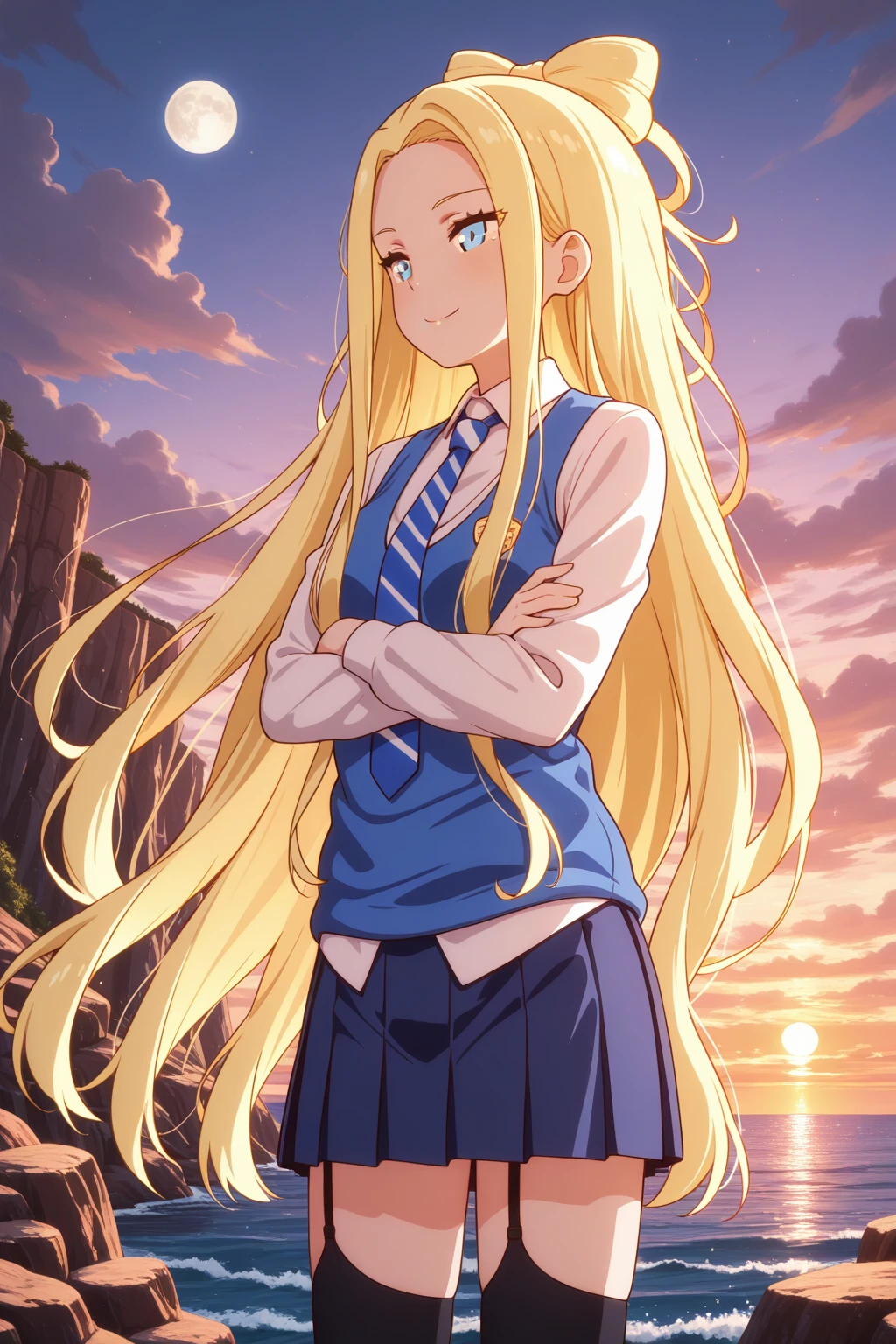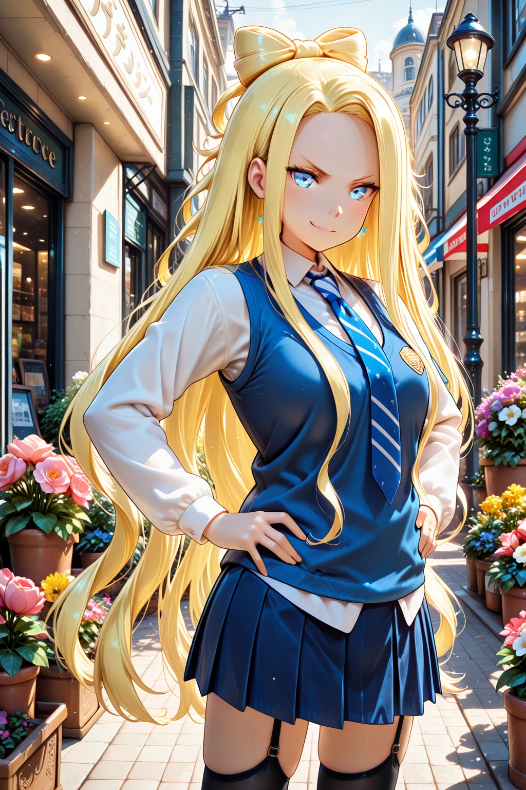 トリガーワード:P_Arthur, blonde hair, very long hair, bow-shaped hair, blue eyes, school uniform, white shirt, collared shirt, striped necktie, blue vest, long sleeves, untucked shirt, blue skirt, pleated skirt, zettai ryouiki, black garter straps, black thighhighs追加:black mary janes