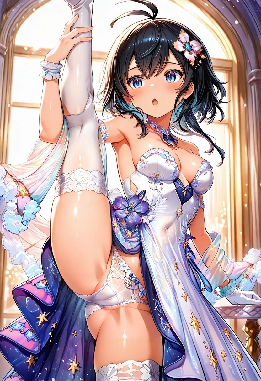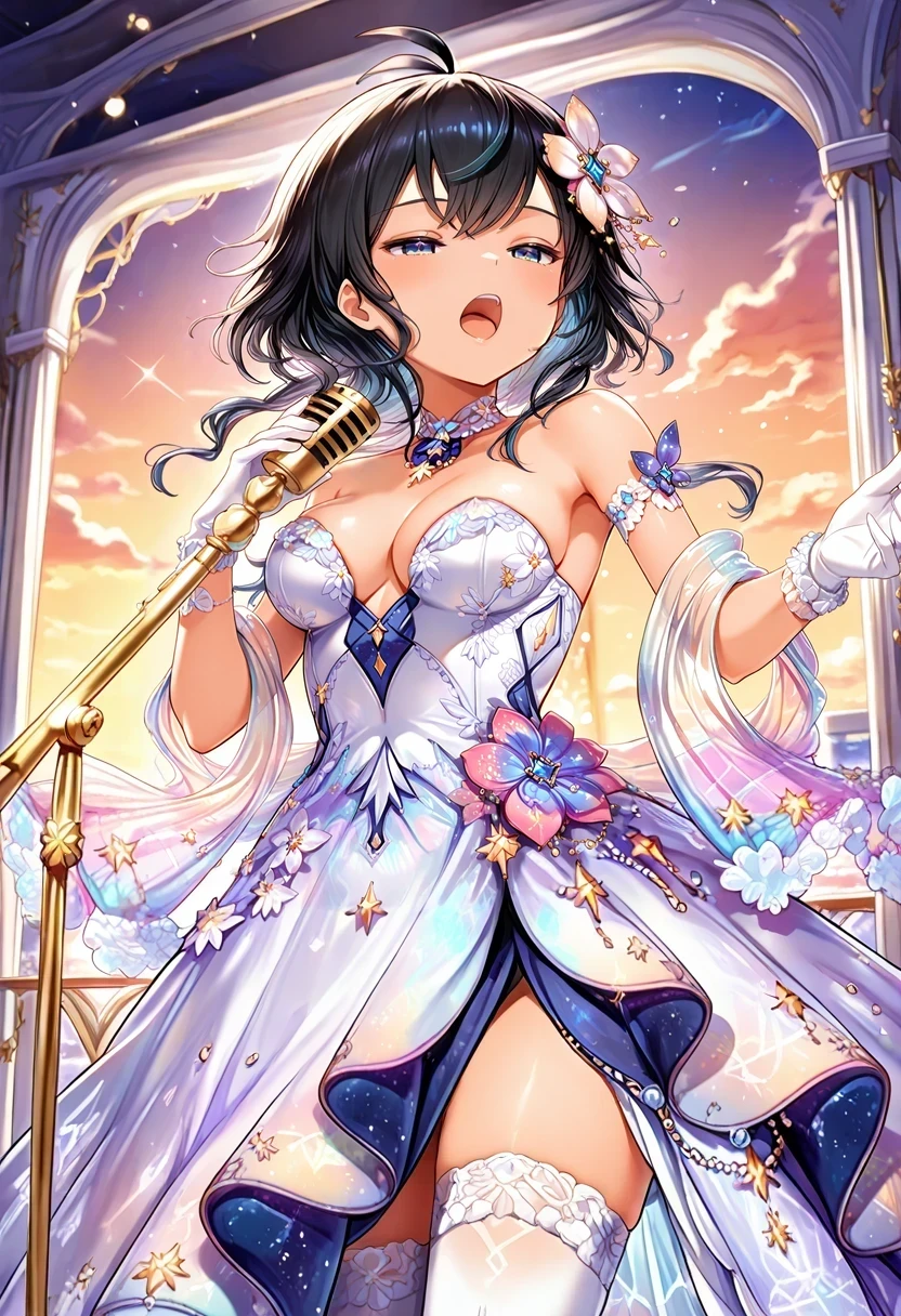 evening gown,two-tone gown,sideless outfit,strapless dress,see-through shawl,Description