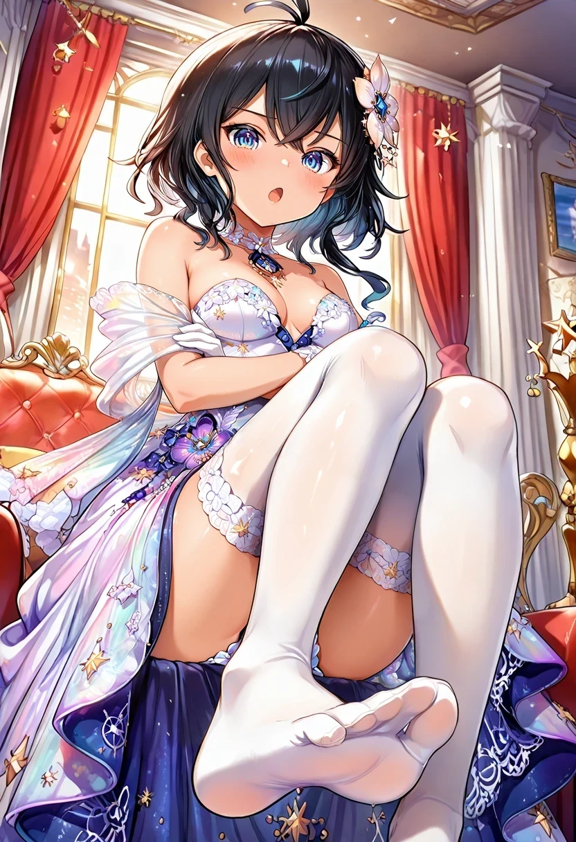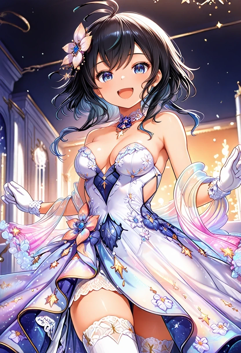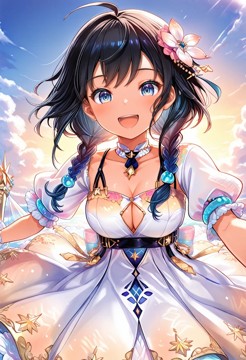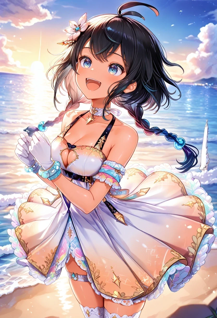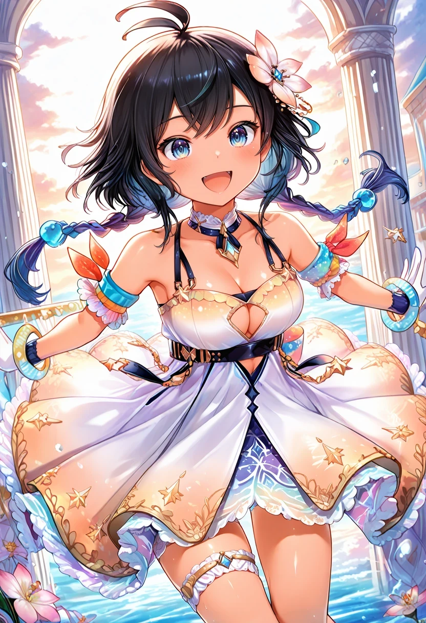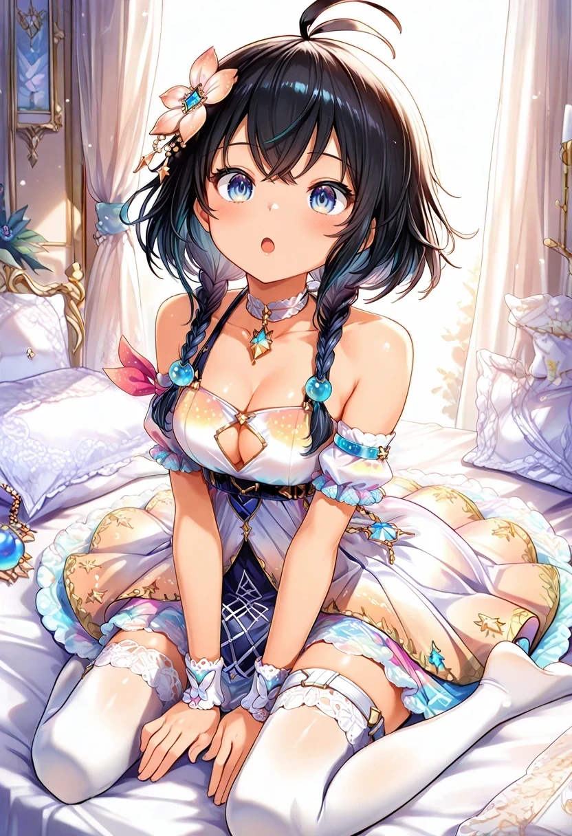 twin braids,bare shoulders,multicolored dress,cleavage cutout,armband,thigh strap,white choker,Christmas Gown: