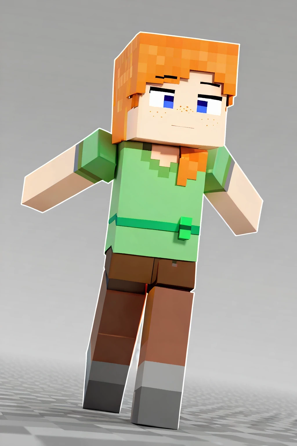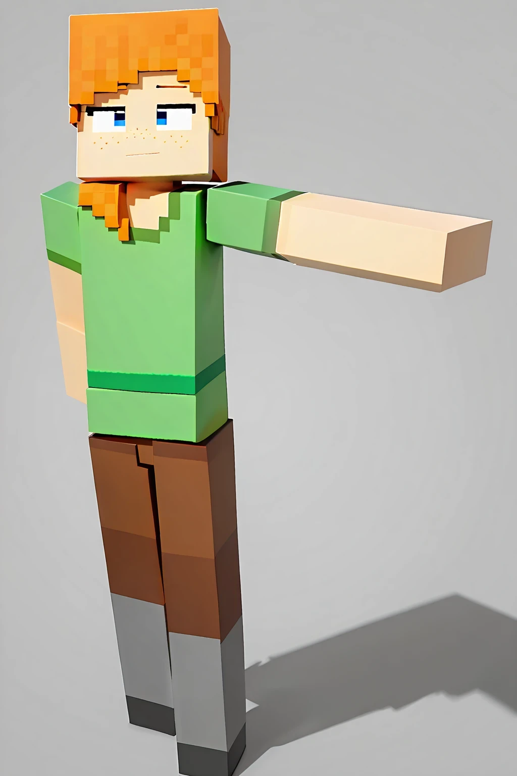 ZaminationAlex, 1girl, blue eyes, orange hair, long green shirt, brown pants, short sleeves, freckles, square arms, square body, green waist ribbon, alex (minecraft), minecraft (style)