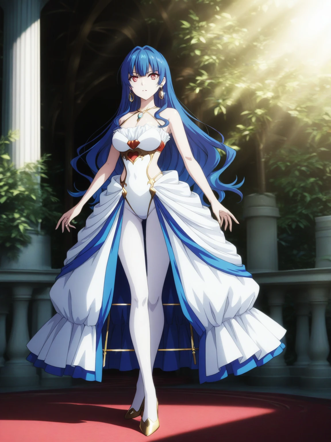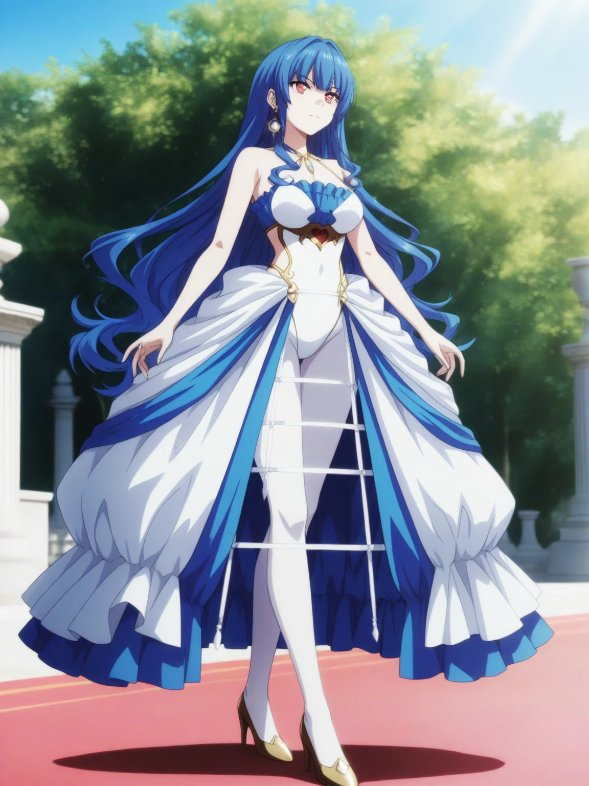 Clothes: leotard, bare shoulders, hoop skirt, white pantyhose, gold high heels