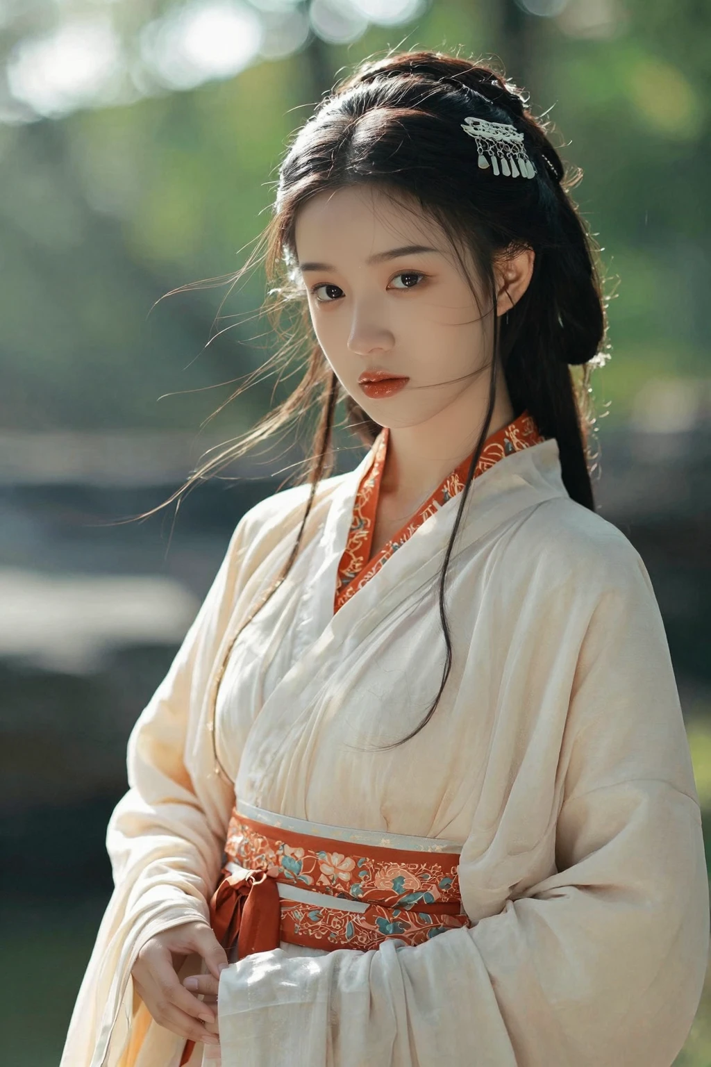 中国少女, wearing hanfu ZhanGuoPao_ZhiJu, 带红色边缘的简洁白色上衣, 渐变红色袖子, 带花纹的红色加橙色裙子, 白色系带