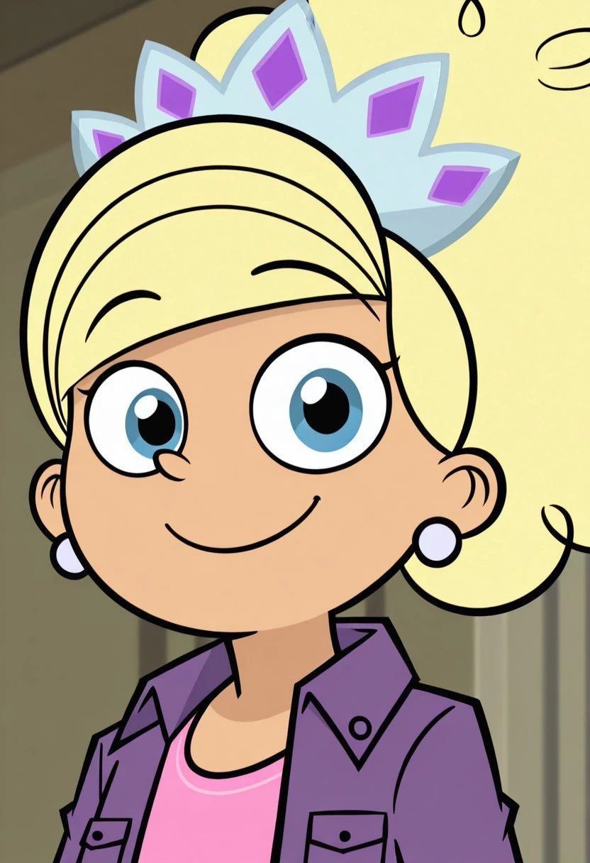 1girl, solo, br1annaB_IL, fair skin, small nose, blue eyes, blonde hair, puffed voluminous ponytail, tiara with purple gems, pearl earrings