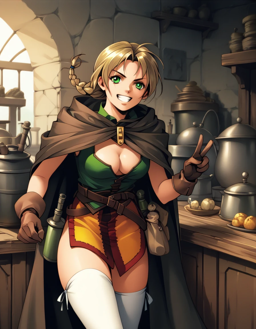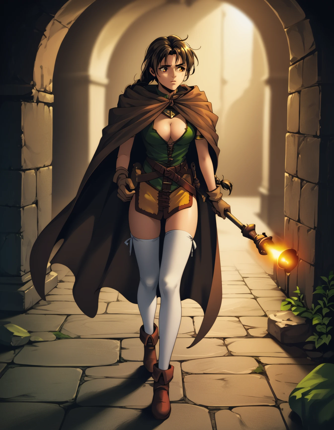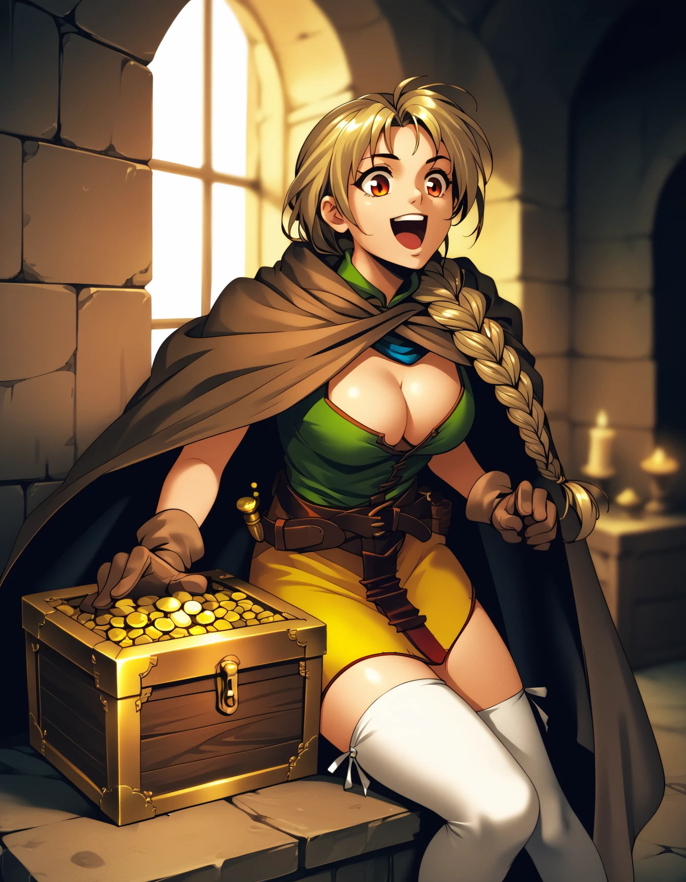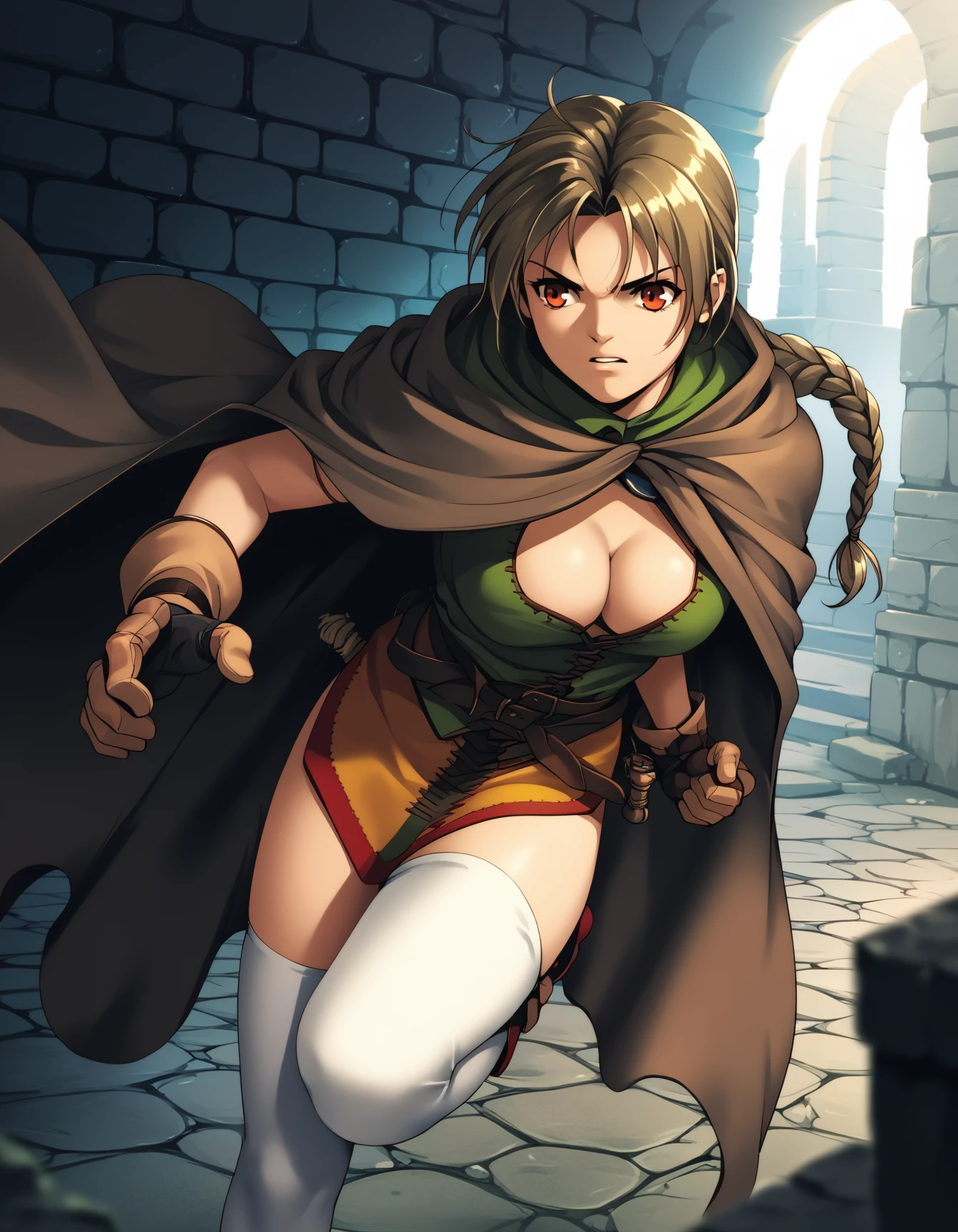 drkww, braid, cape, cleavage, bare arms, gloves, white thighhighs