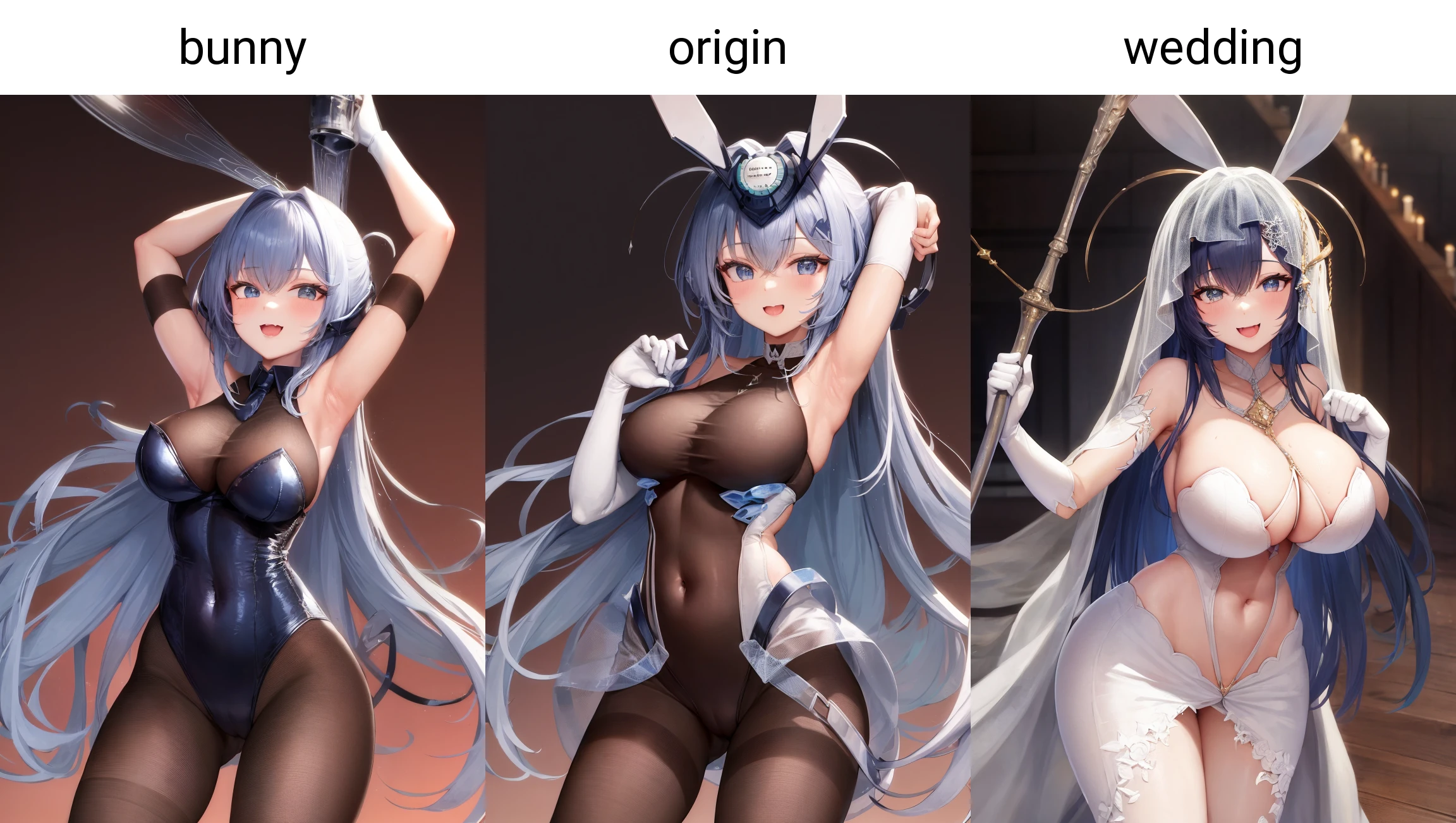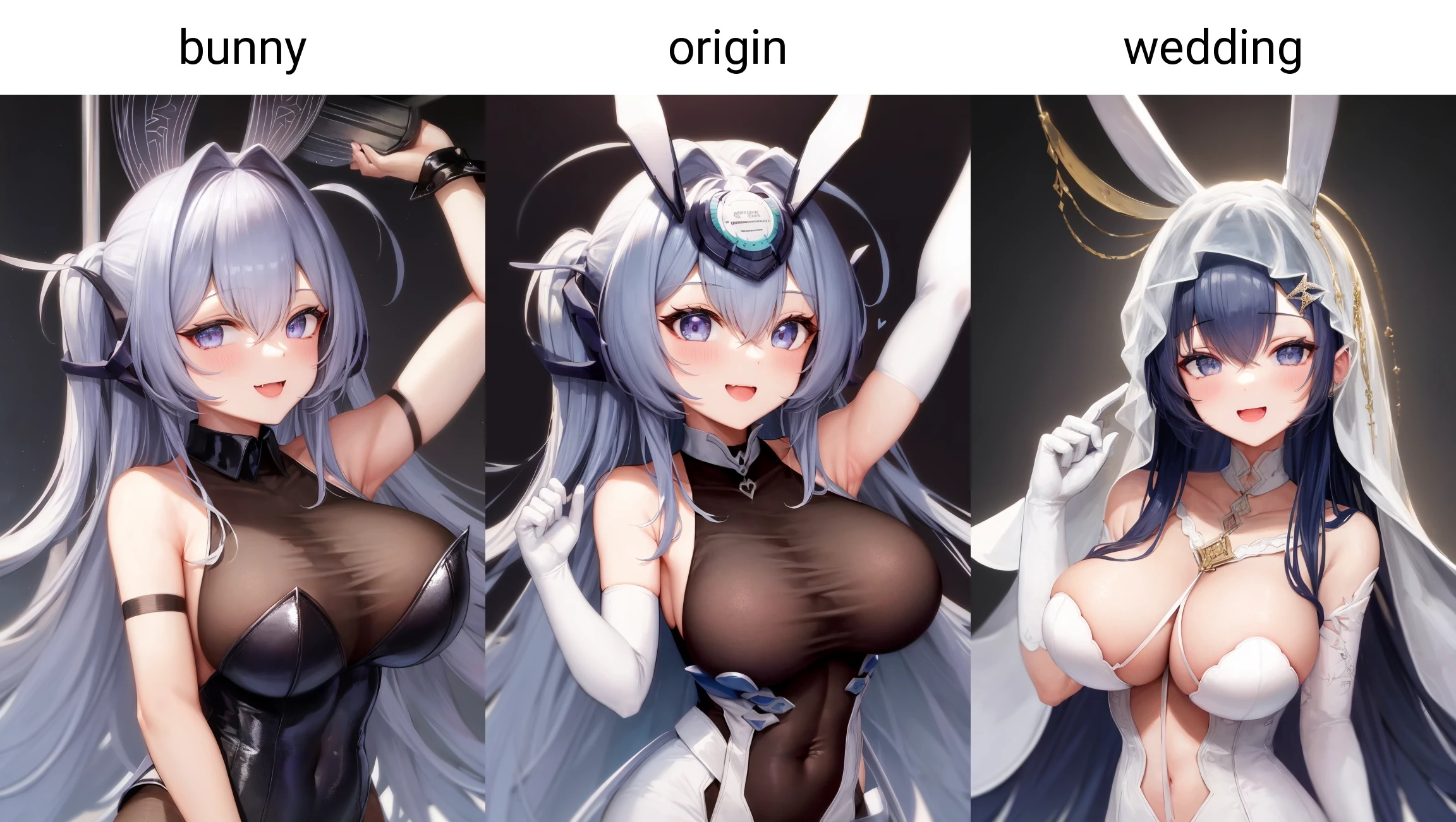 "new_jersey" for her face, "origin" for her normal clothes, "bunny" for her playboy bunnysuit, "wedding" for her wedding clothes.