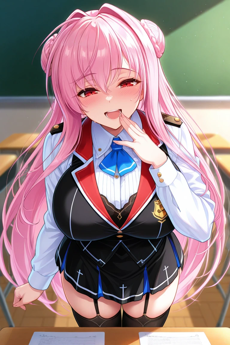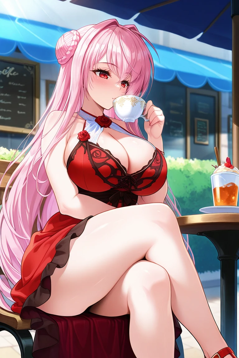 pink hair, very long hair, bangs, hair intakes, hair bun, double bun, red eyes, large breasts,