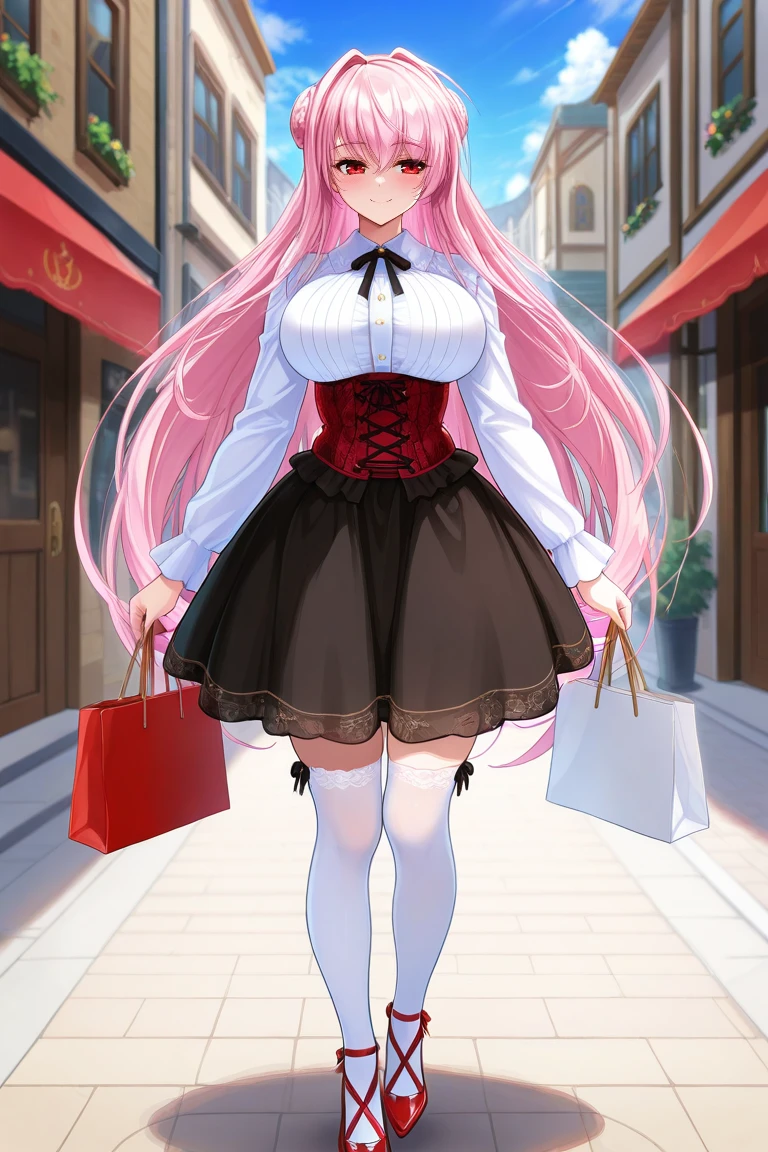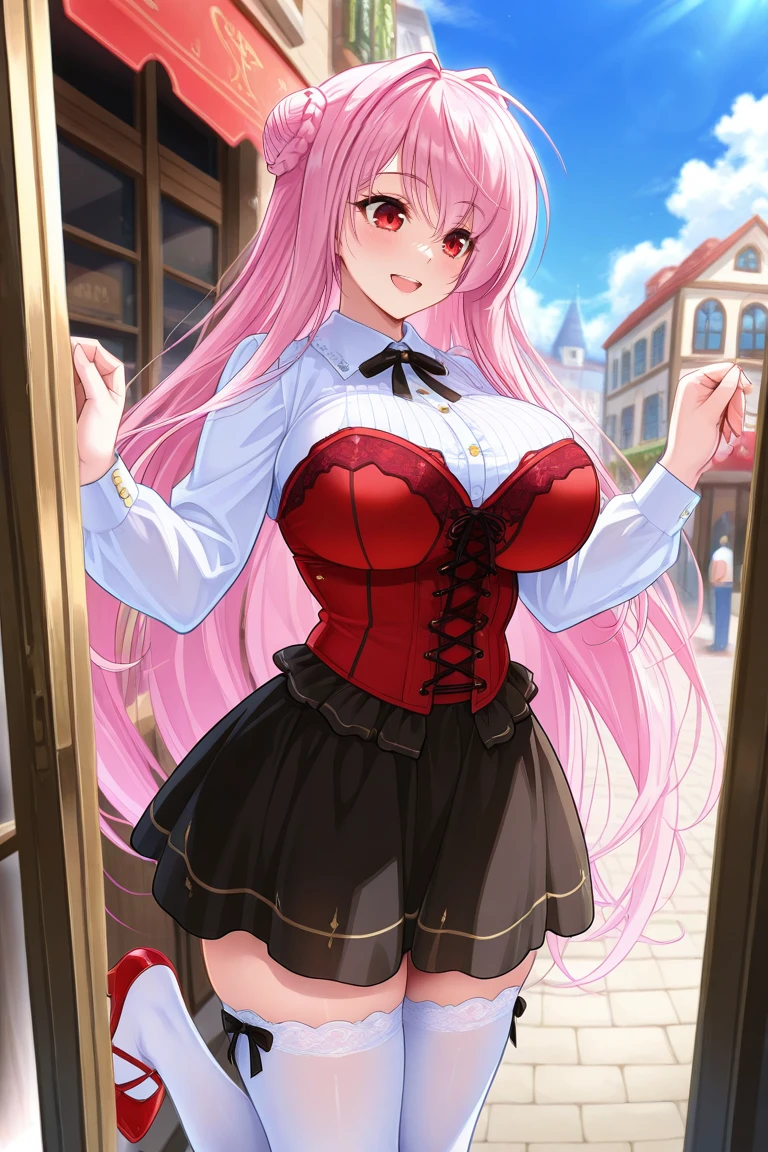 casual outfit, long sleeves, white shirt, red bustier, black skirt, white thighhighs, red high heels,