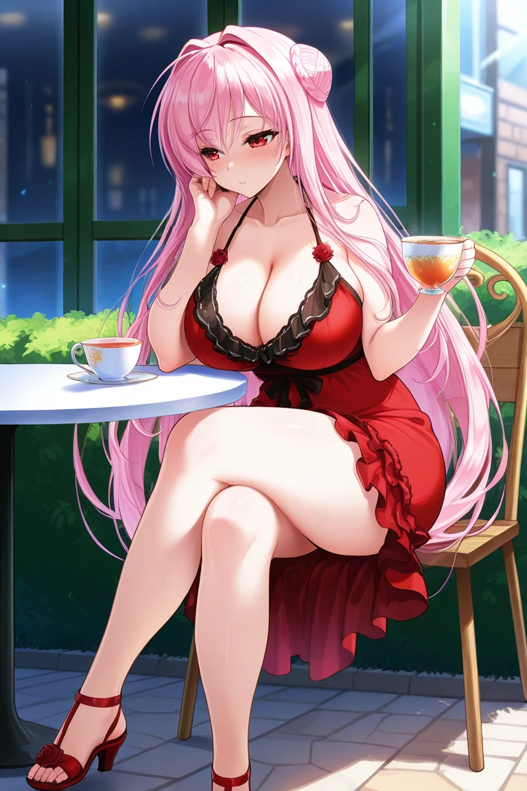 Summer outfit, red dress, white halterneck shirt, sleeveless, ruffled skirt, ribbon, roses, cleavage, sandals, high heels,