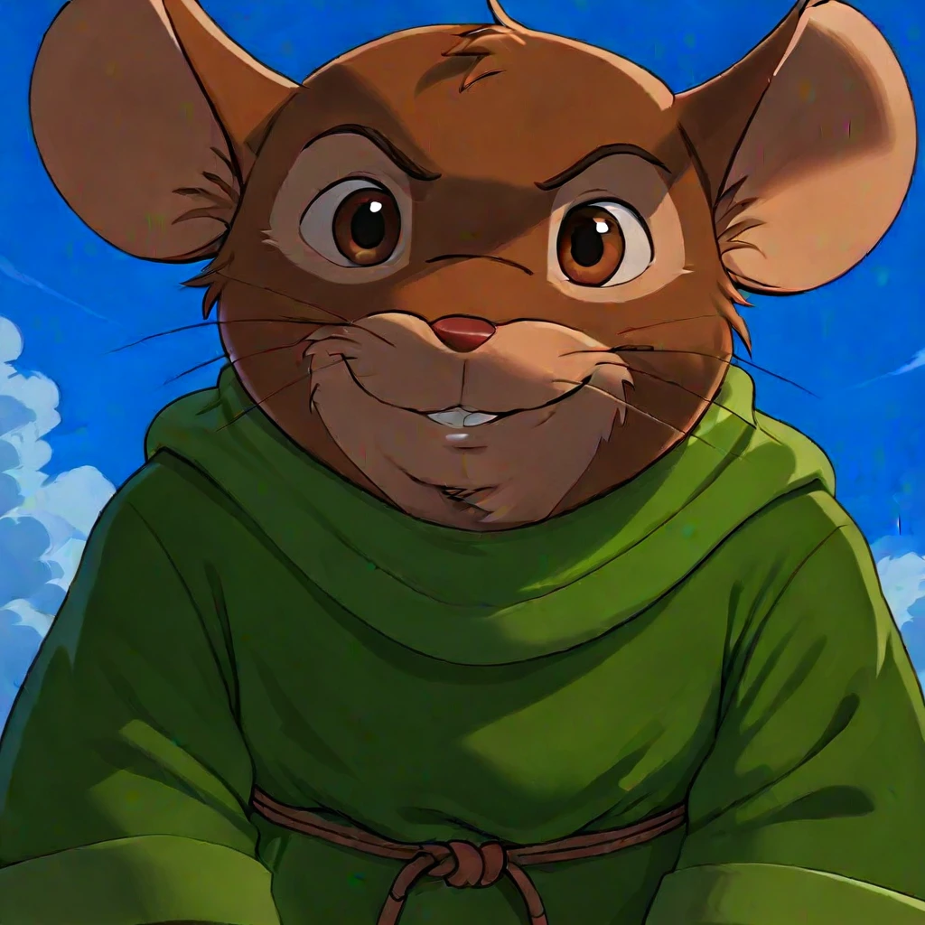 MatthiasRW, semi-anthro, male, mouse, brown fur,green robe, redwall, solo, identical , identical art style.
