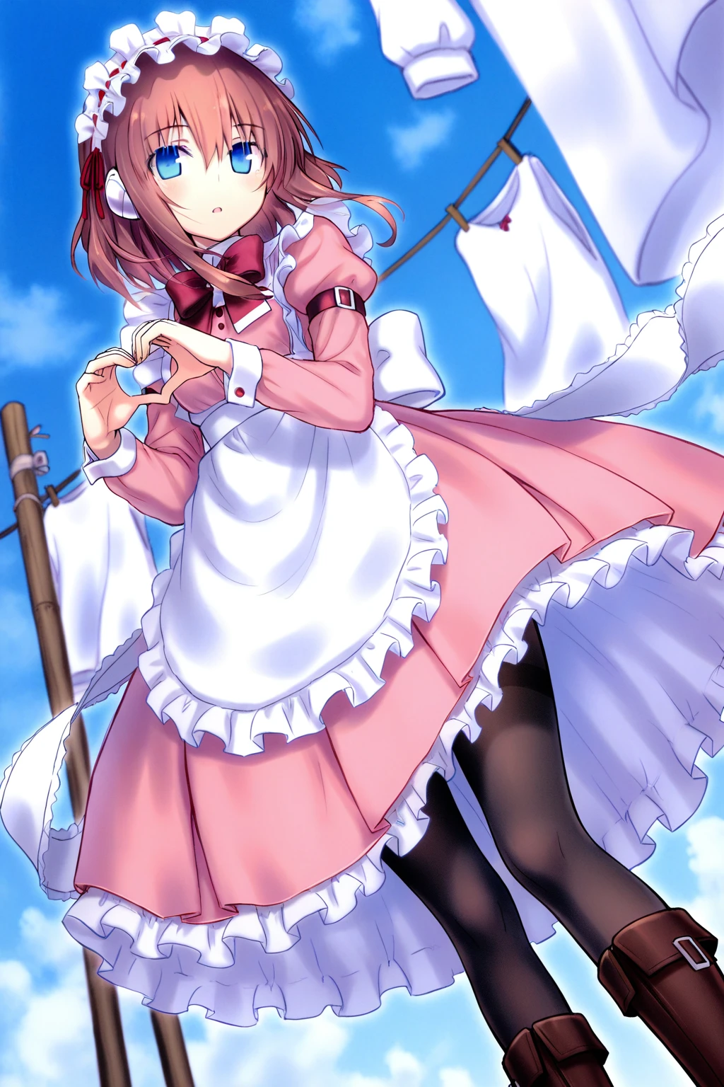 ame_irs, 1girl, solo, blue eyes, brown hair, short hair, hair flaps, small breasts, maid headdress, red hair ribbon, head phone, red bowtie, pink dress, long dress, puffy sleeves, long sleeves, white apron, white back bow, white ribbon, black pantyhose, boots,