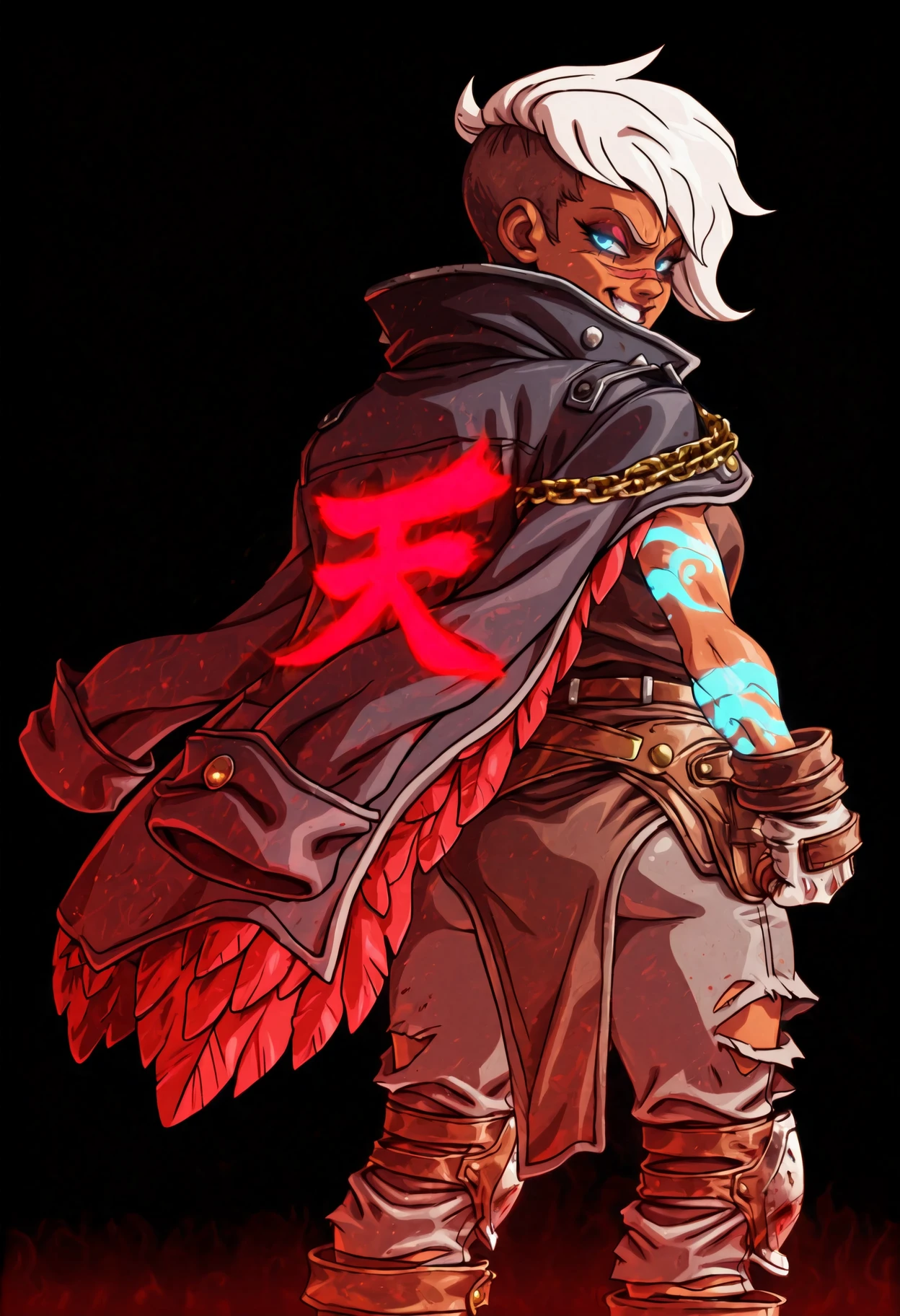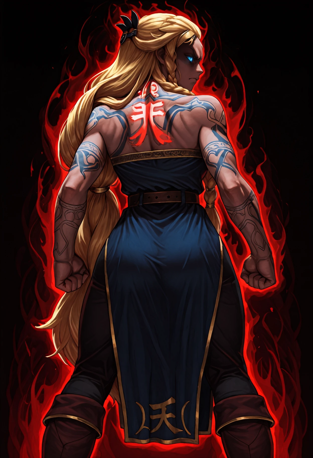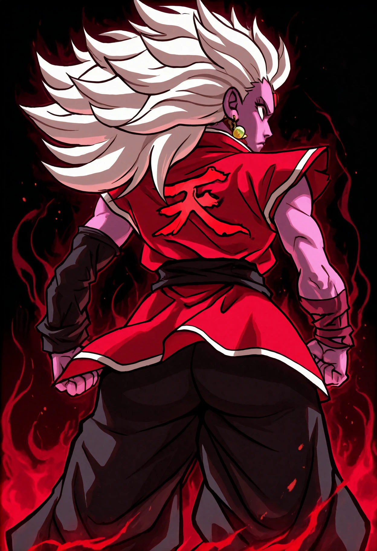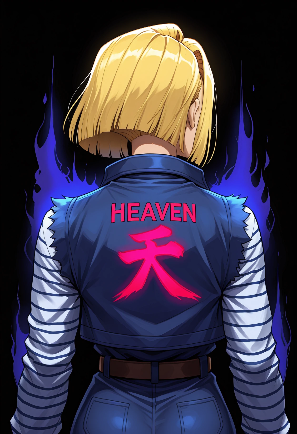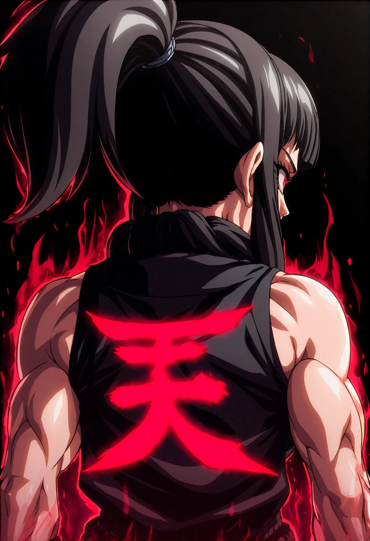 Main tags: shun goku satsu, heaven \(kanji\), clothes writing, ???????????, looking back, clenched hands, dark persona, dark aura, red aura